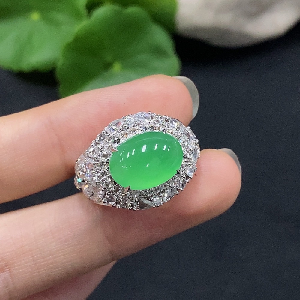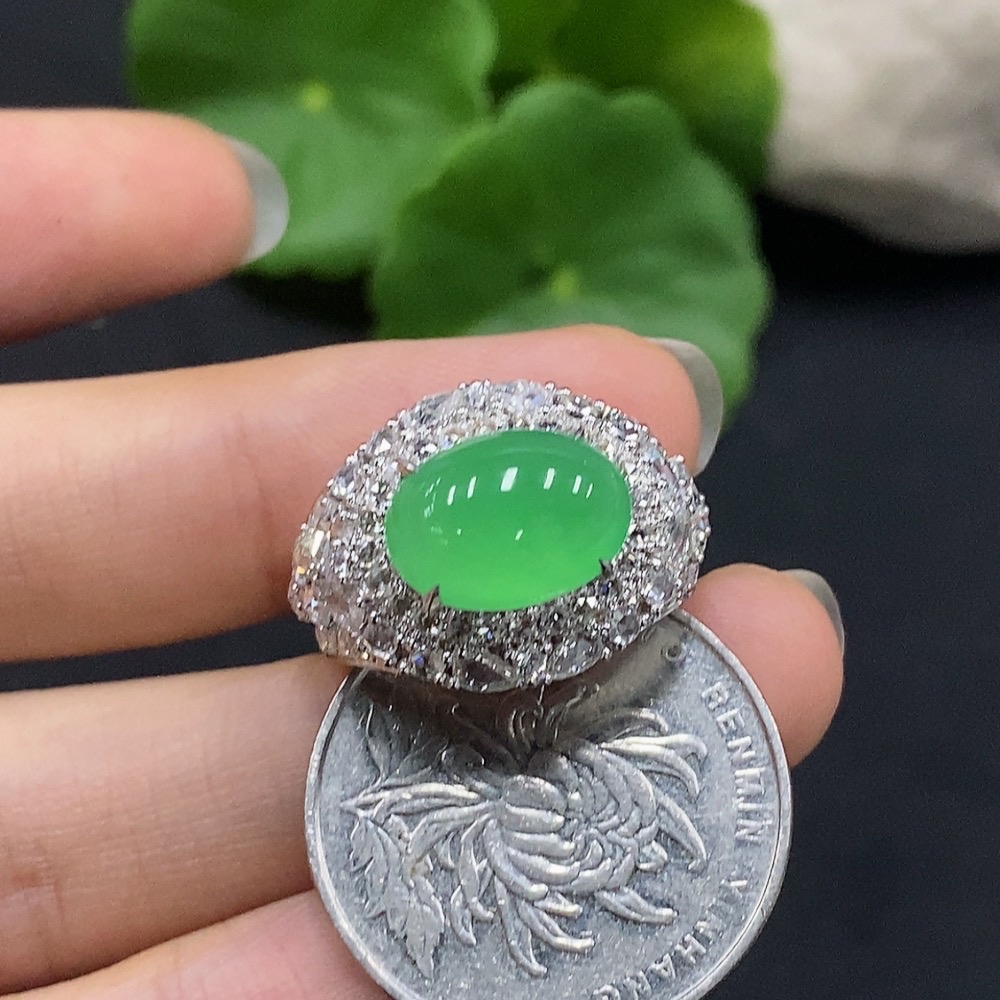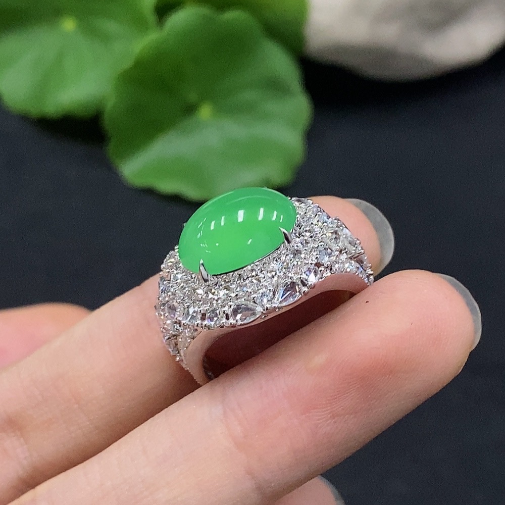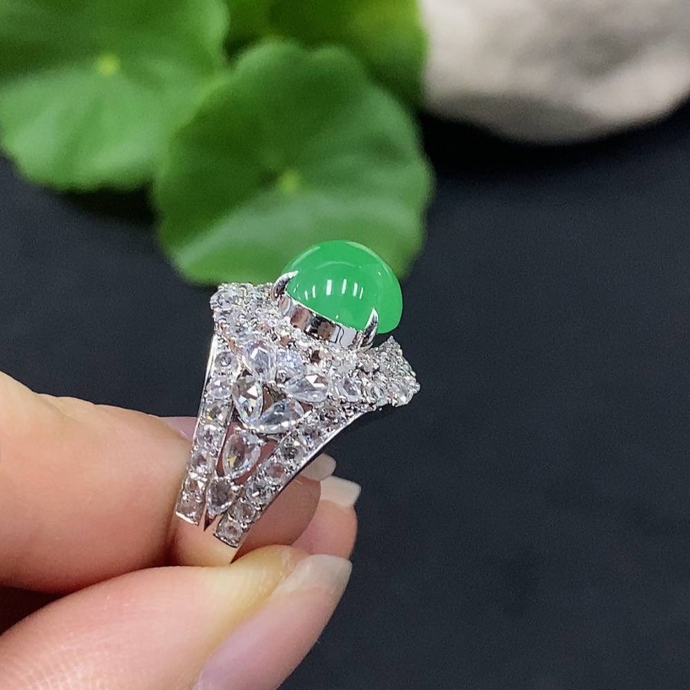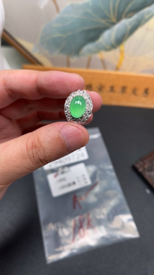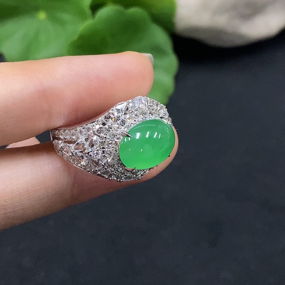Jadeite Cabochon Ring with 18K Gold, Size 15, Accented with Diamonds, Total Weight Approx. 7.7g