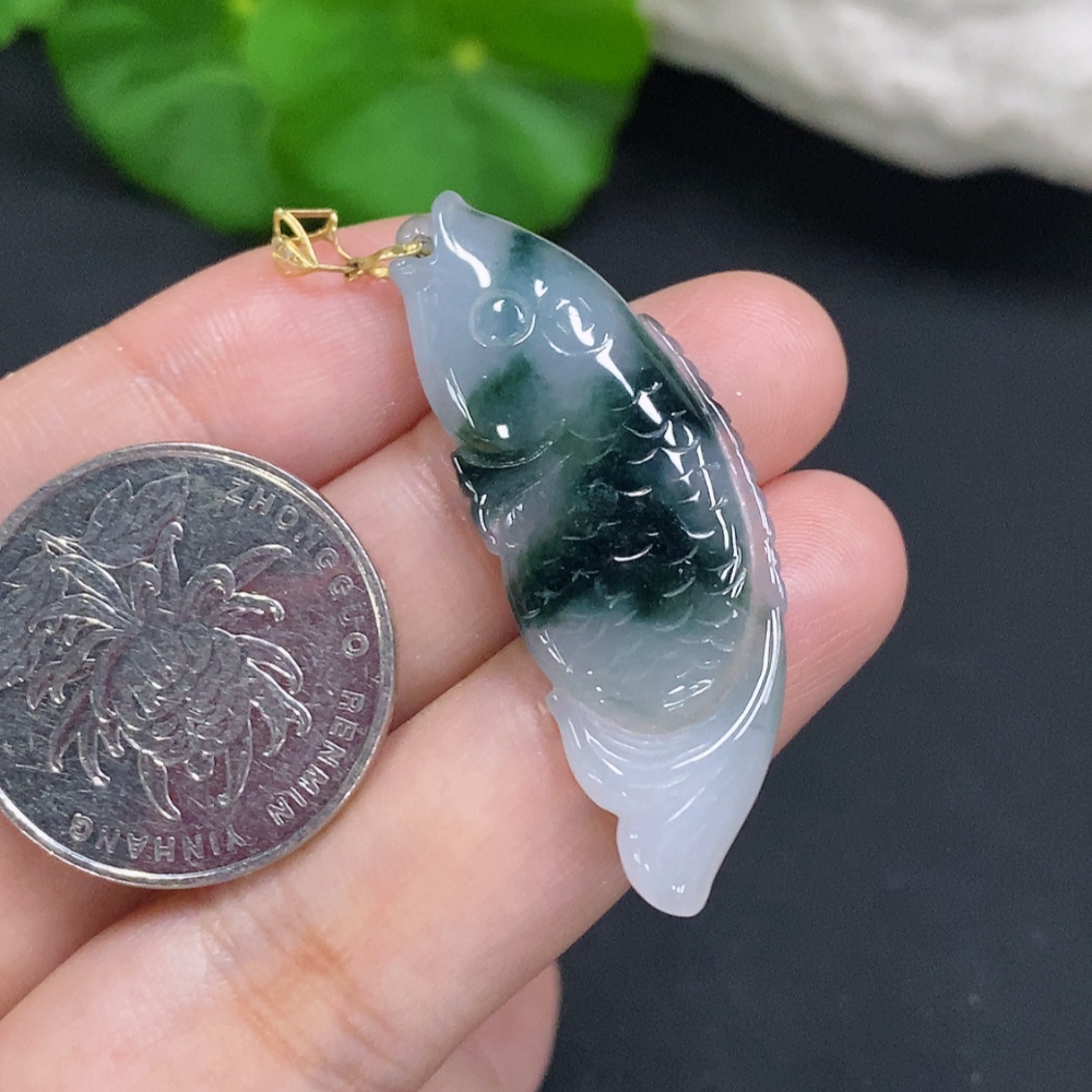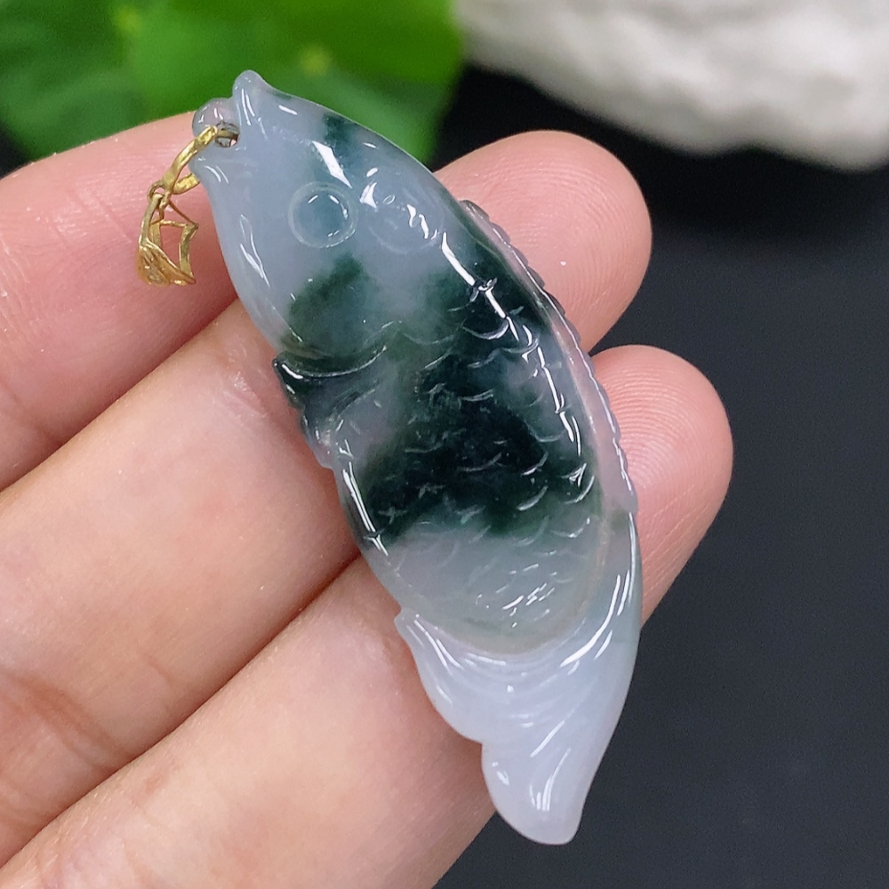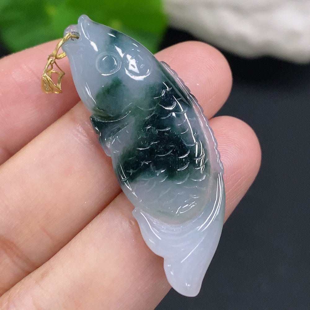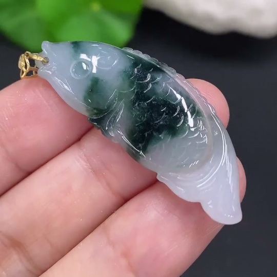 Jadeite Auspicious Fish Pendant with 18K Gold Clasp, Total Weight Approx. 4.8g