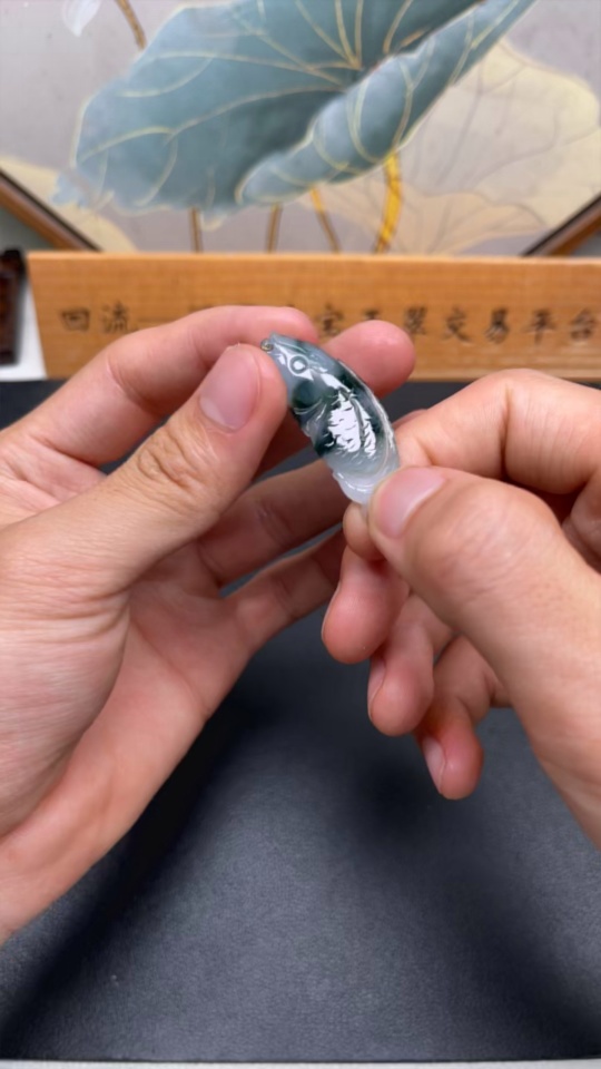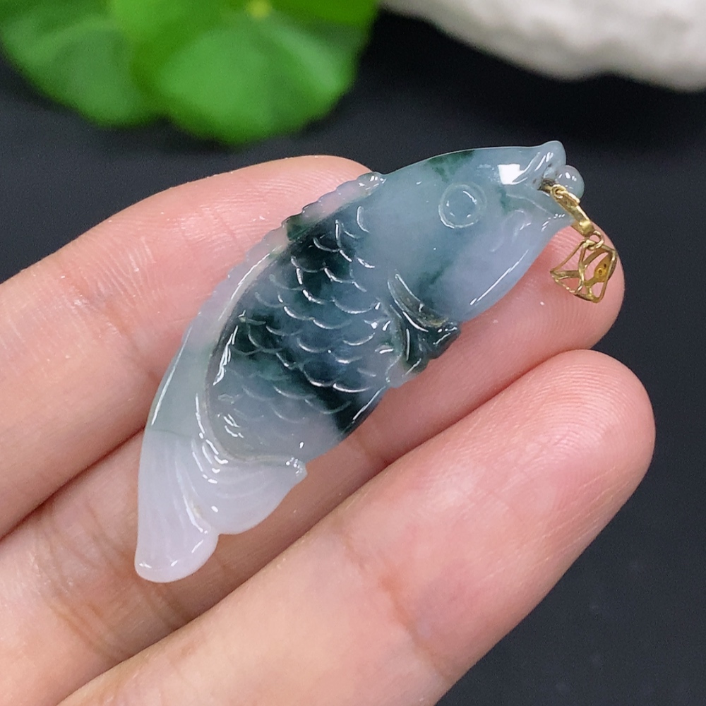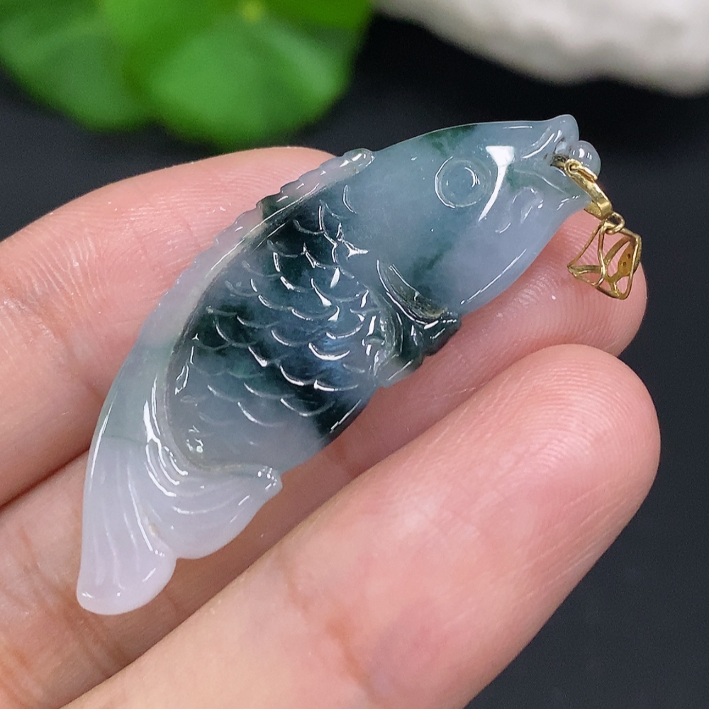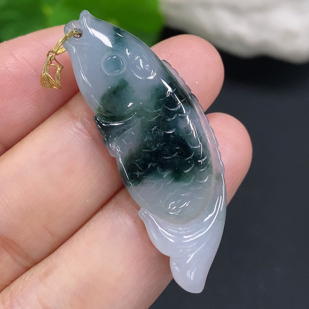 Jadeite Auspicious Fish Pendant with 18K Gold Clasp, Total Weight Approx. 4.8g