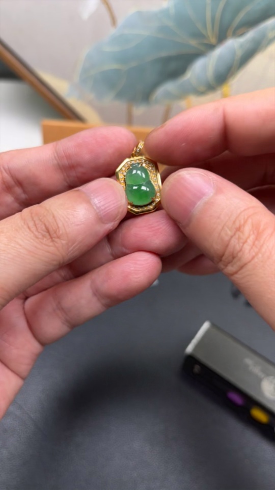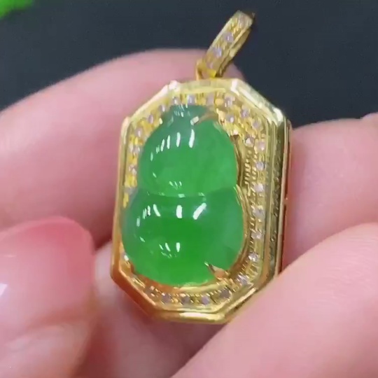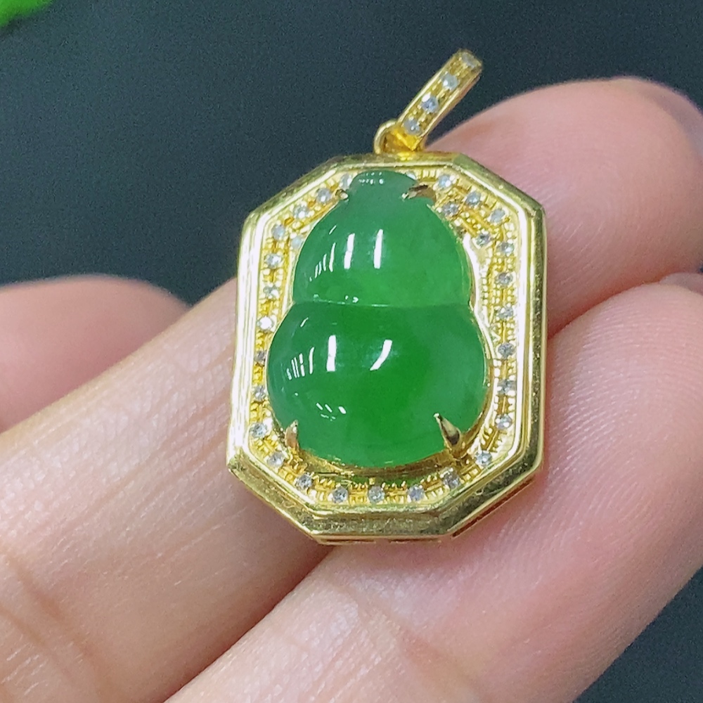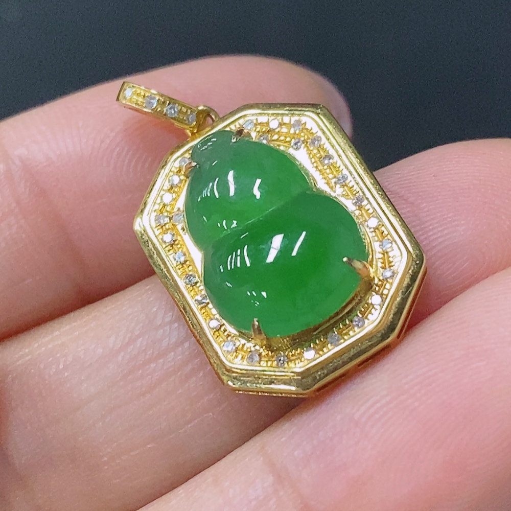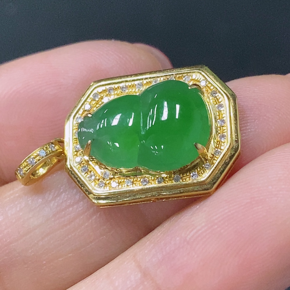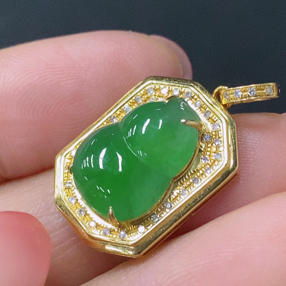 Jadeite Gourd Pendant with 18K Gold Setting, Total Weight Approx. 2.4g (Accented with Diamonds)