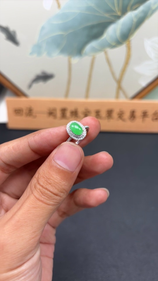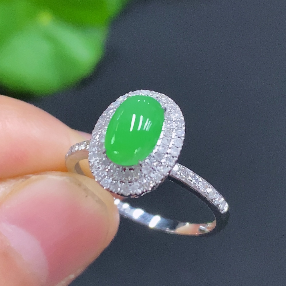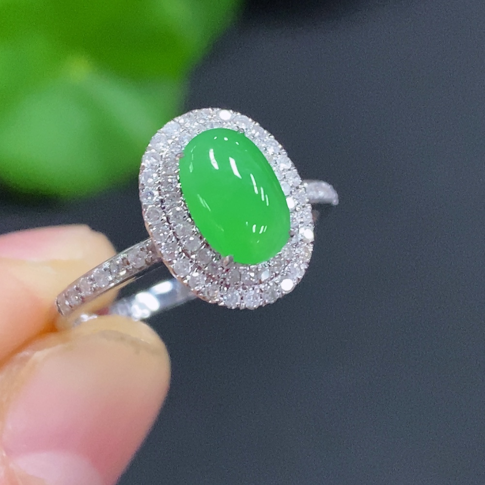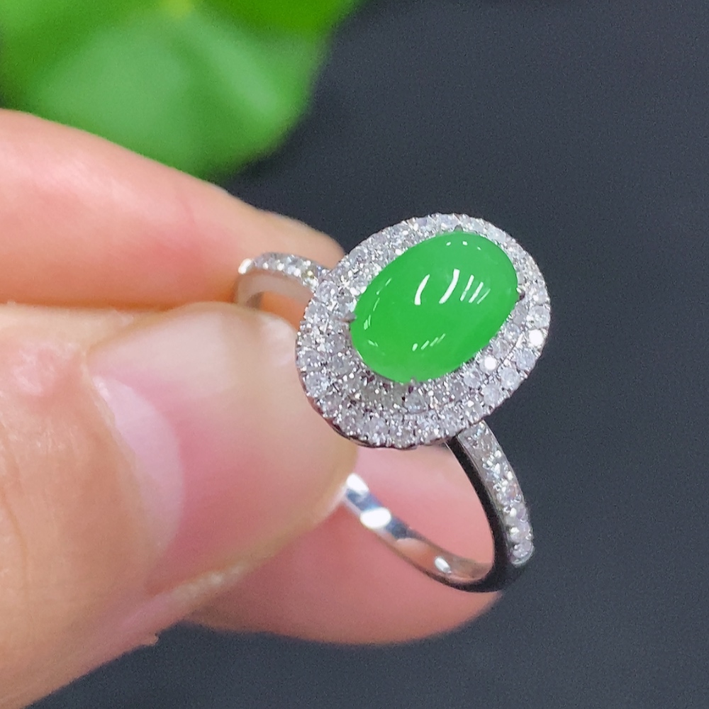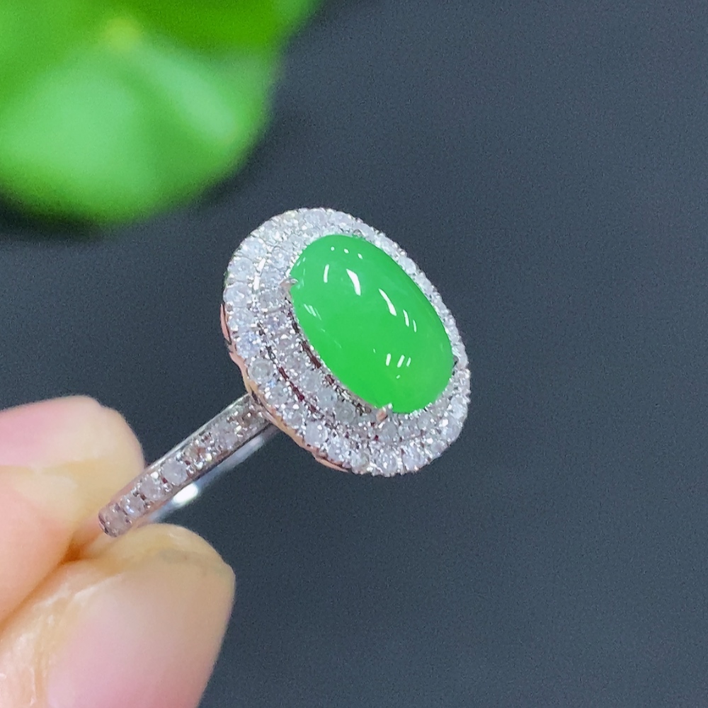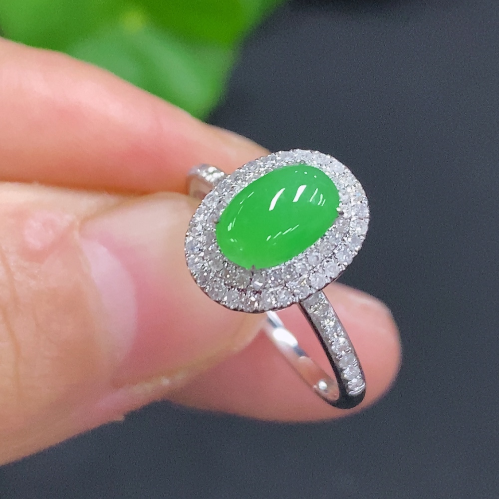Jadeite Cabochon Inlaid Ring 18K Gold Size 15 Total Weight Approx. 2.1g (With Diamond Accents)