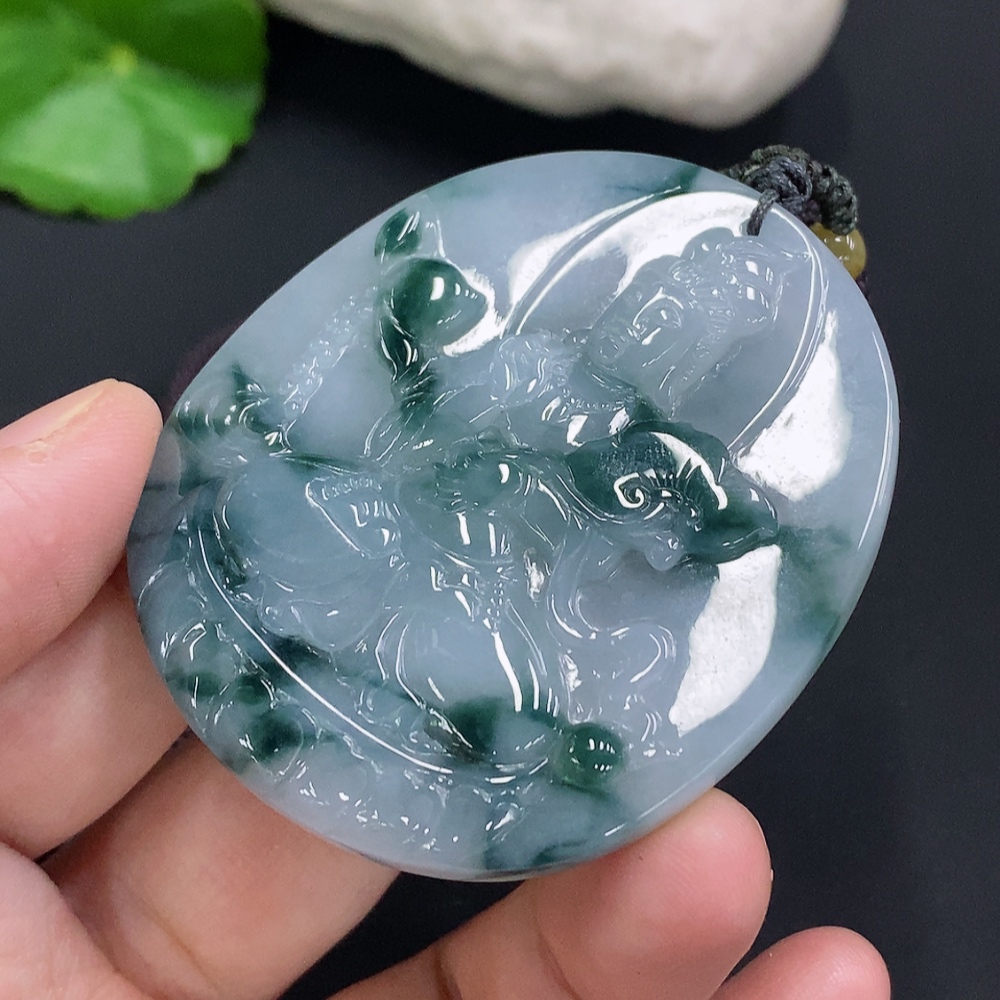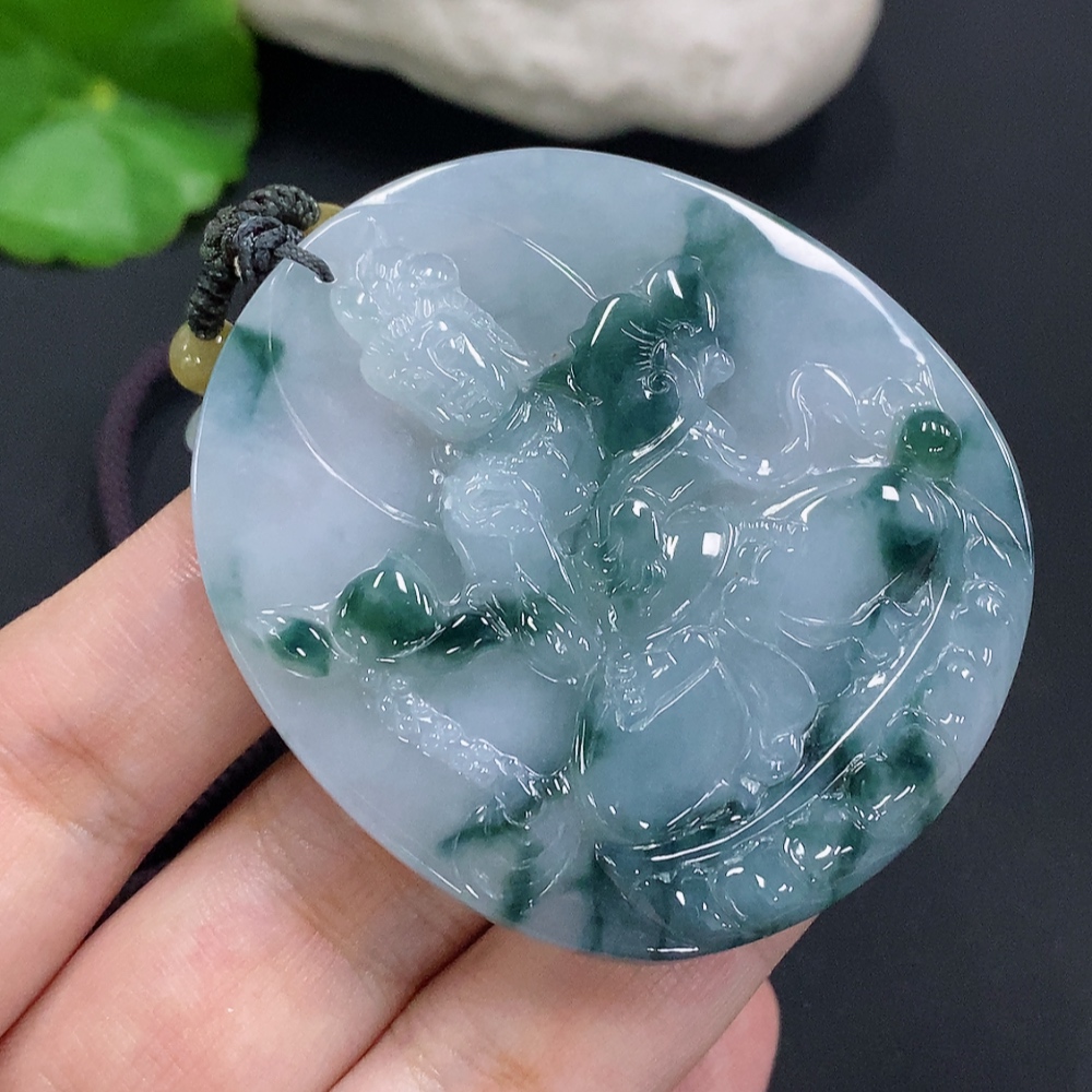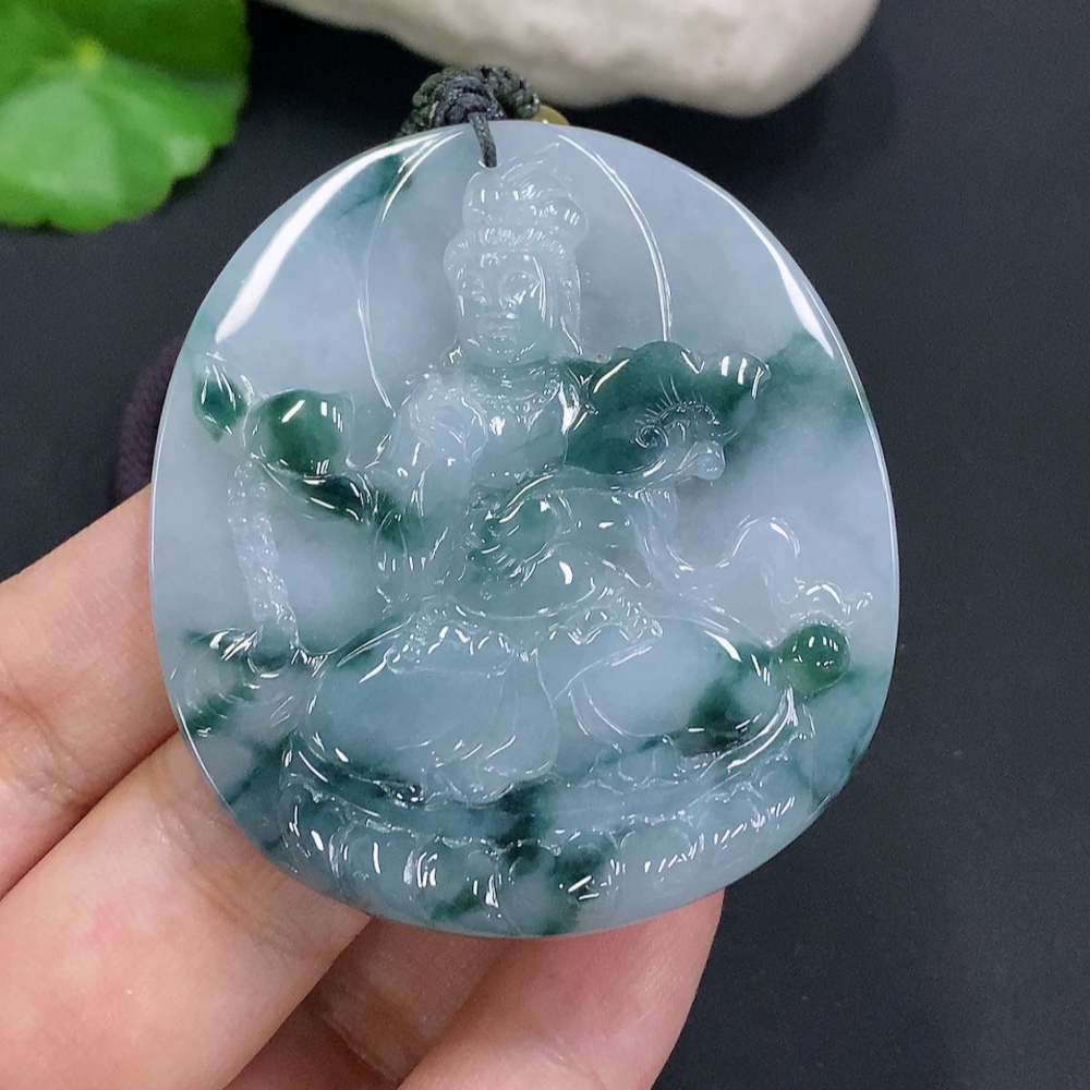 Jadeite Guanyin Pendant Total weight including the rope approximately 43.9 grams (Color origin undetermined)