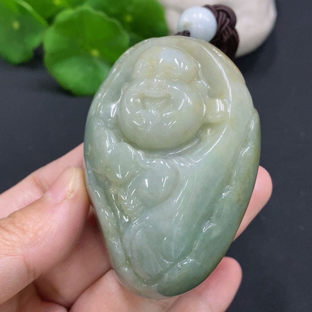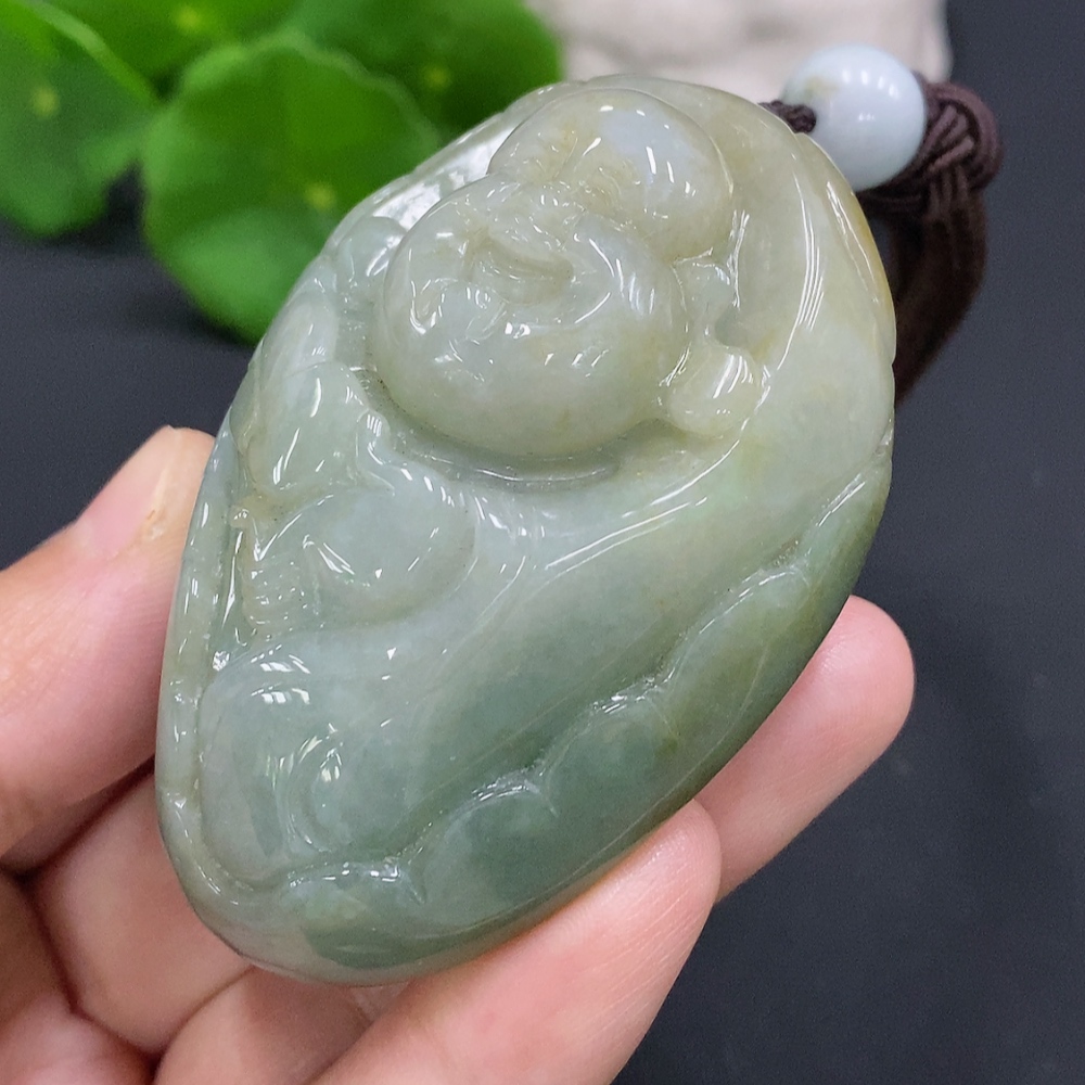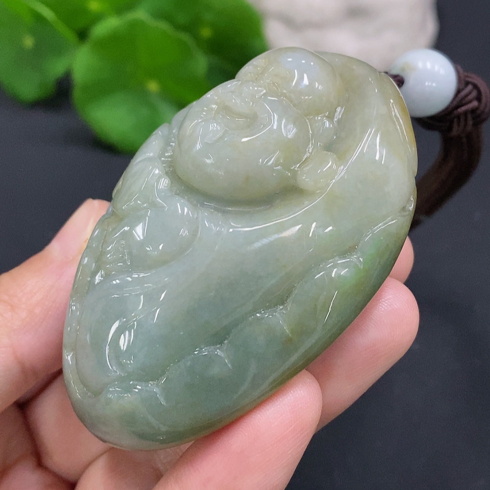 Jadeite Buddha Handheld Piece, Color Origin Undetermined, Total Weight Including Rope Approximately 144.98g