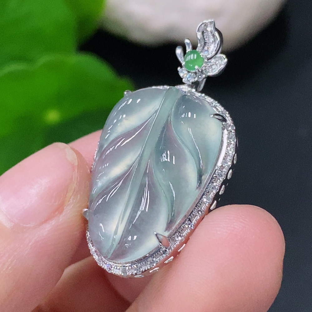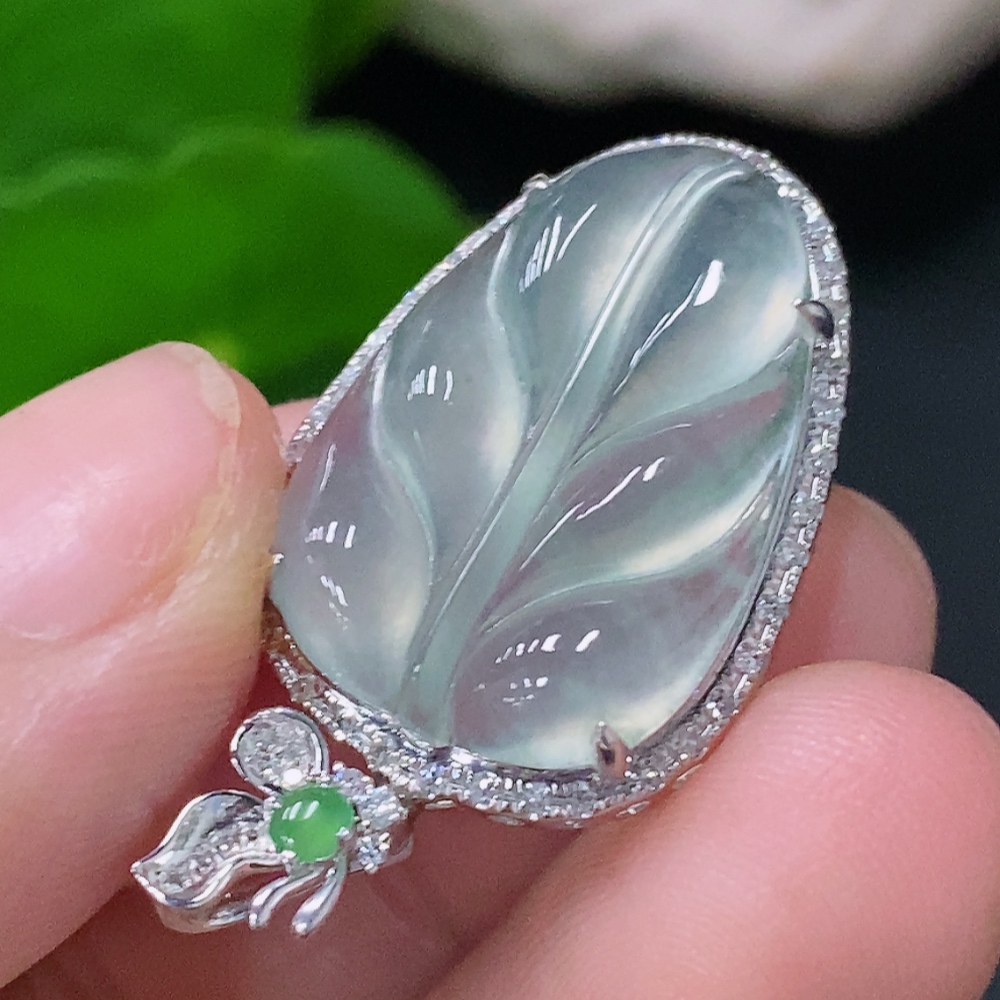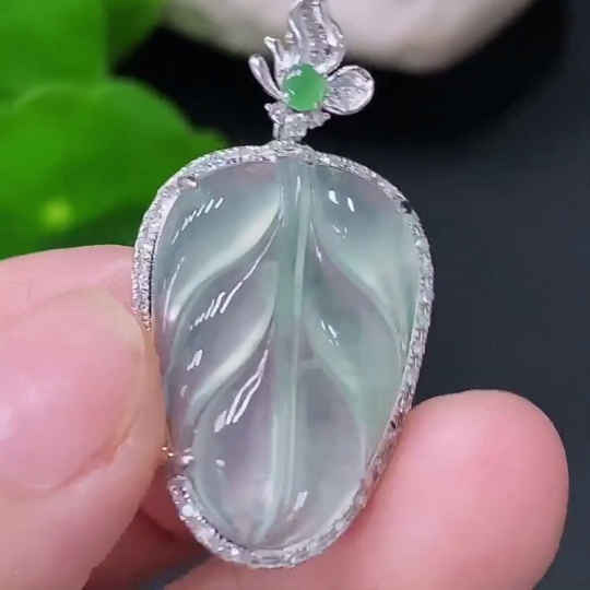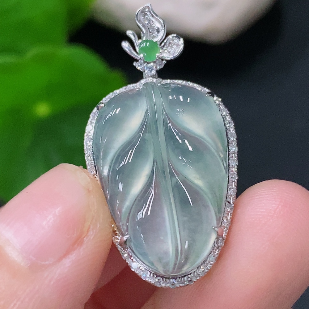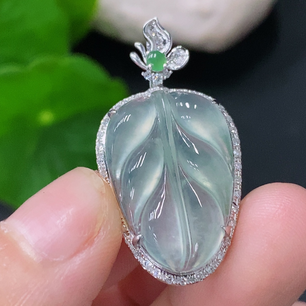 Jadeite Leaf Pendant with 18K Gold and Diamond Accent, Total Weight Approx. 3.39g