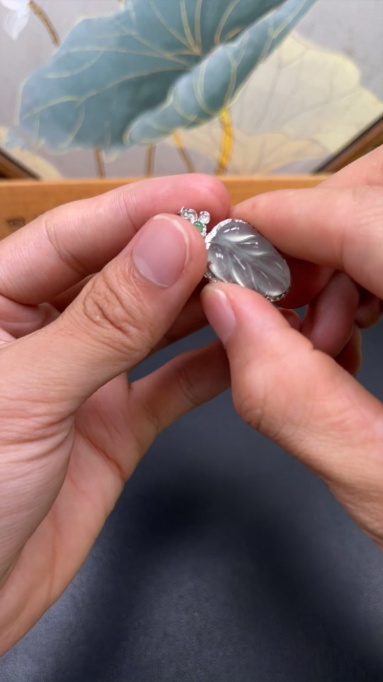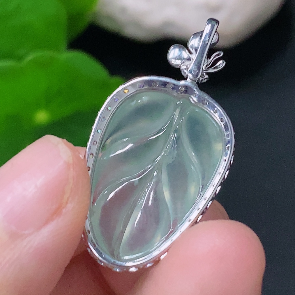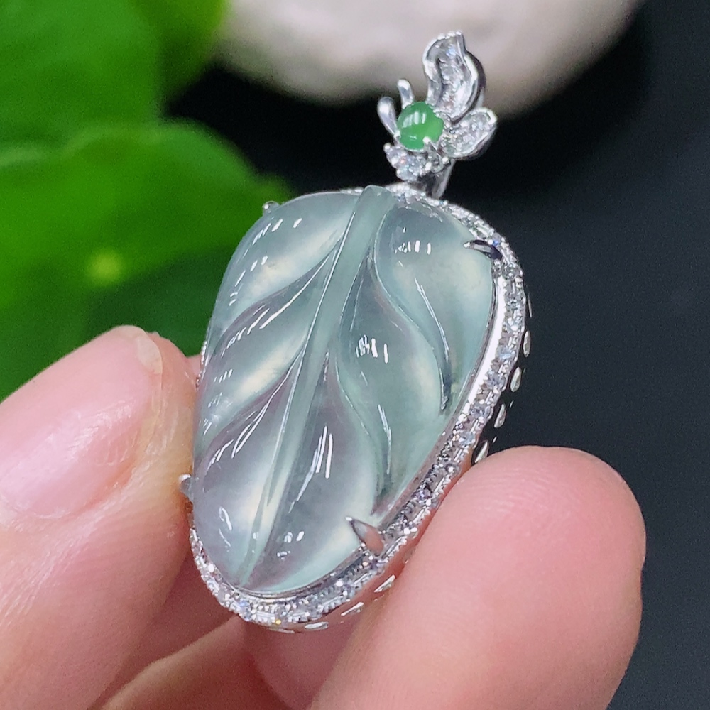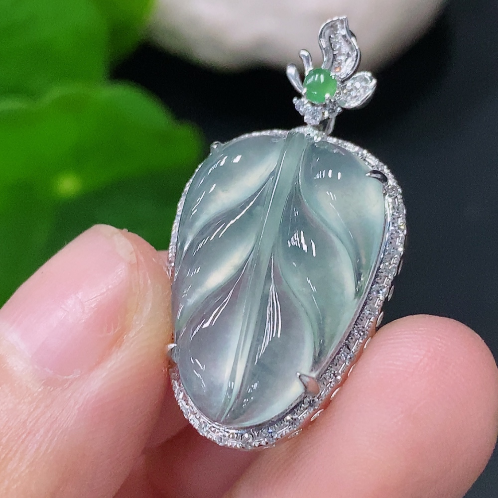 Jadeite Leaf Pendant with 18K Gold and Diamond Accent, Total Weight Approx. 3.39g