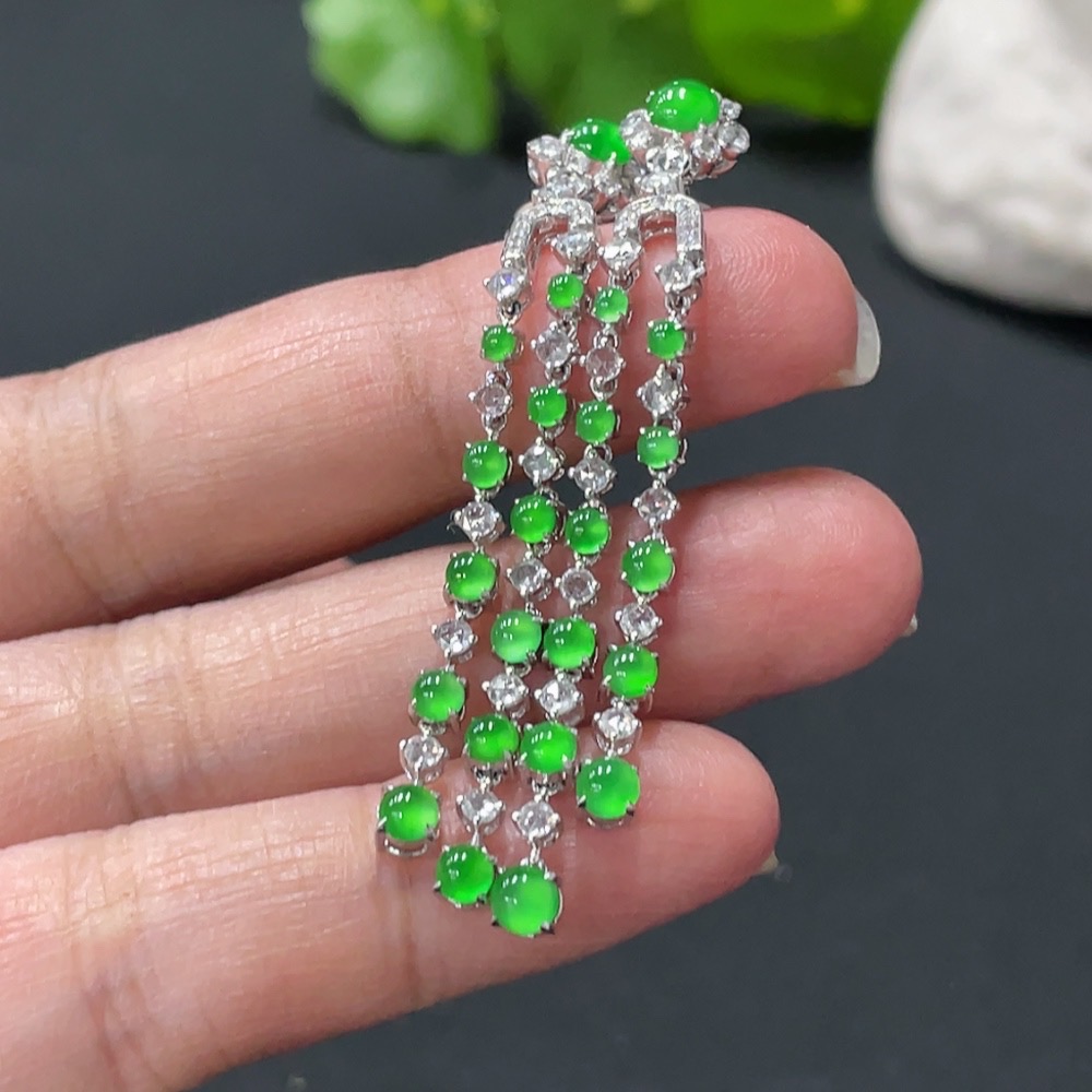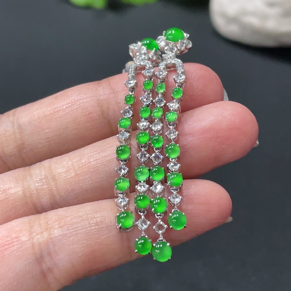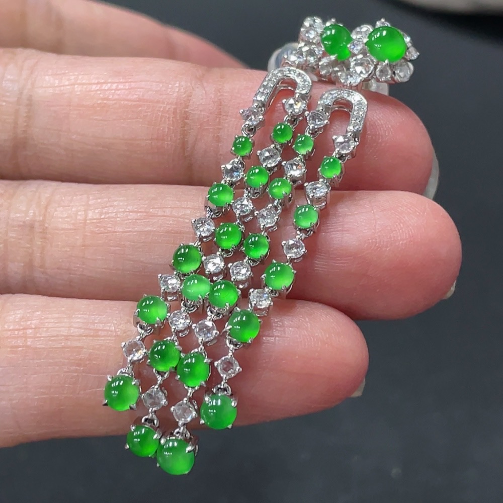 A pair of Jadeite cabochon earrings set in 18k gold with diamond accents, total weight approximately 6.63g