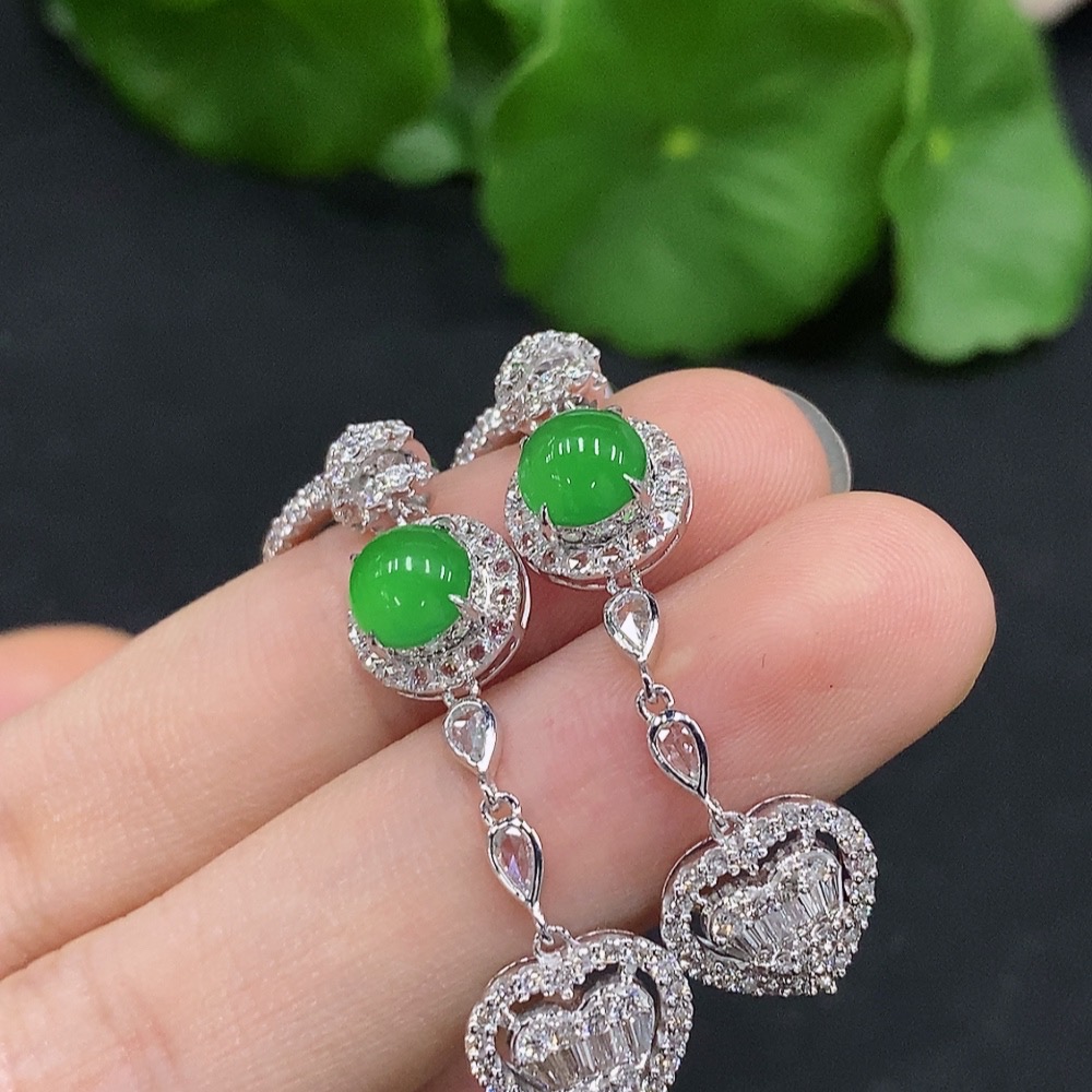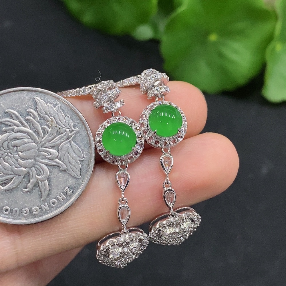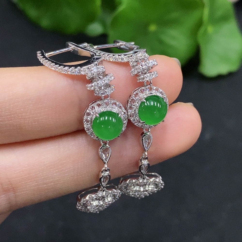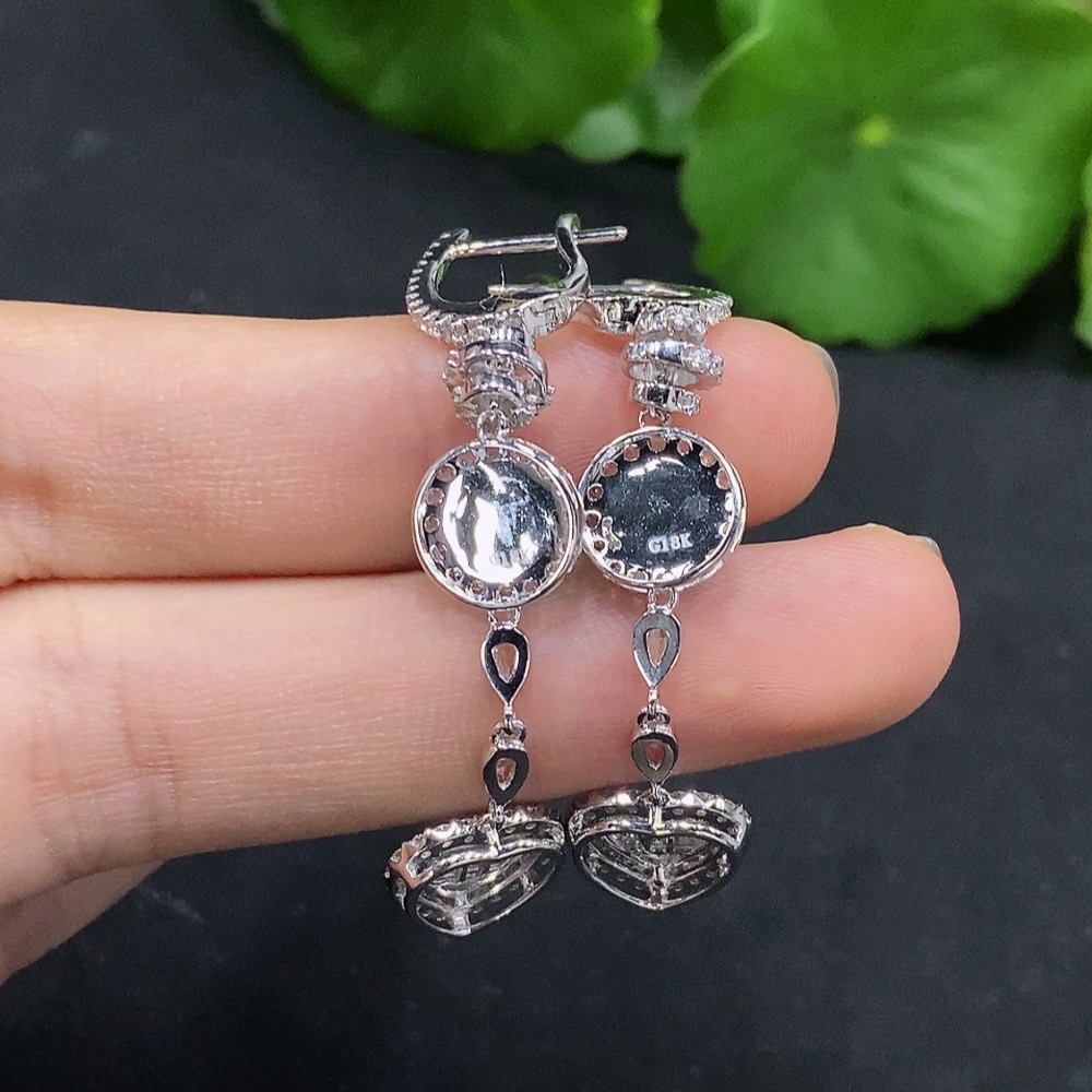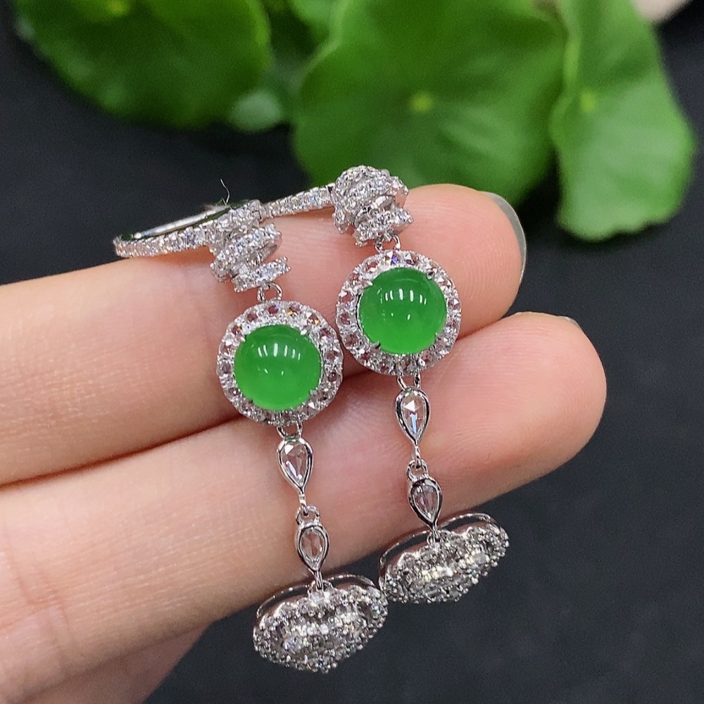 Jadeite Cabochon Earrings Set in 18K Gold with Diamond Accents, Total Weight Approximately 6.83g