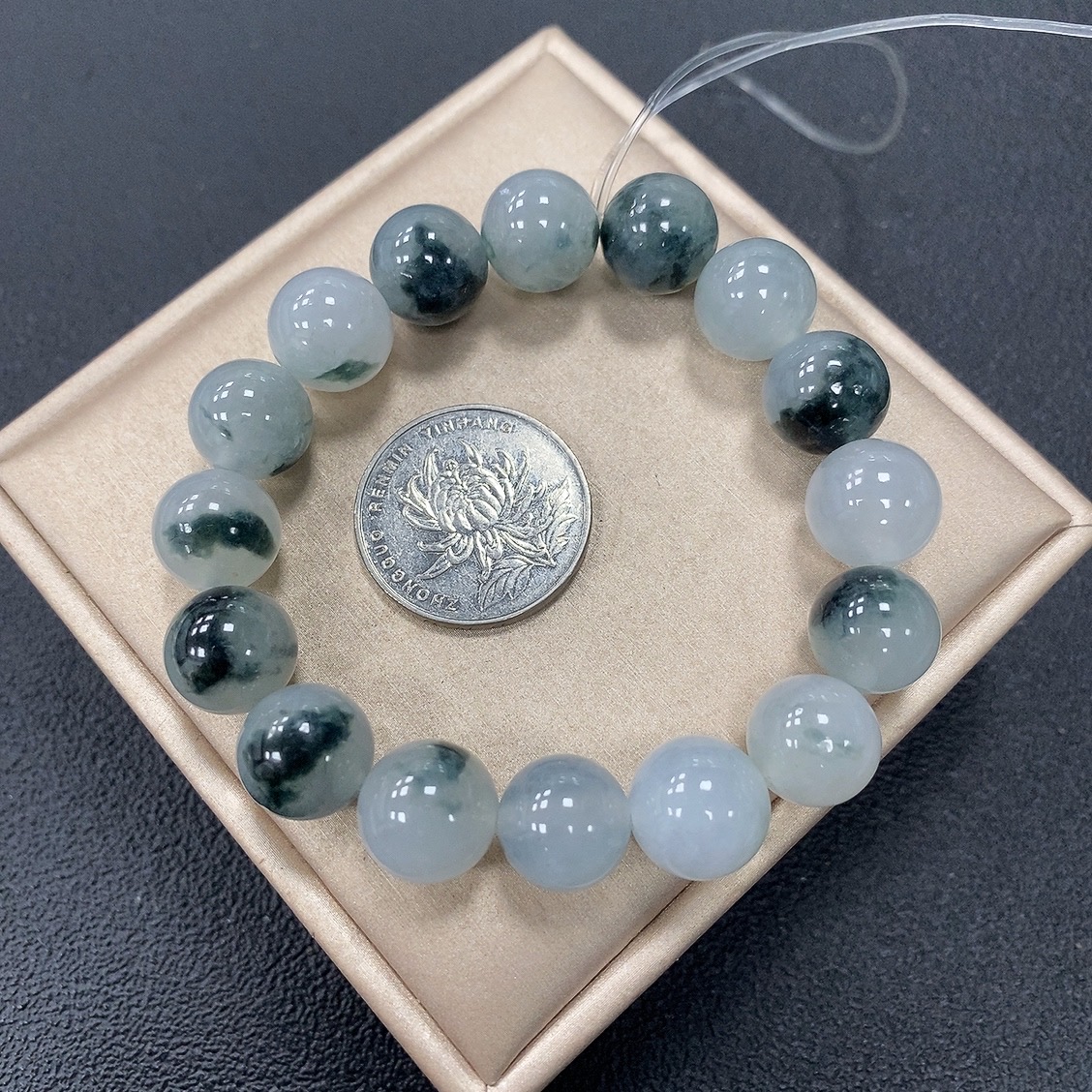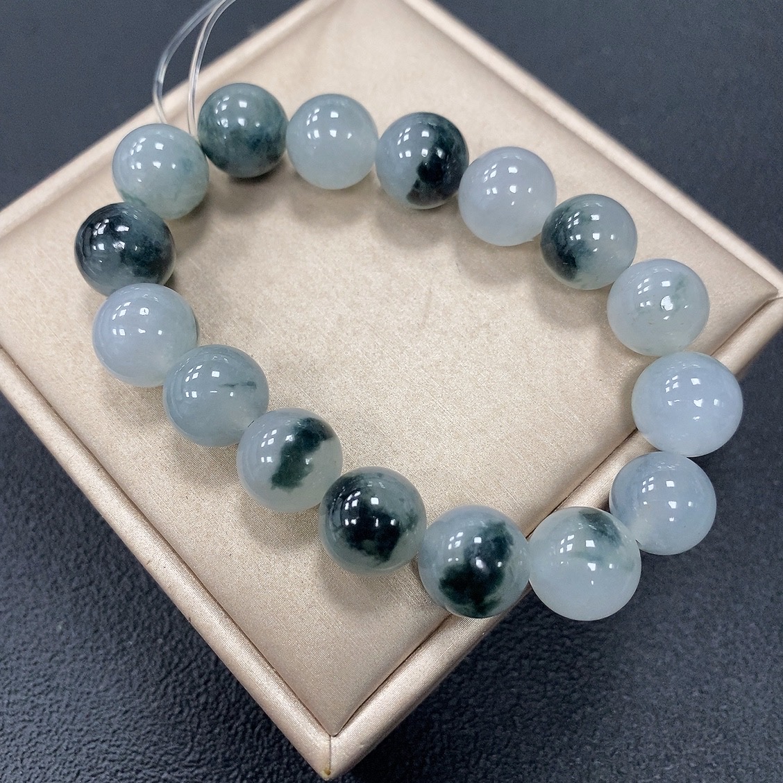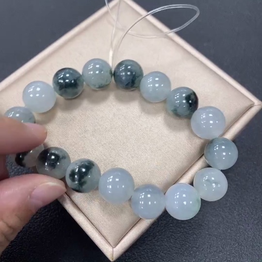 Jadeite Beaded Necklace with Floating Floral Patterns, Some Beads with Veins, Size 12.9
