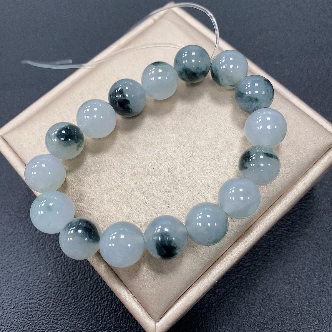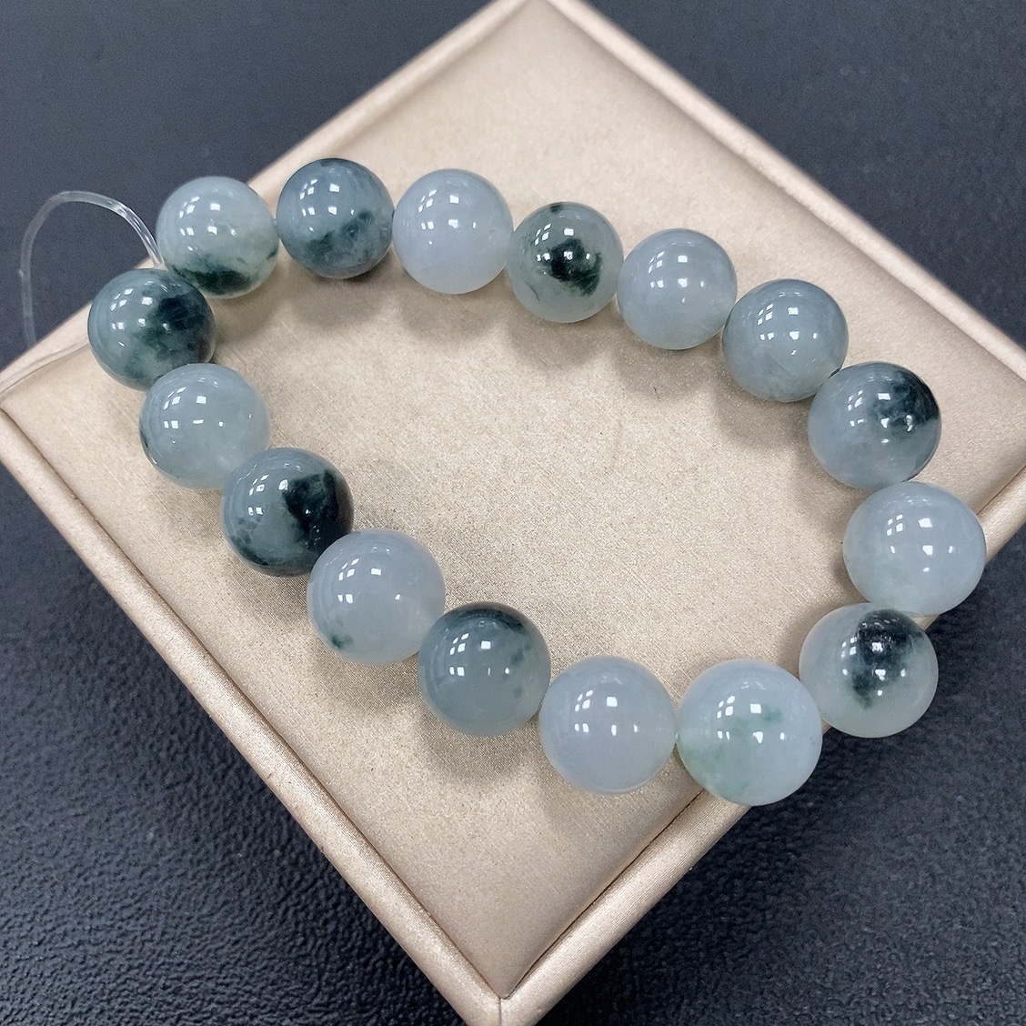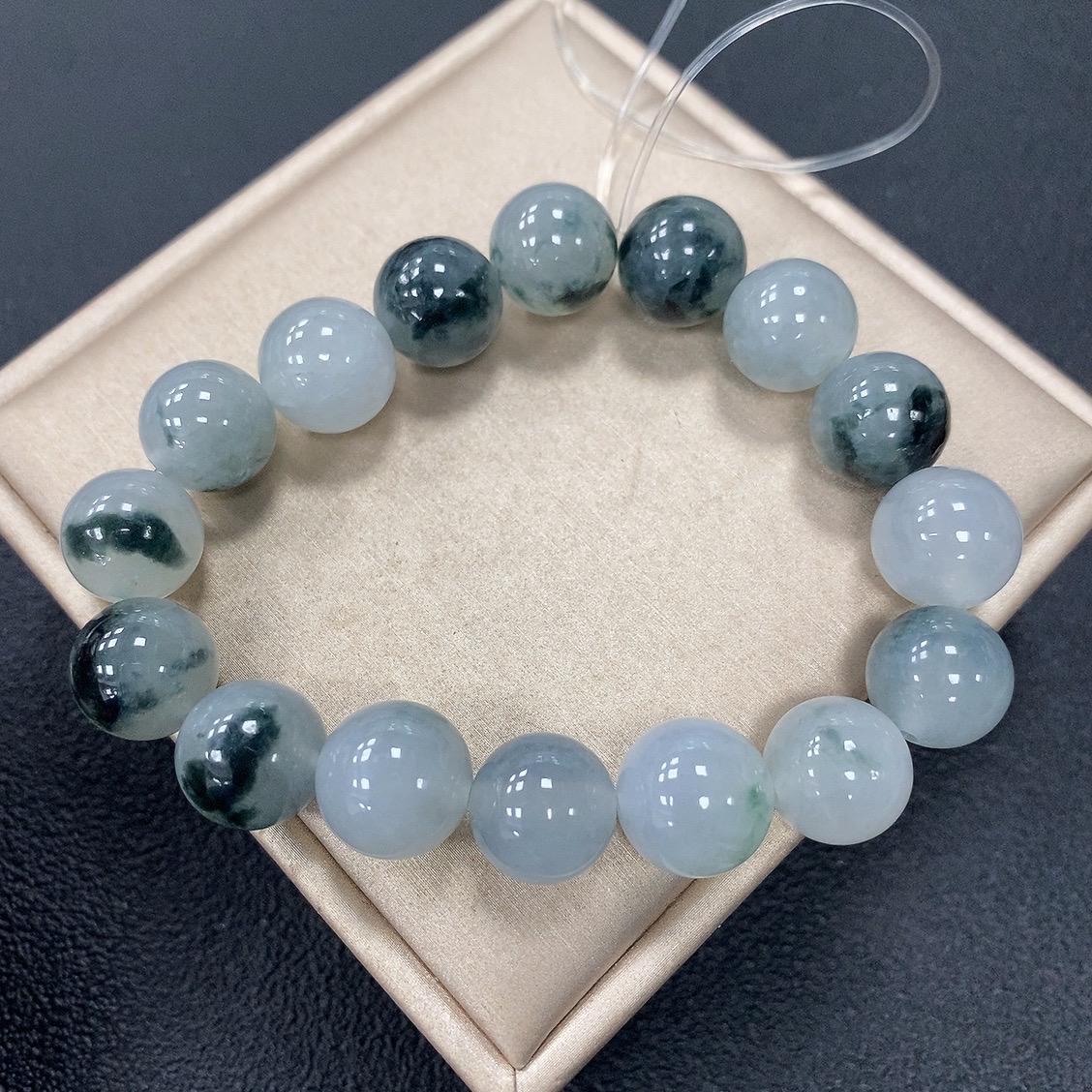 Jadeite Beaded Necklace with Floating Floral Patterns, Some Beads with Veins, Size 12.9