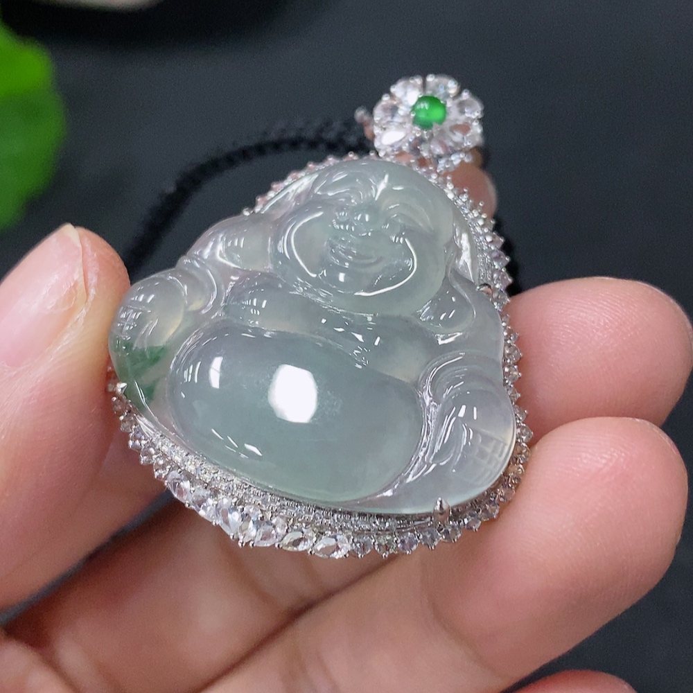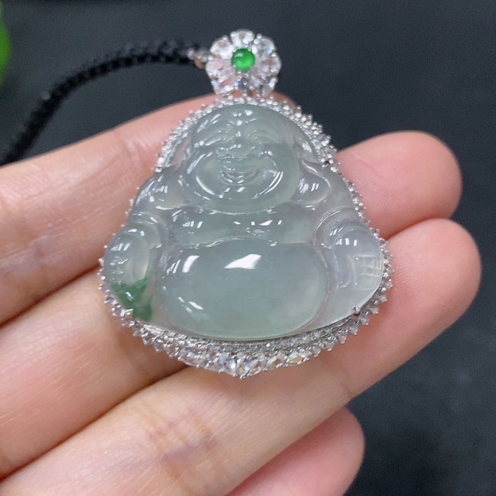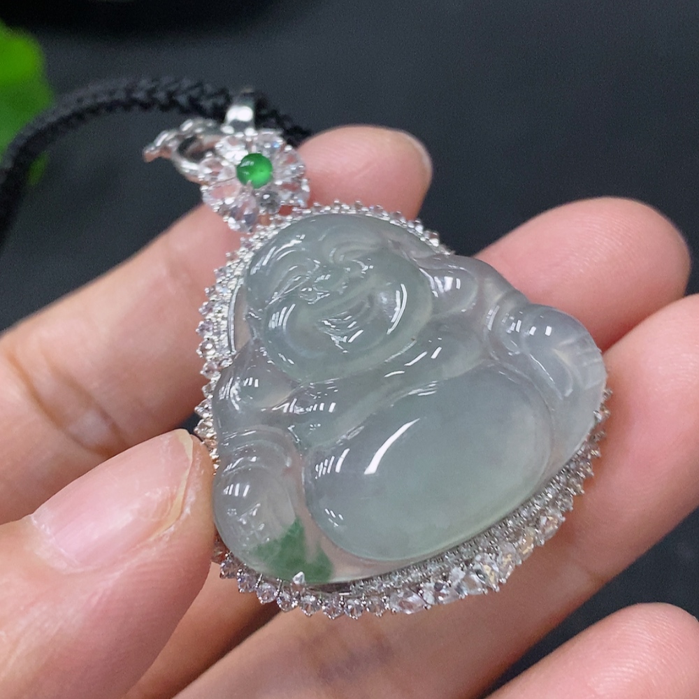 Jadeite inlaid Buddha pendant with 18k main body and non-gold other parts, set with minimum round diamonds only, total product weight approximately 12.37g including rope