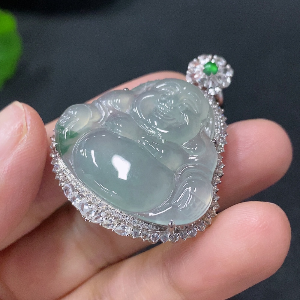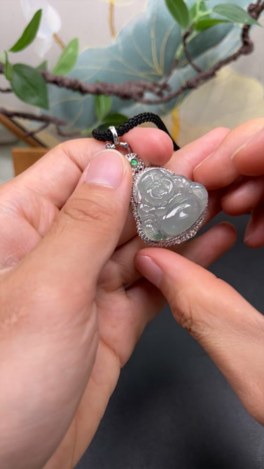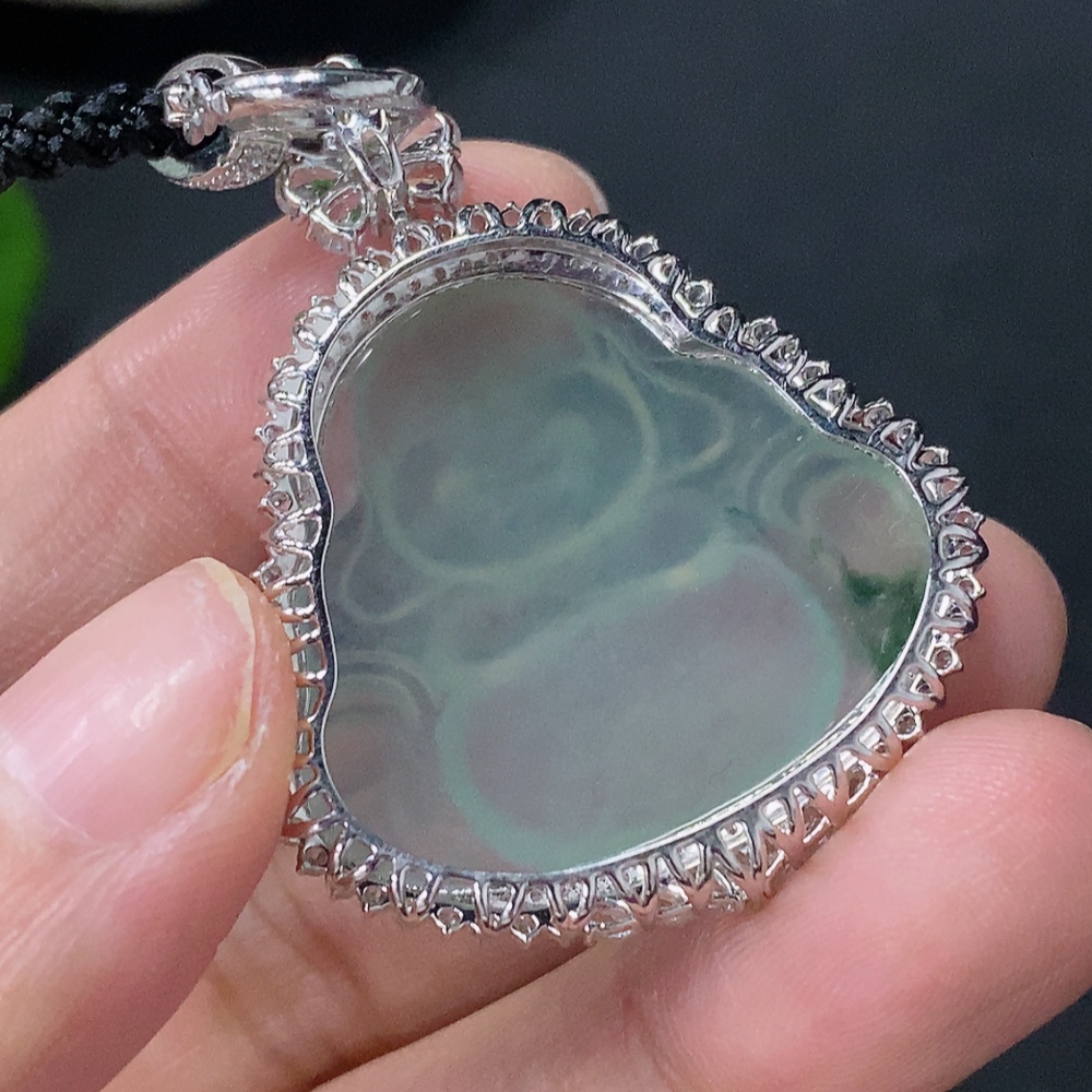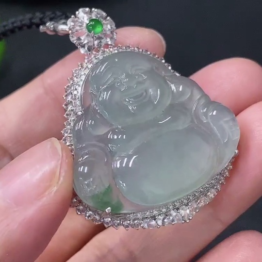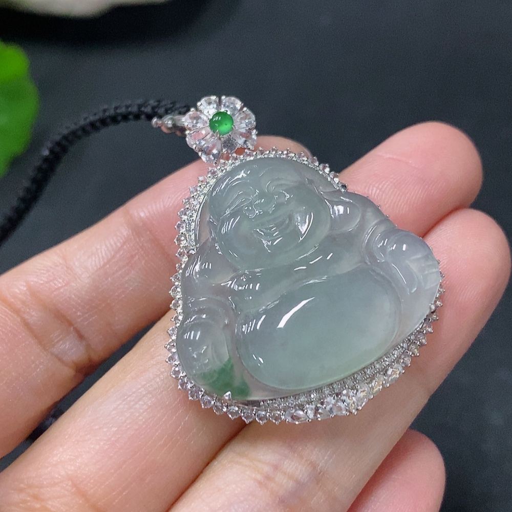 Jadeite inlaid Buddha pendant with 18k main body and non-gold other parts, set with minimum round diamonds only, total product weight approximately 12.37g including rope