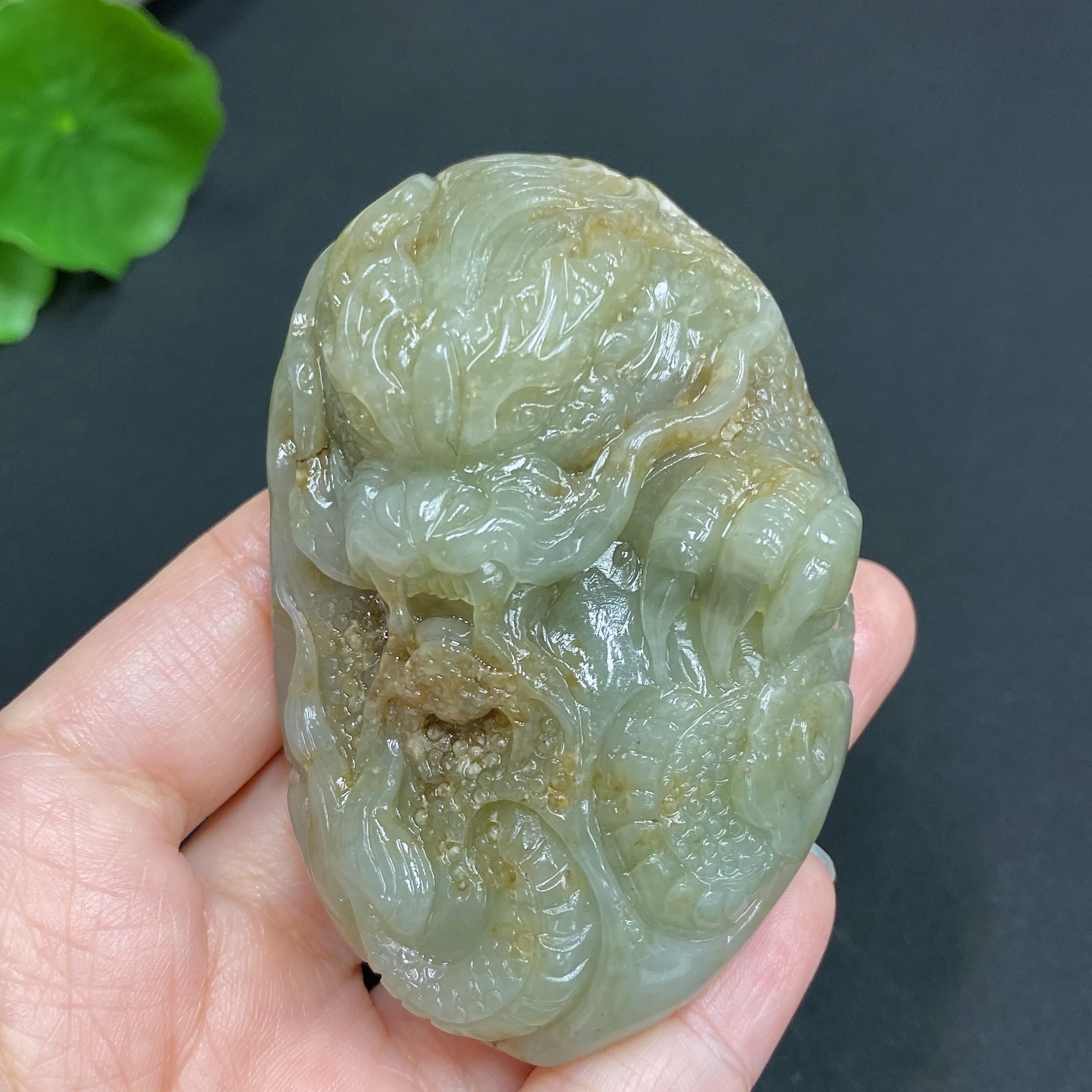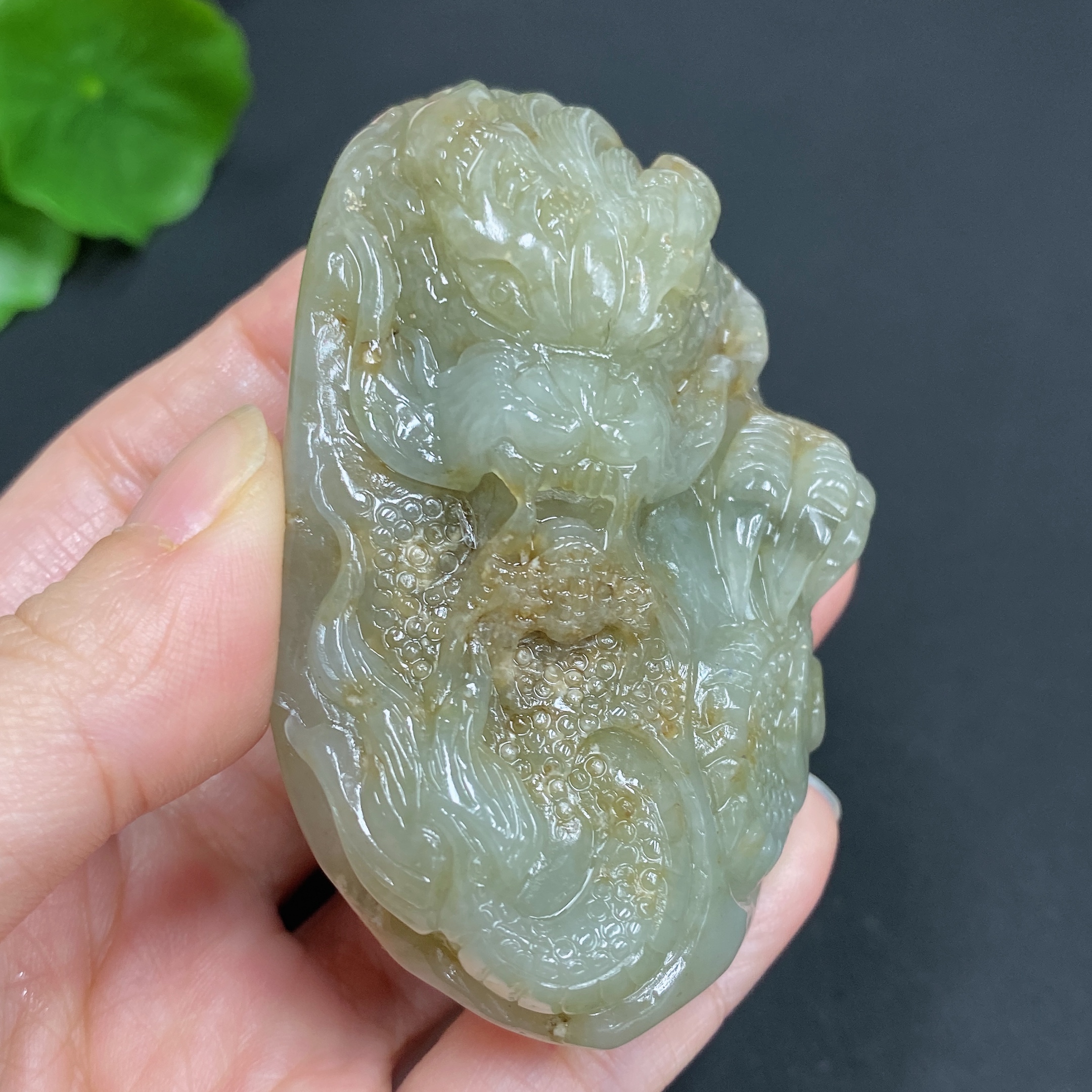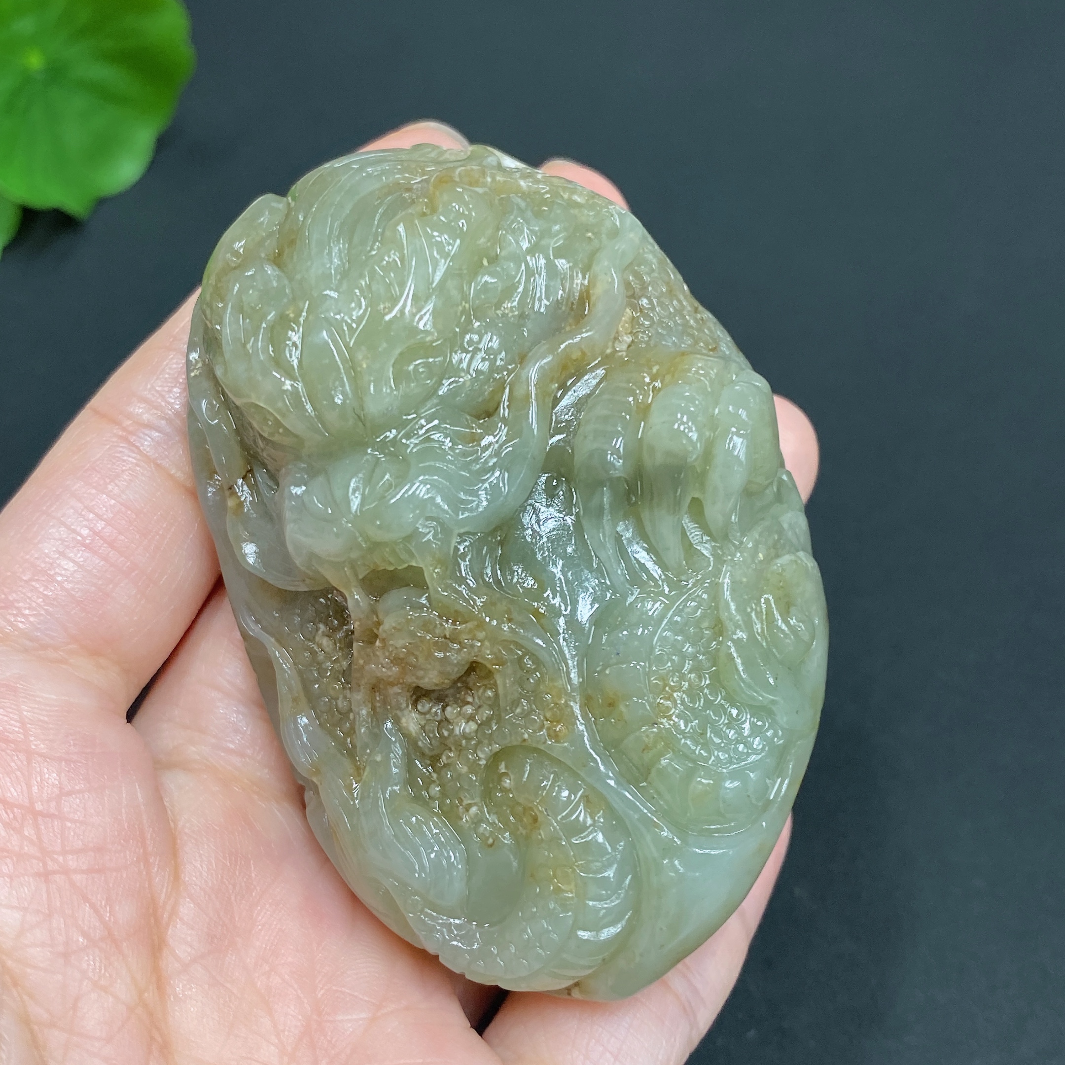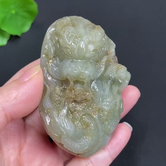 Hetian Jade Seed Material Handheld Carving "Dragon Roaming the World" with Undetermined Skin Color Origin, Total Weight Approx. 114.9g