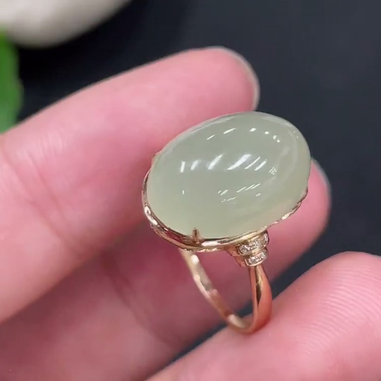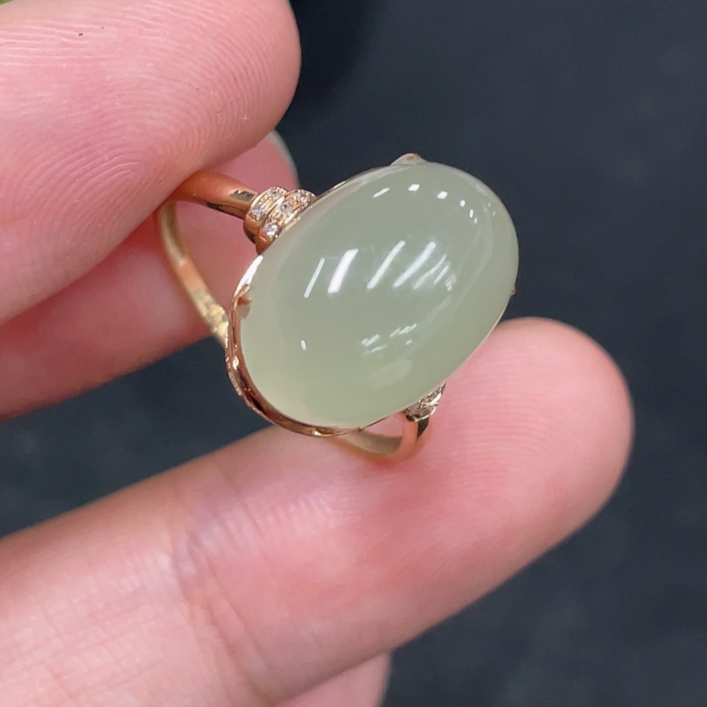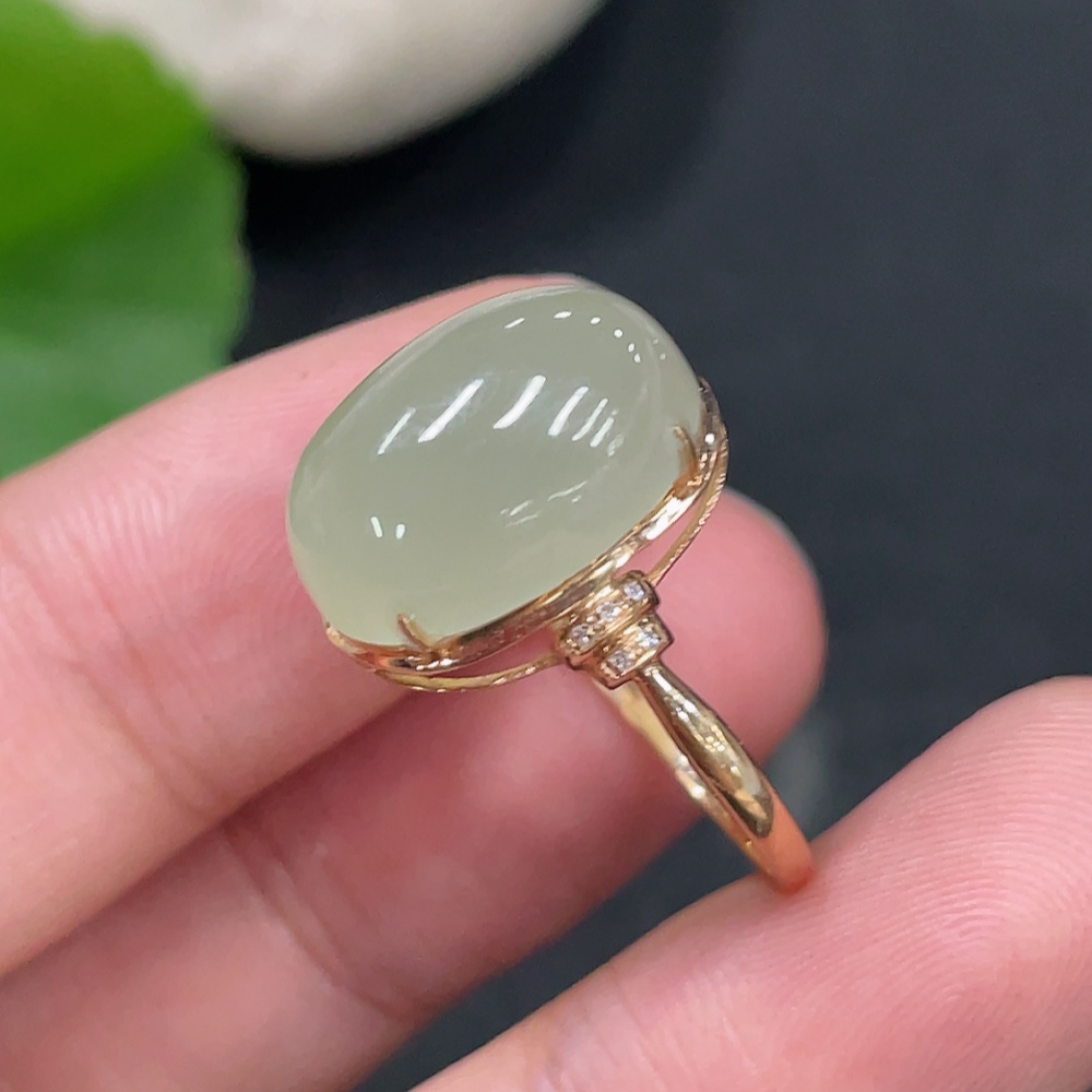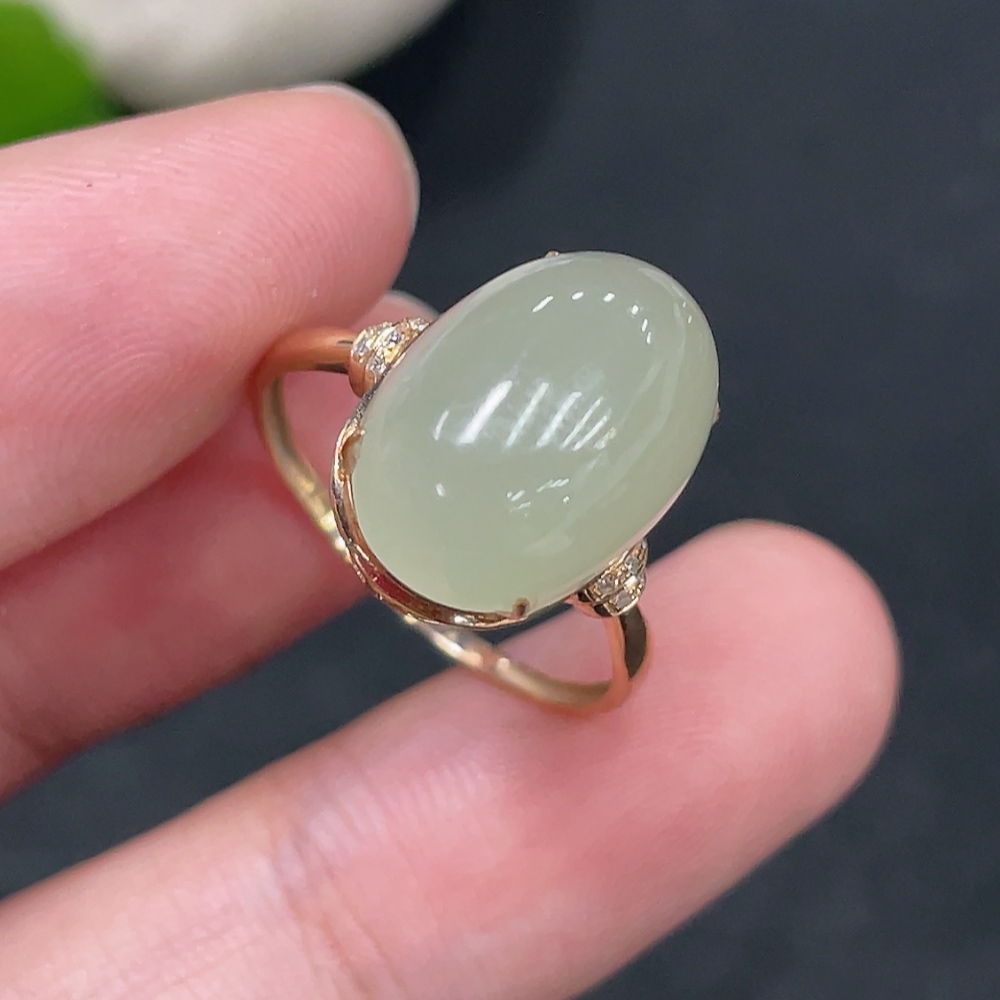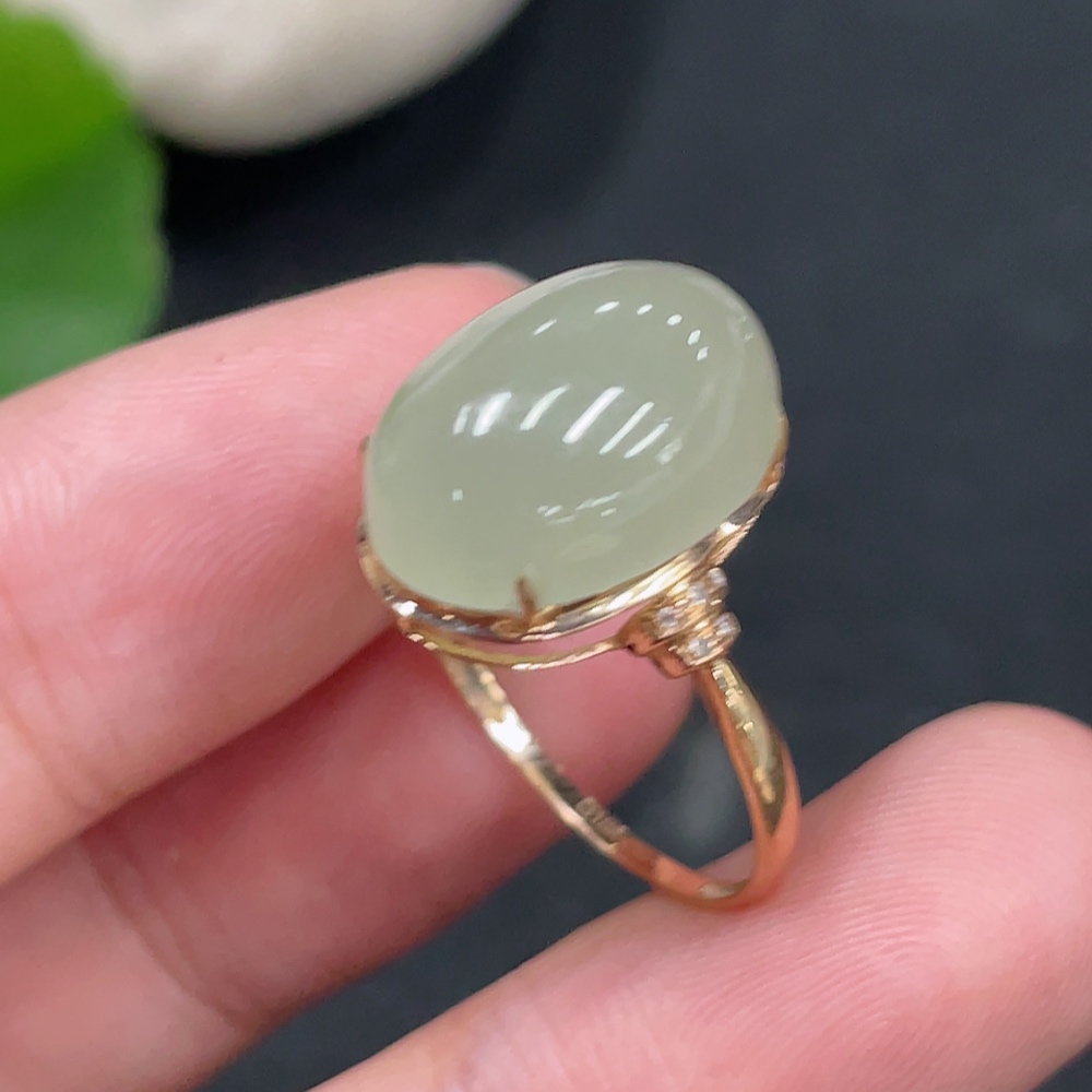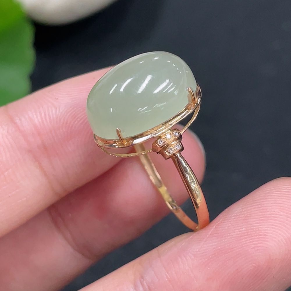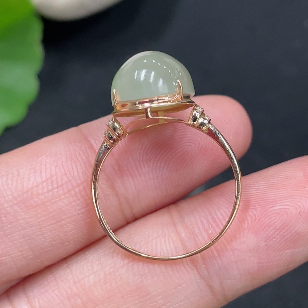 Hetian Jade Cabochon Inlaid Ring, 18k Gold, Size 14, Total Weight Approx. 2.1g