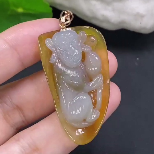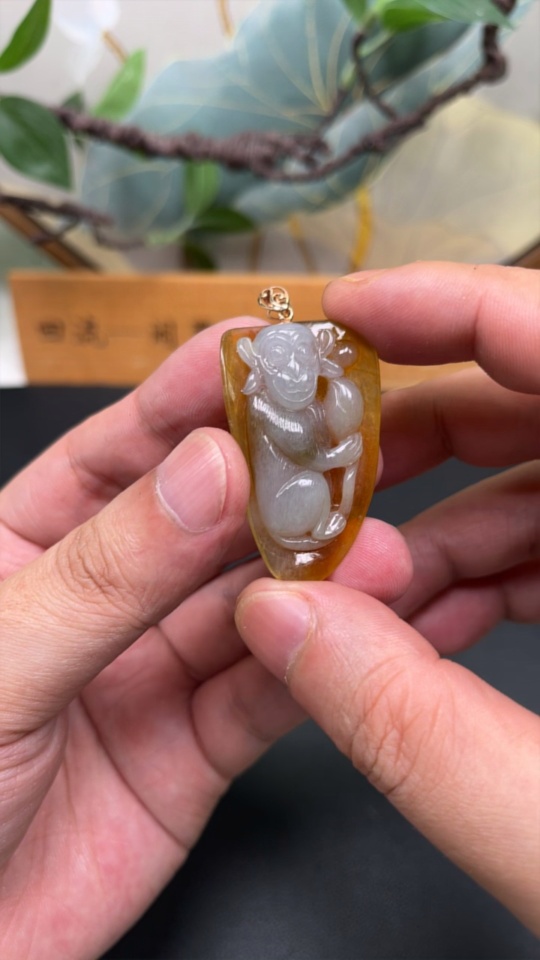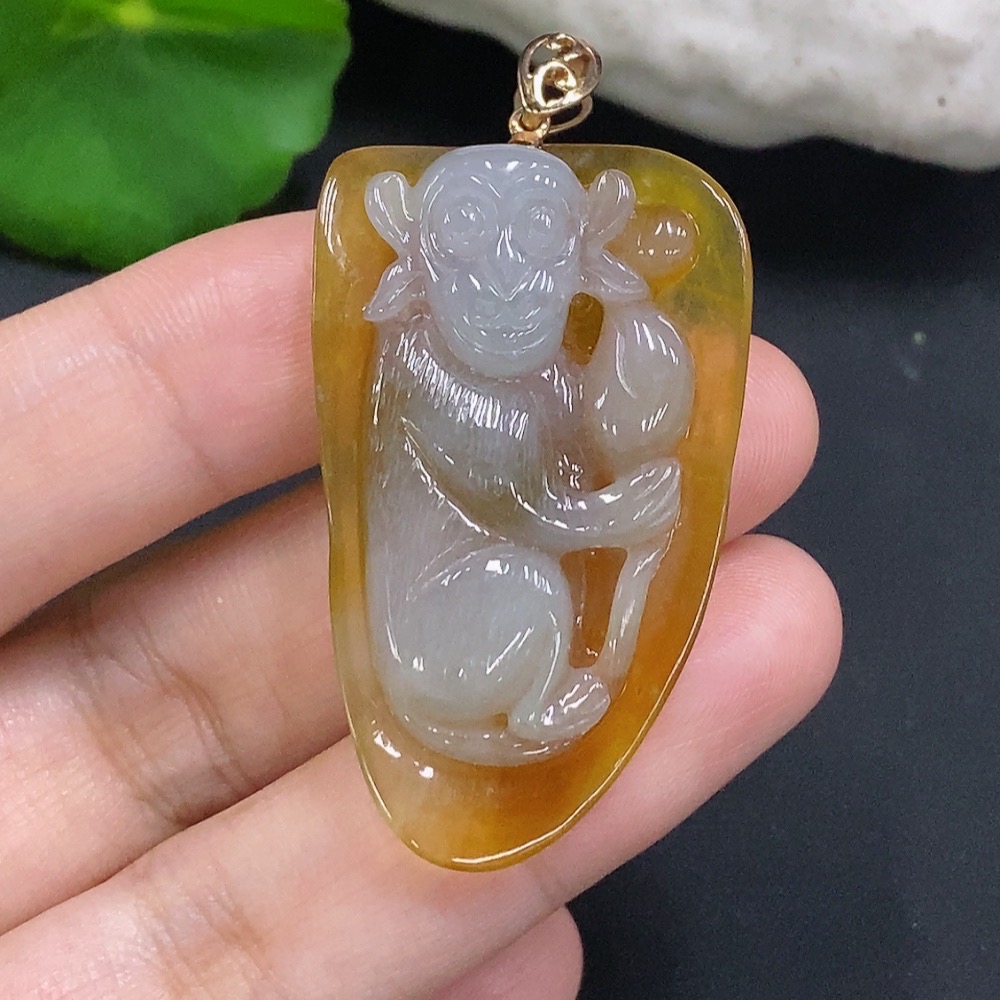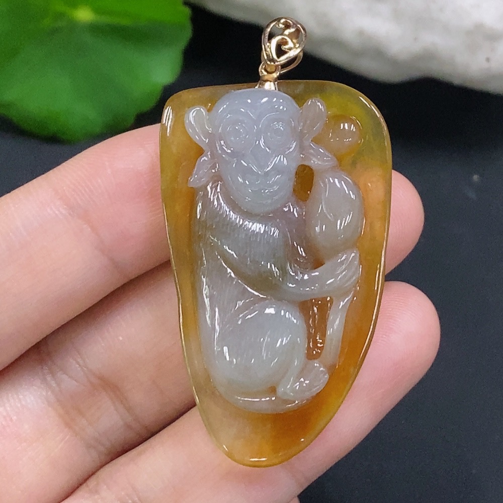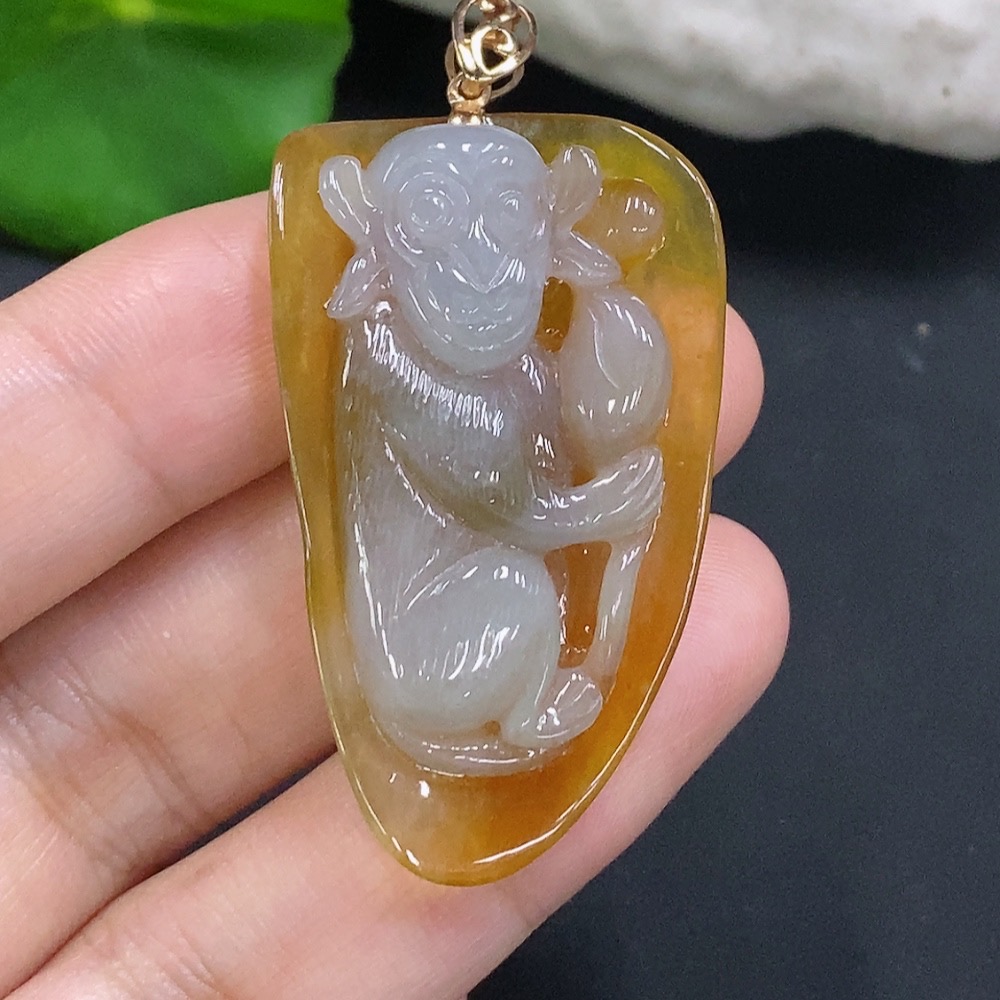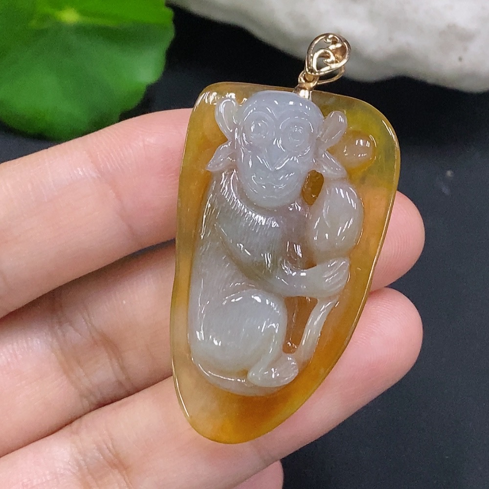 Jadeite Monkey Pendant with 18K Gold Clasp, Total Weight Approx. 13.1g (Color Origin Undetermined)