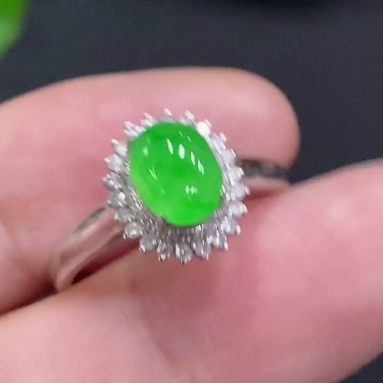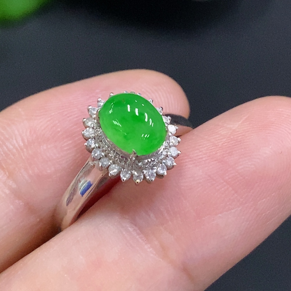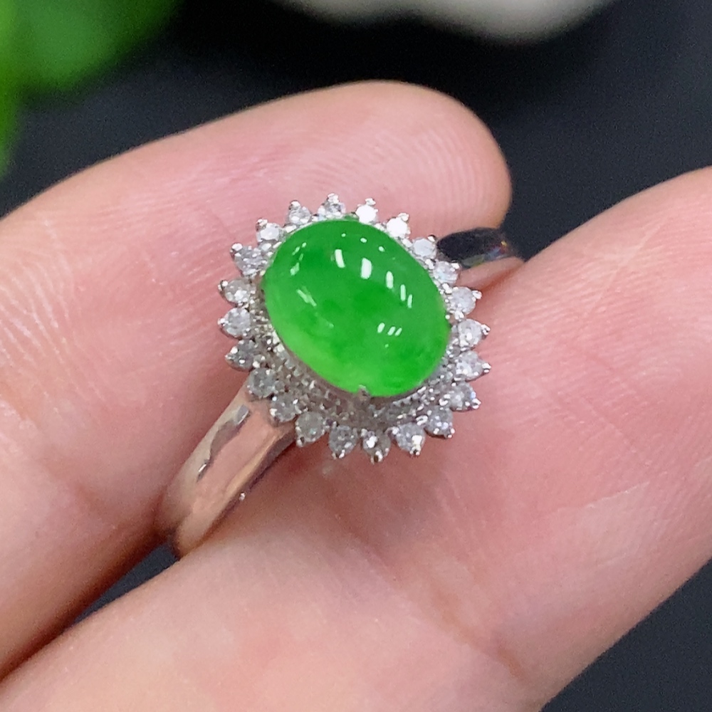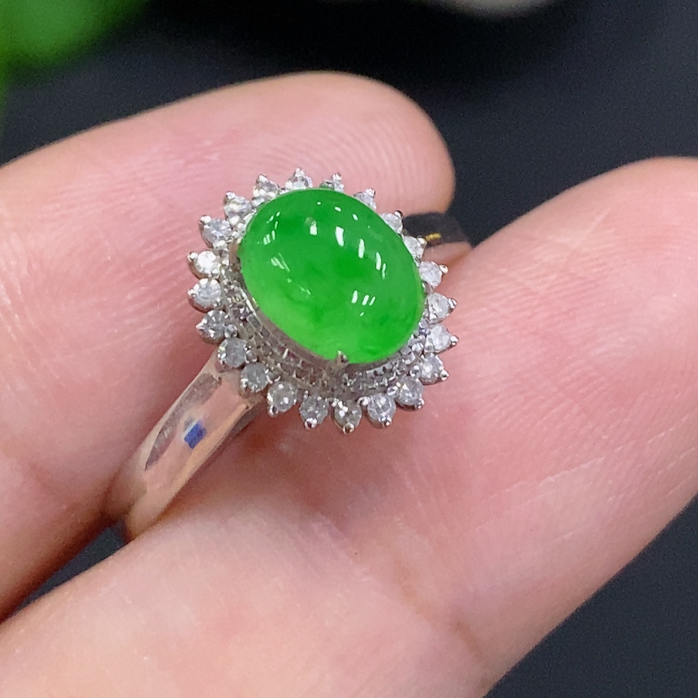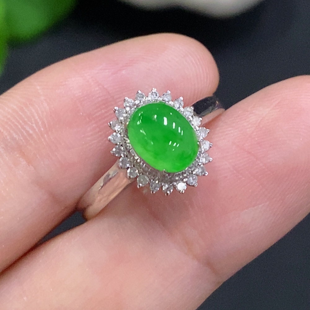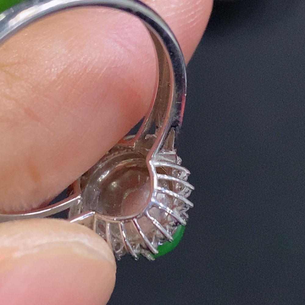 Jadeite Cabochon Inlaid Ring 18K Gold Size 14 Total Weight Approx. 2.3g (Diamond Accents)