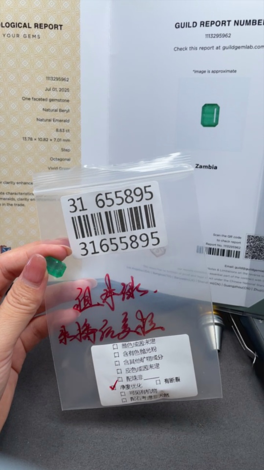 Emerald Rough Stone Clarity Enhanced Total Weight Approx. 8.60 Carats GILDER Certificate: Minor Oil Zambia Origin Vivid Green 8.63ct