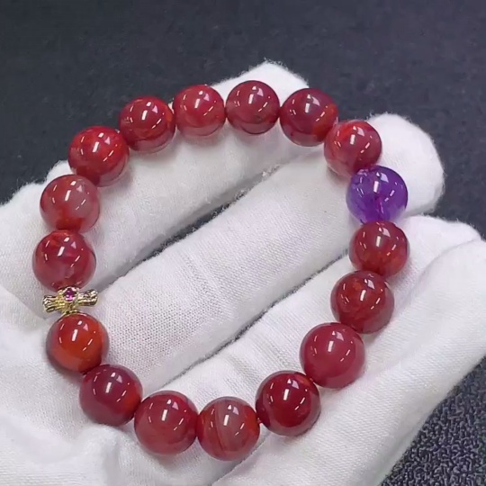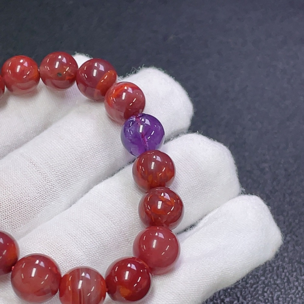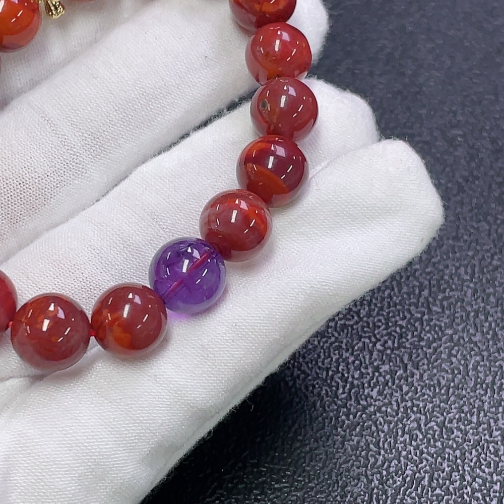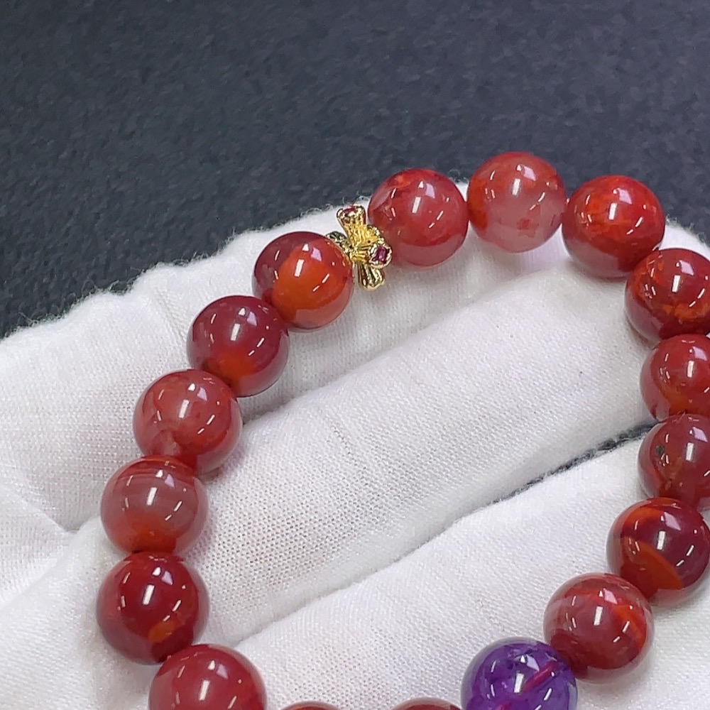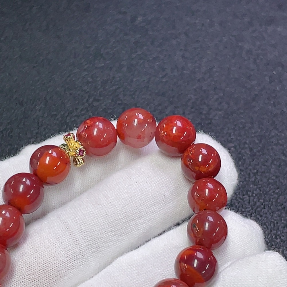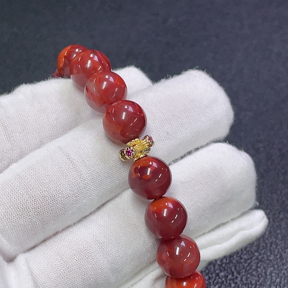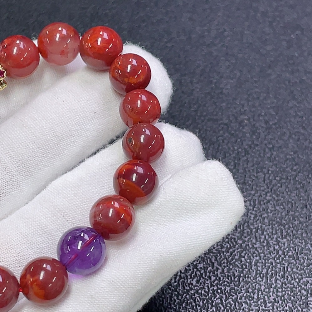 South Red Agate Bracelet with Visible Organic Inclusions, Crystal Accents, Total Weight Approx. 24.17g, Bead Size 9.7mm, Non-Gold