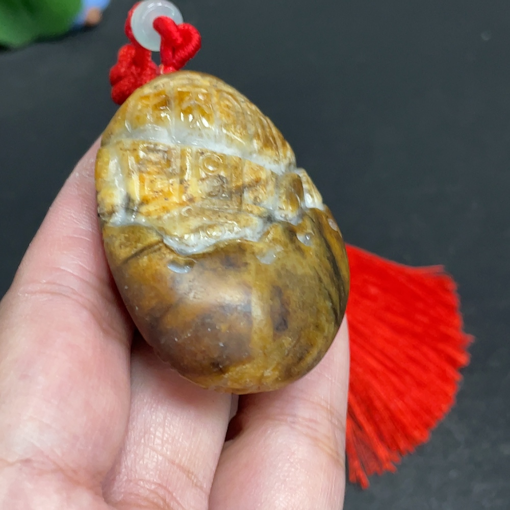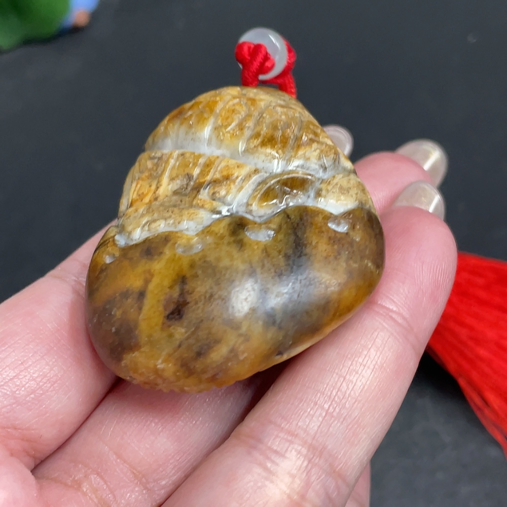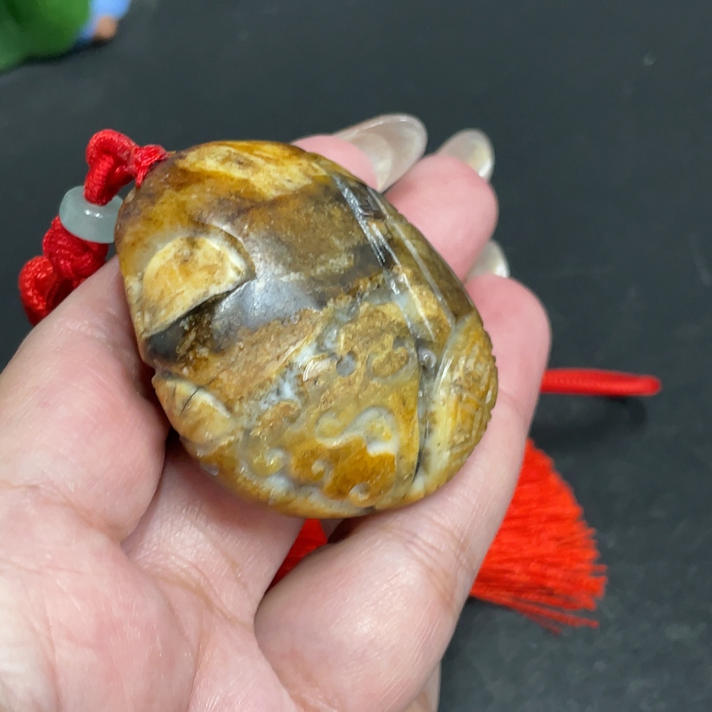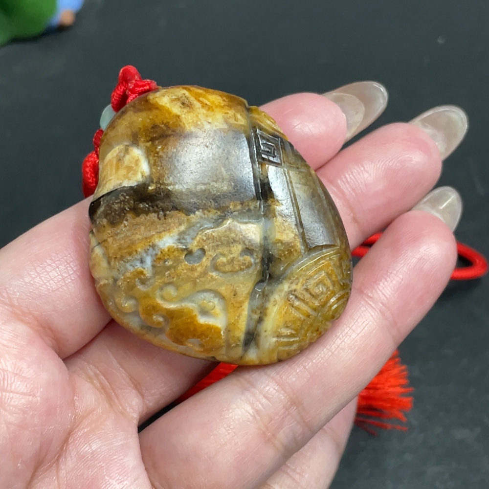 Hetian Jade Handheld Carving (Antique Style, Contains Other Mineral Components, Undetermined Skin Color Origin, Total Weight Approx. 61.7g [Including Rope])