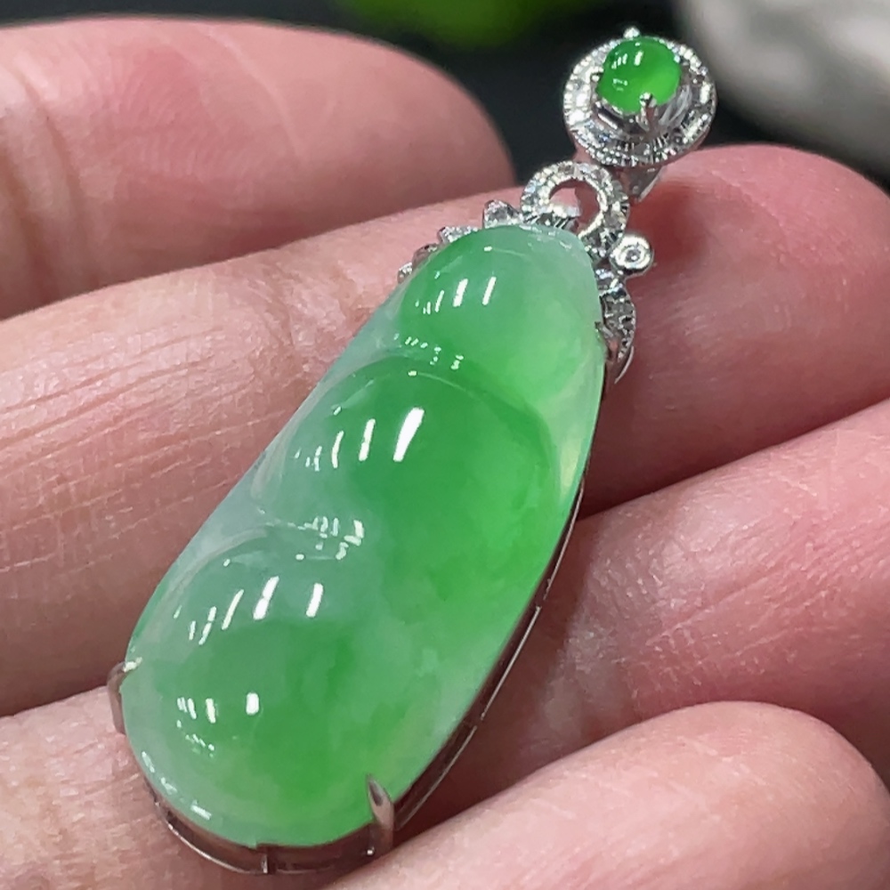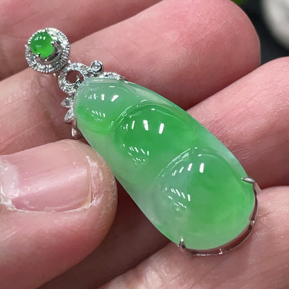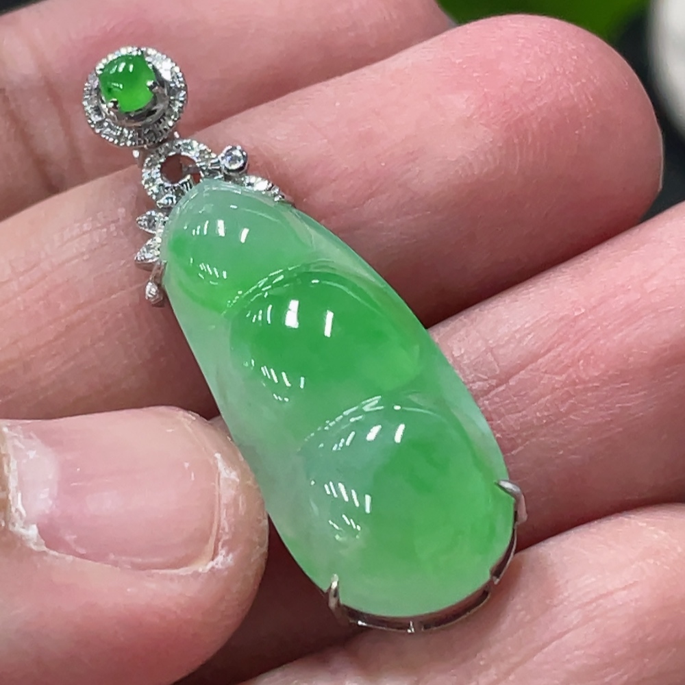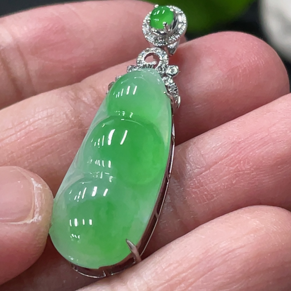 Jadeite Bean Pendant with 18K Gold and Diamond Accents, Total Weight Approx. 3.9g