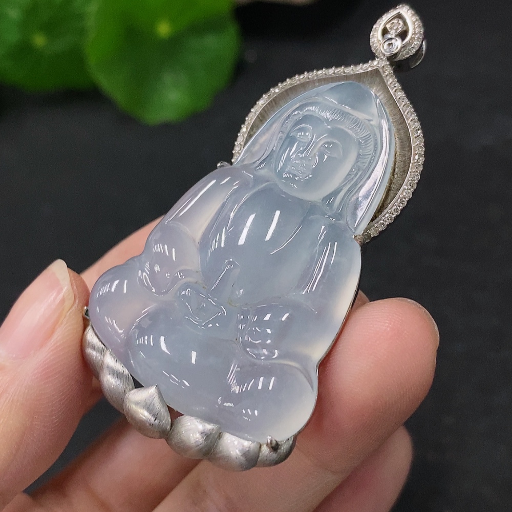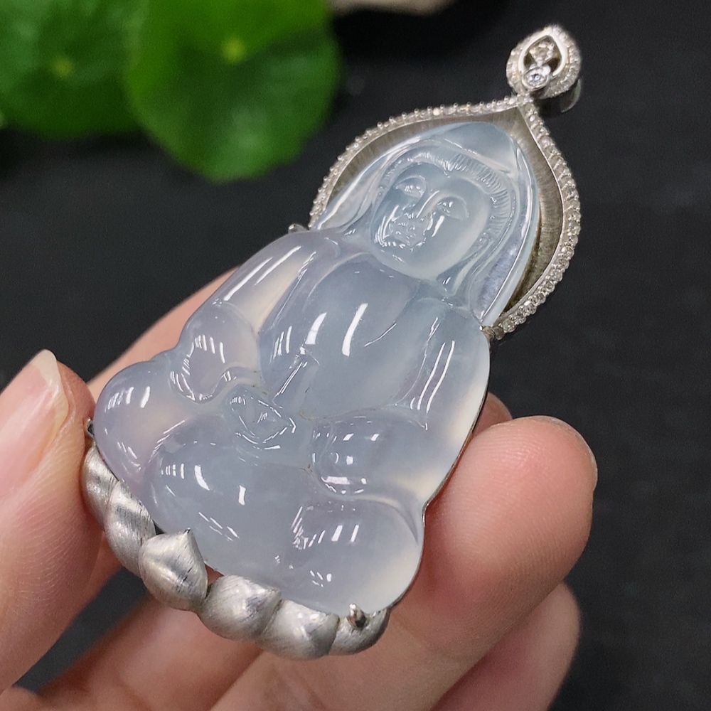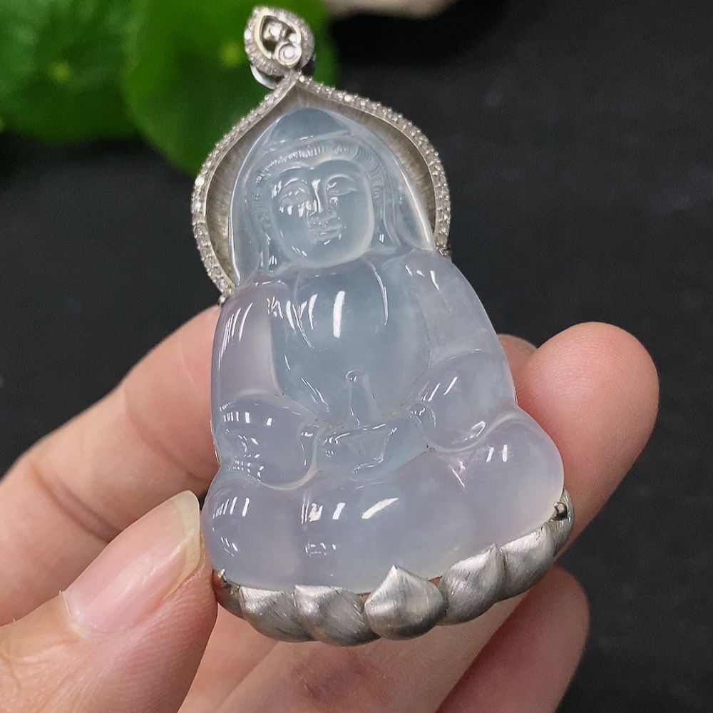 Jadeite Guanyin Pendant in 18K Gold with Diamond Accents, Total Weight Approx. 17.2g