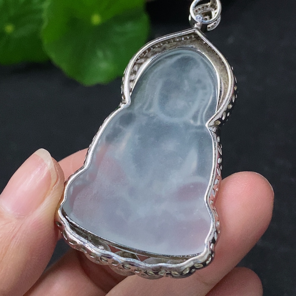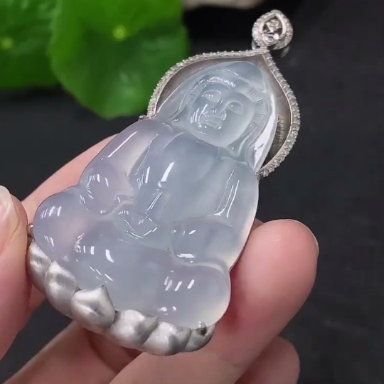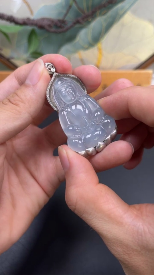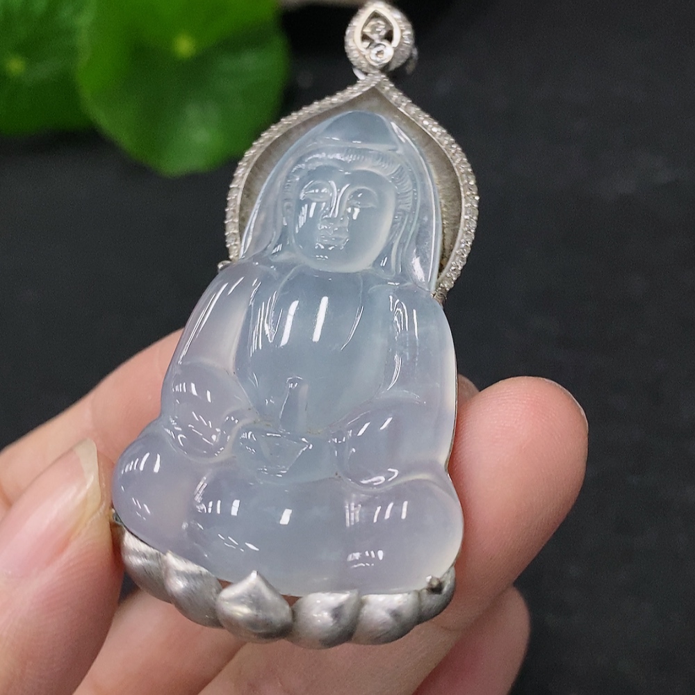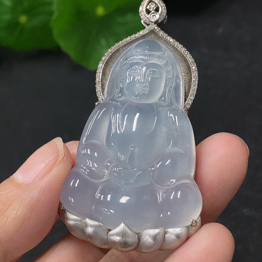 Jadeite Guanyin Pendant in 18K Gold with Diamond Accents, Total Weight Approx. 17.2g