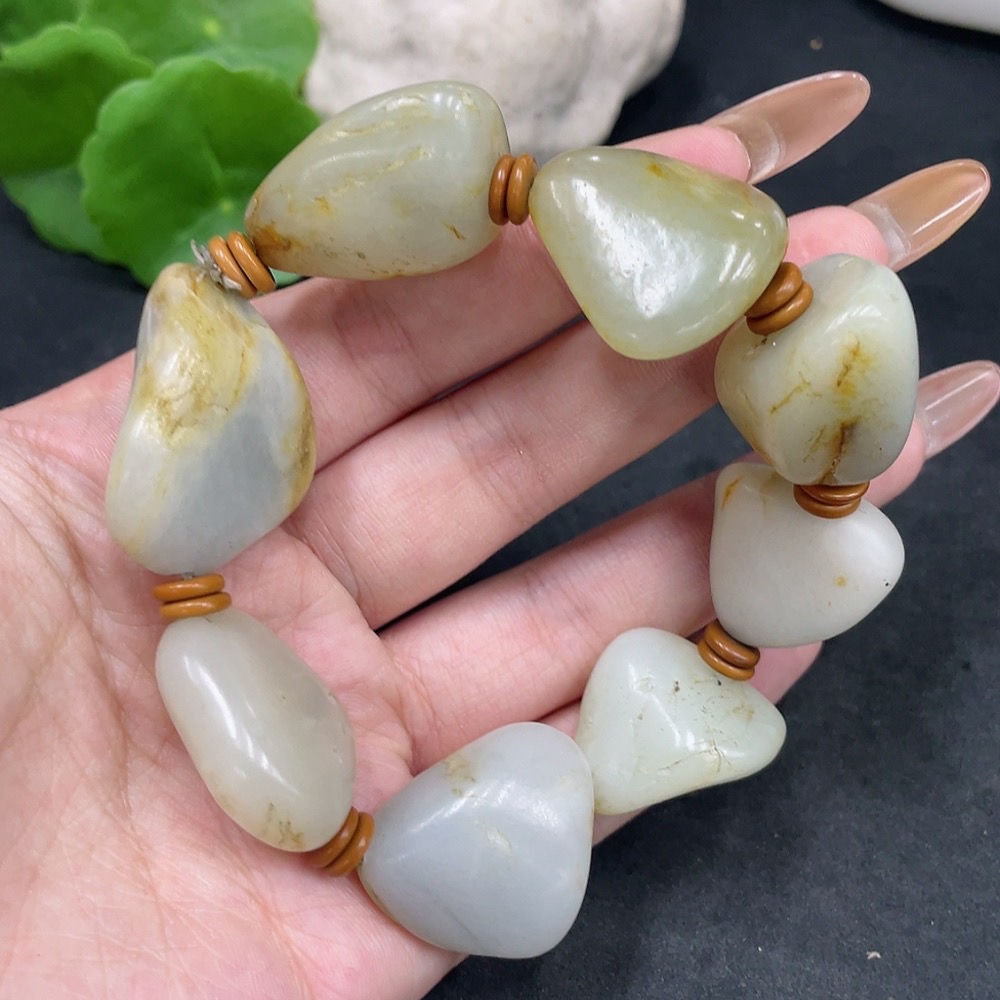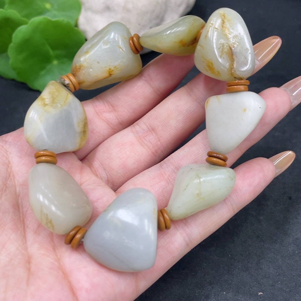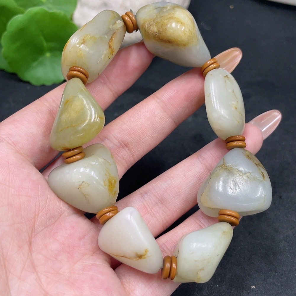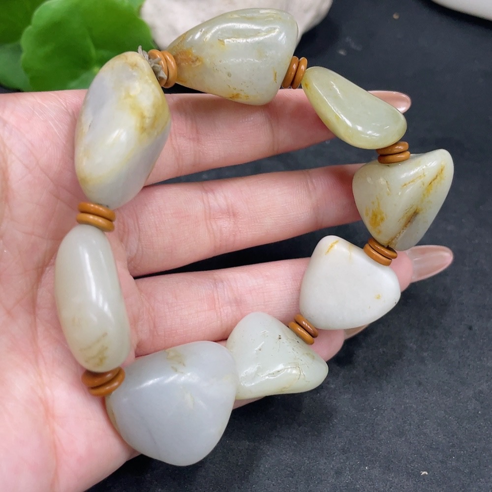Hetian Jade Bracelet, Undetermined Skin Color Origin, Contains Other Mineral Components, Matching Beads Not Hetian Jade, Total Weight Approximately 93g