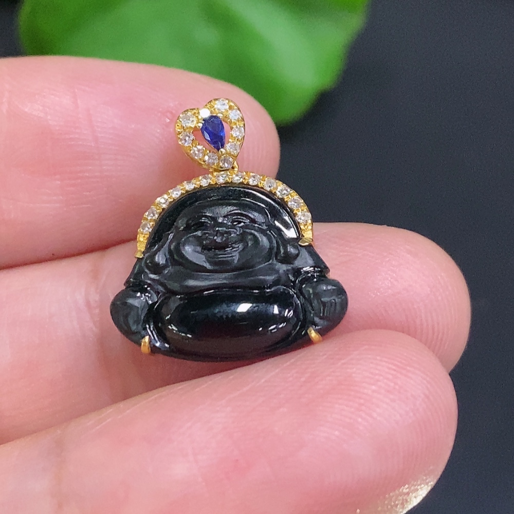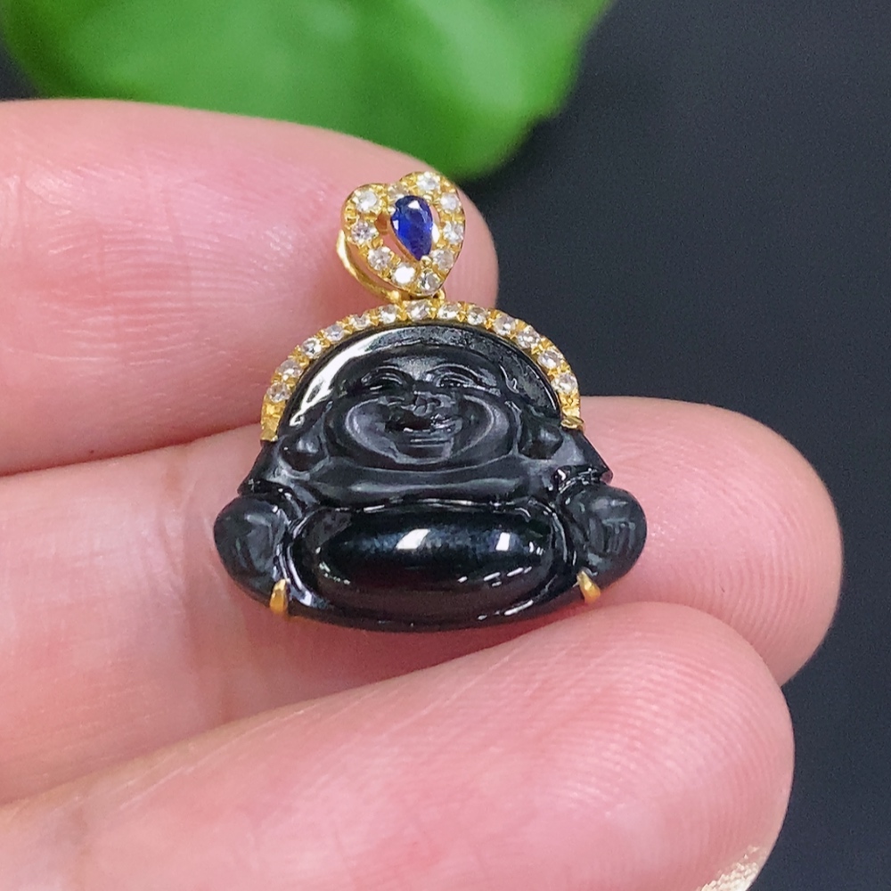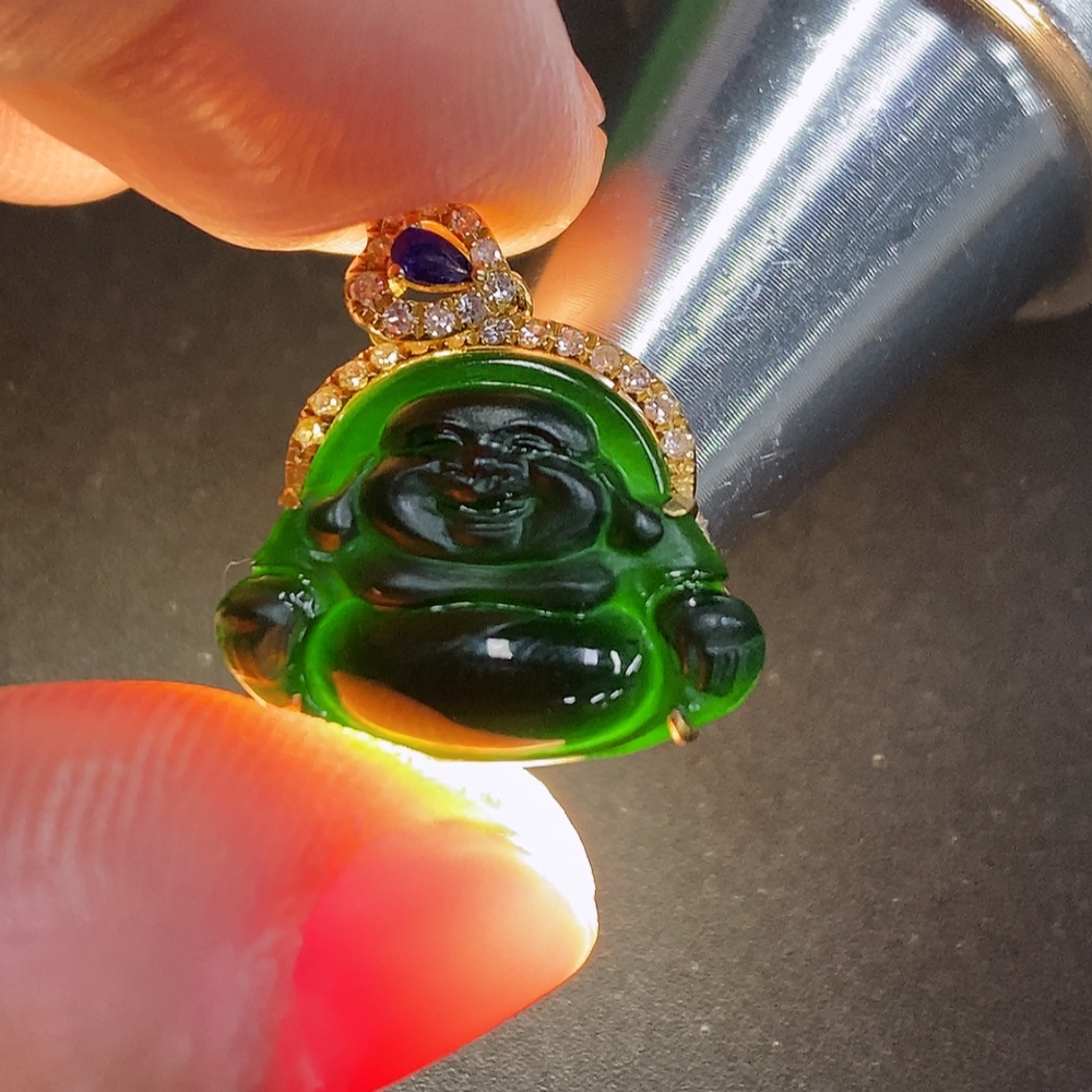 Jadeite Buddha Pendant (18K Gold Bail, 71% Gold Content in Main Body) Total Weight Approximately 1.6g (With Diamond Accents)