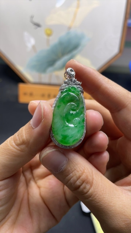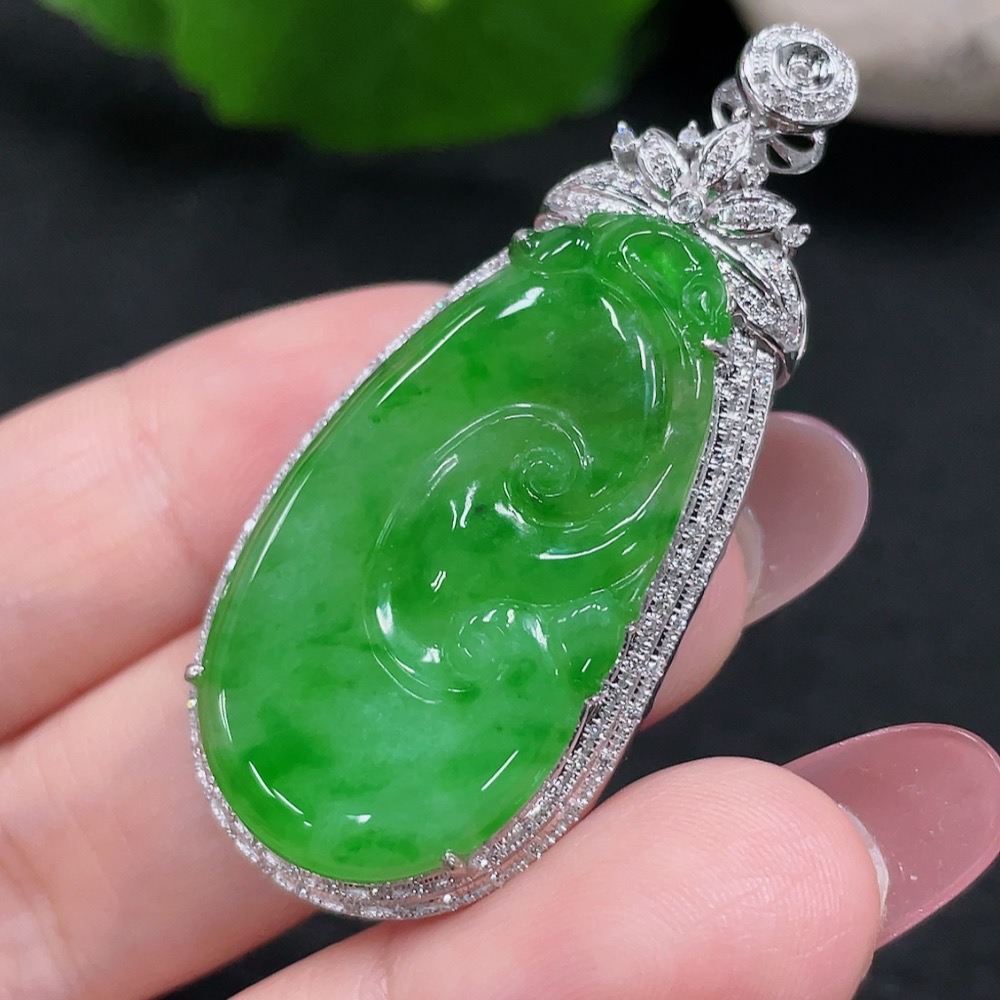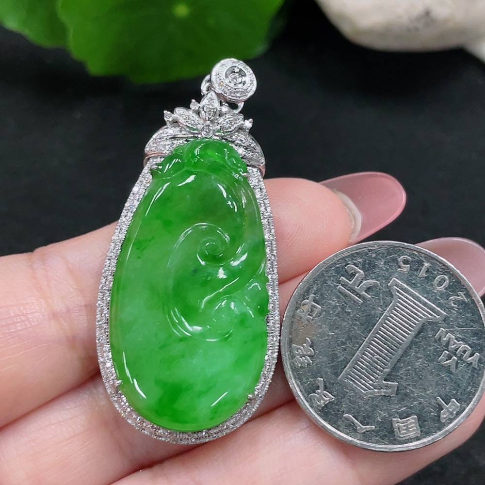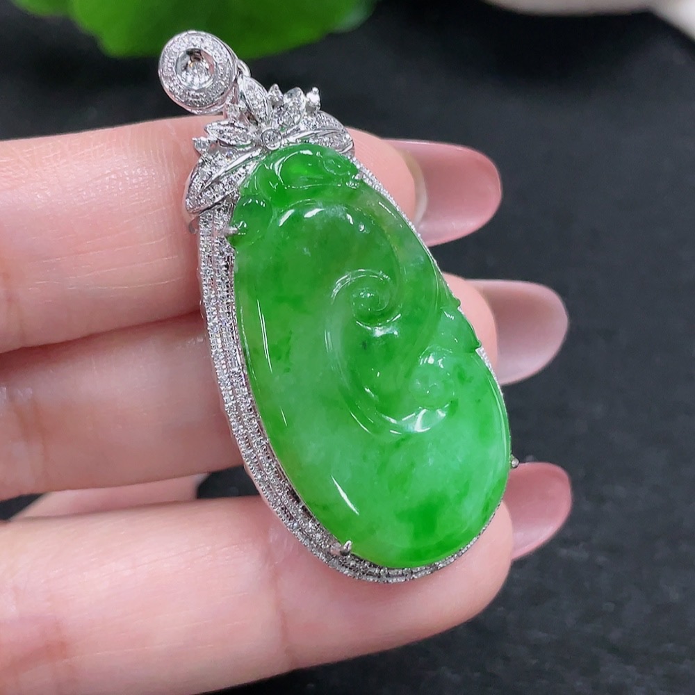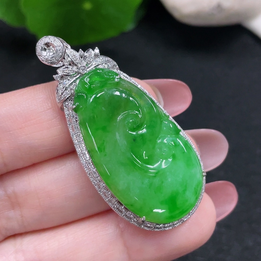 Jadeite Ruyi Pendant Set in 18K Gold Total Weight Approx. 8.7g (With Diamond Accents)