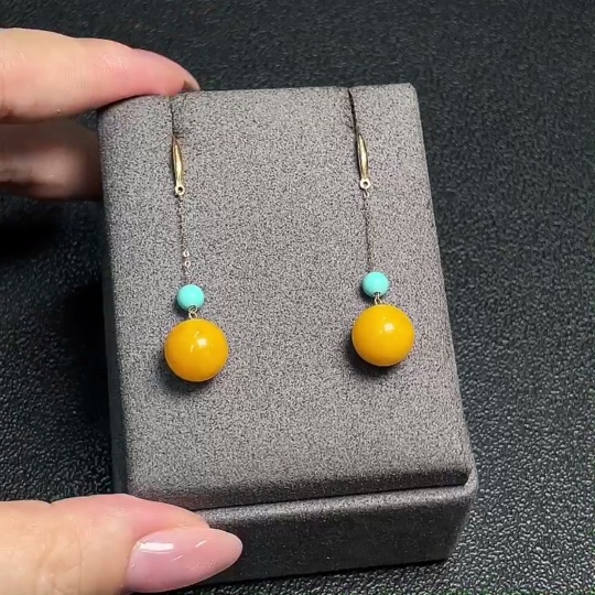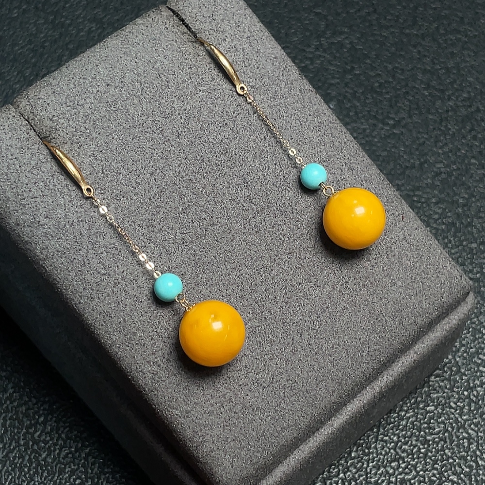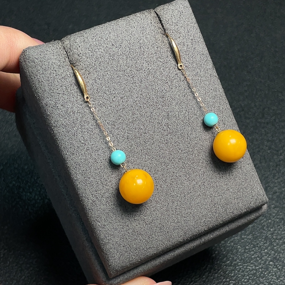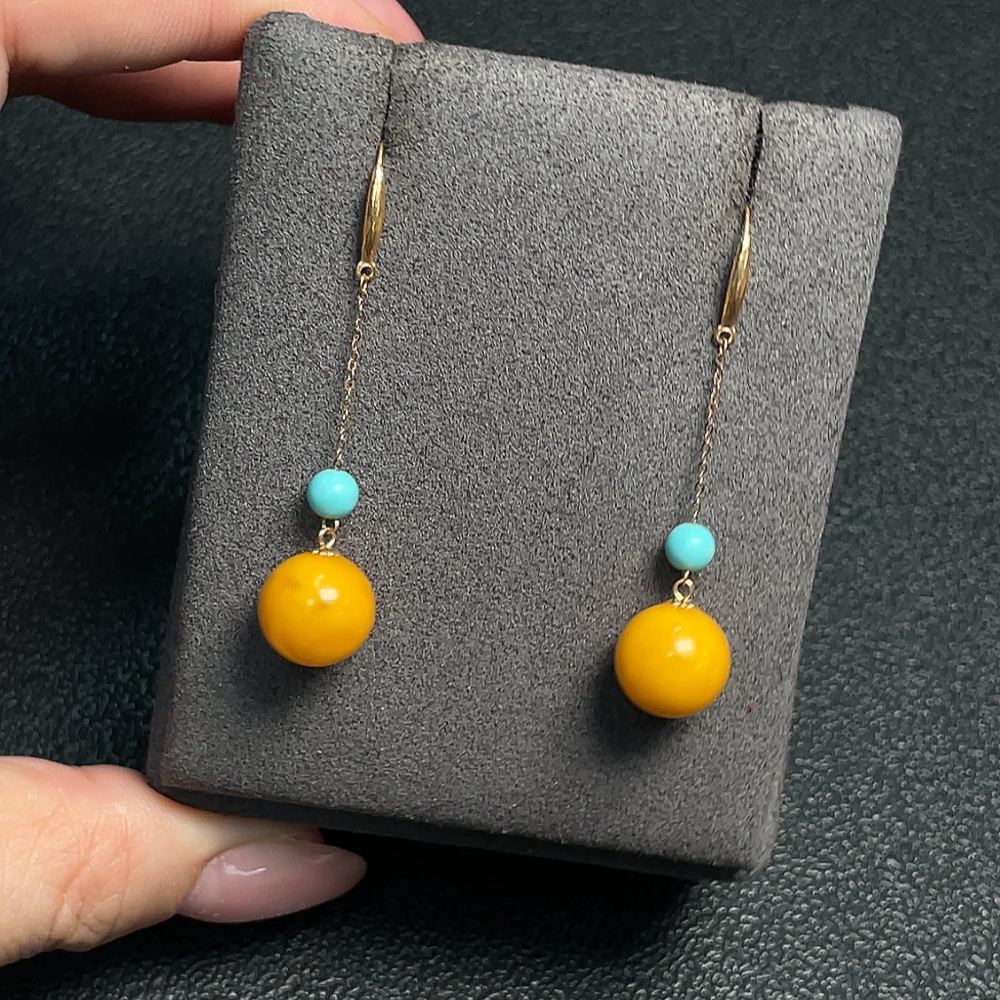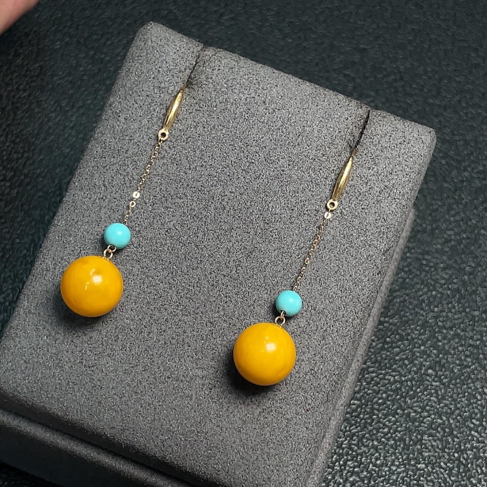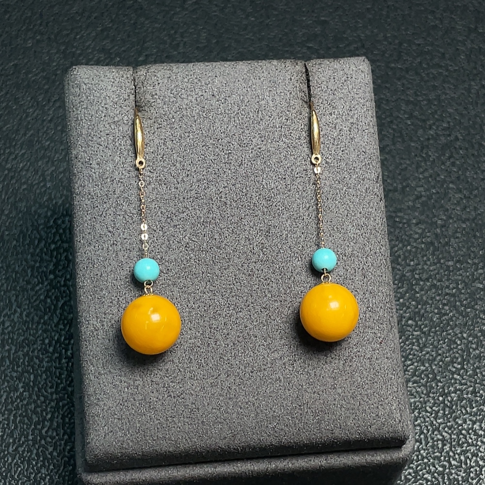 18K gold amber beeswax earrings with non-natural stones, total weight approx. 1.61g, size approx. 10mm
