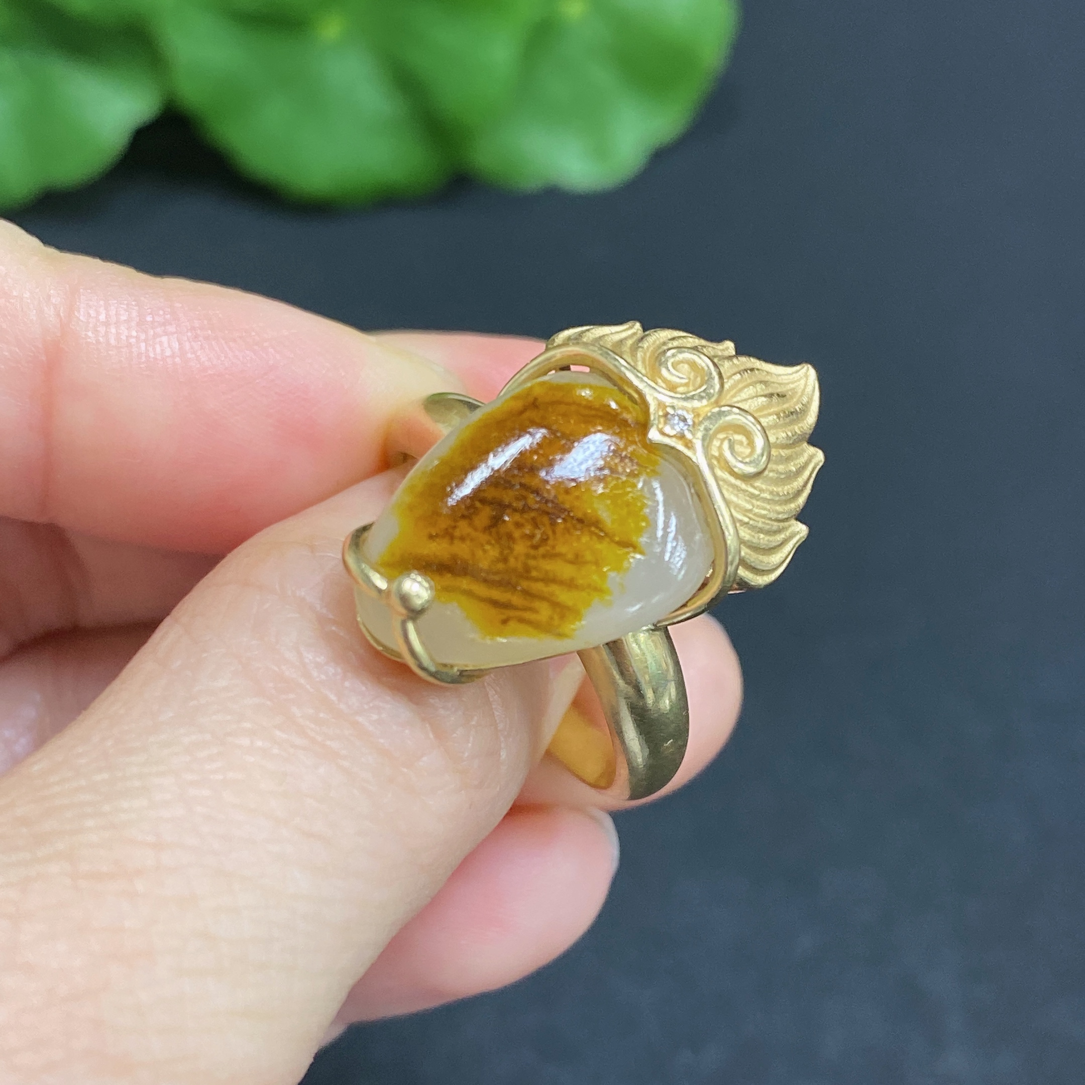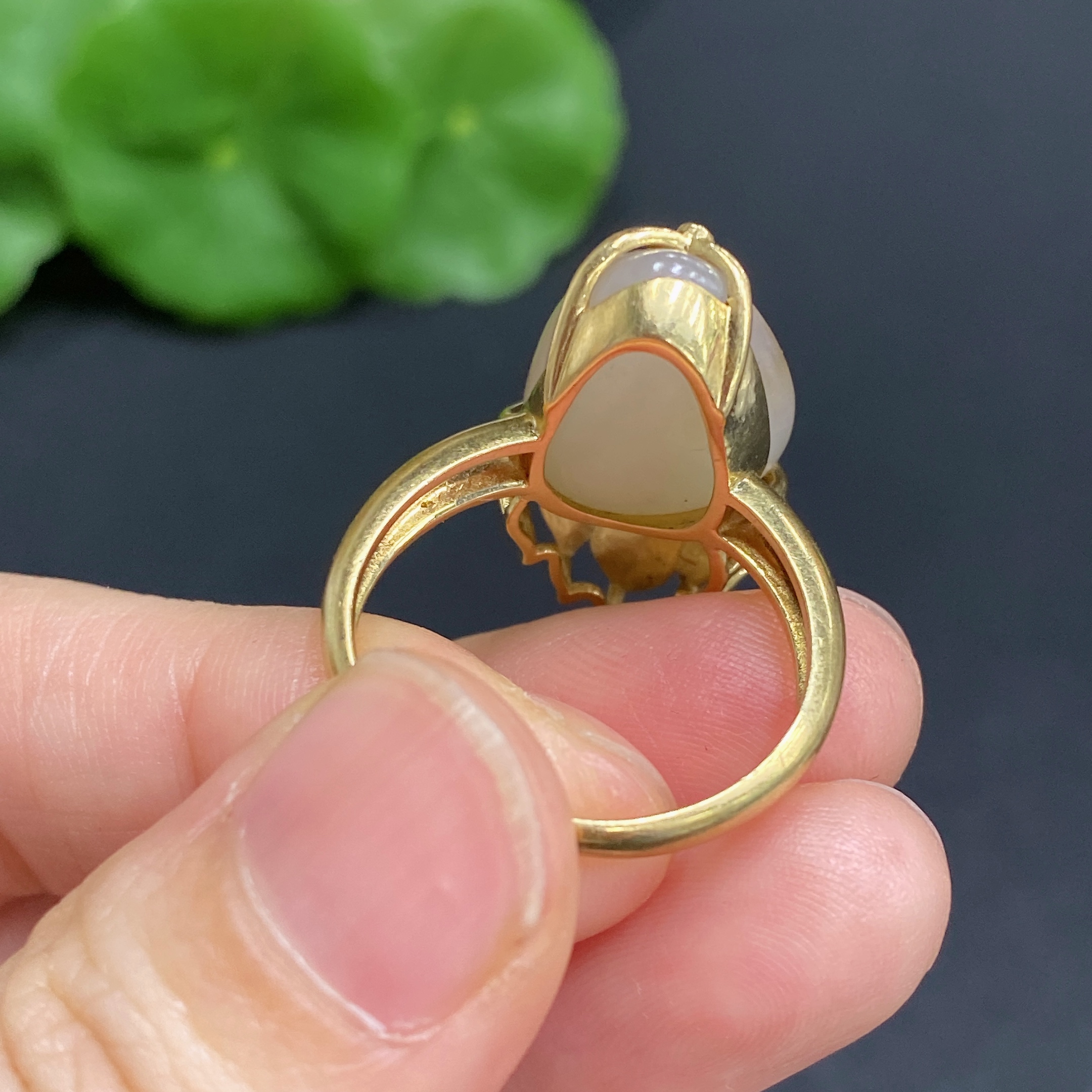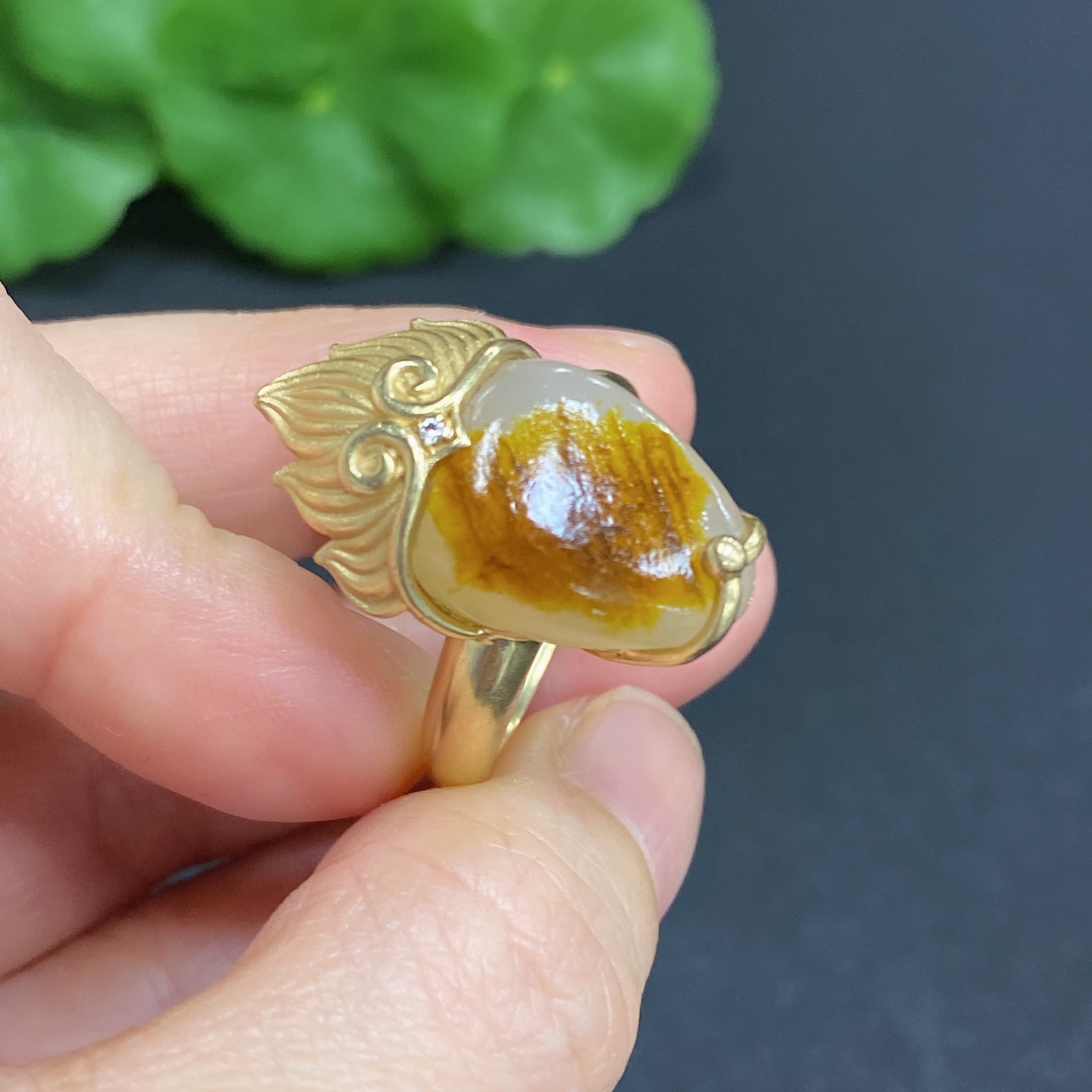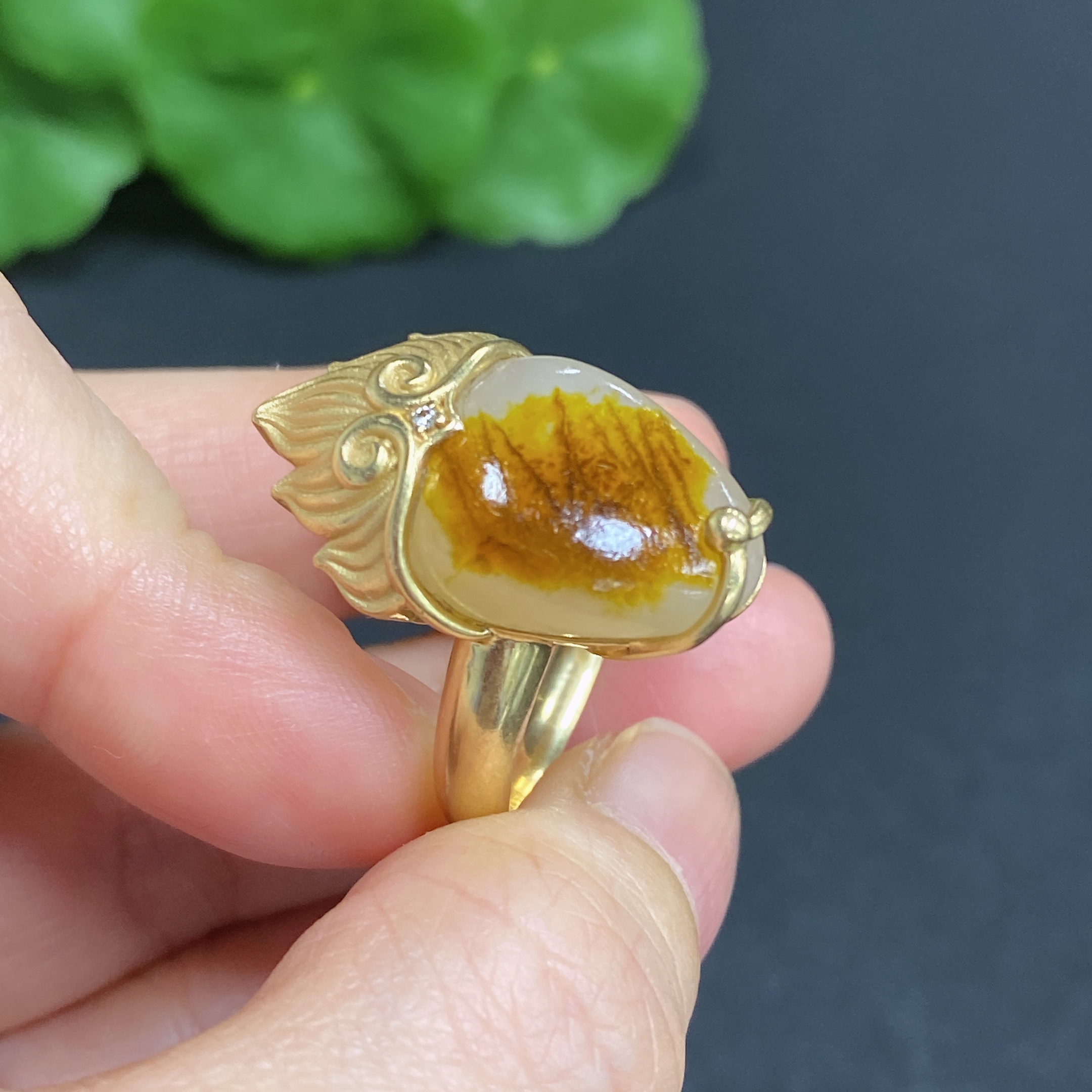 Hetian Jade Inlaid Ring (Undetermined Skin Color Cause) 18K Gold Size 19.5 Total Weight Approx. 9.3g