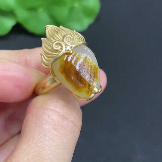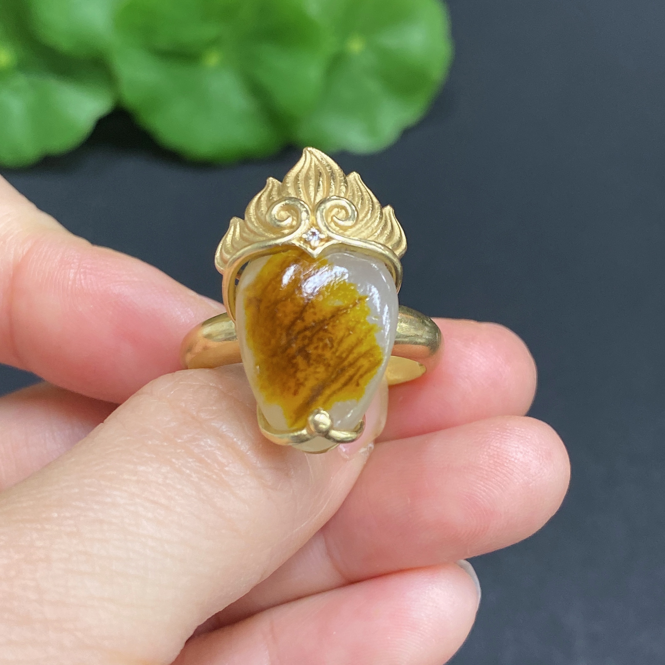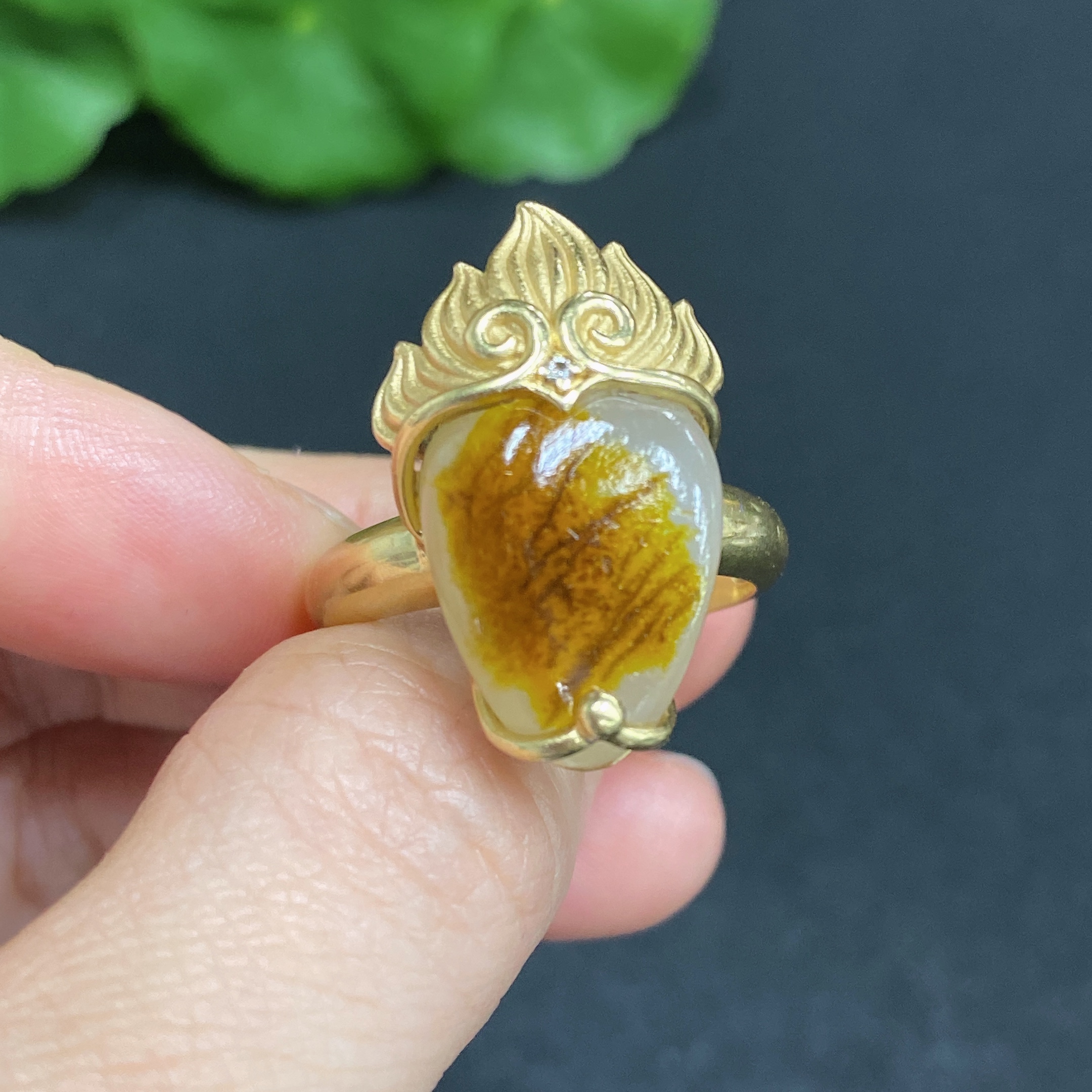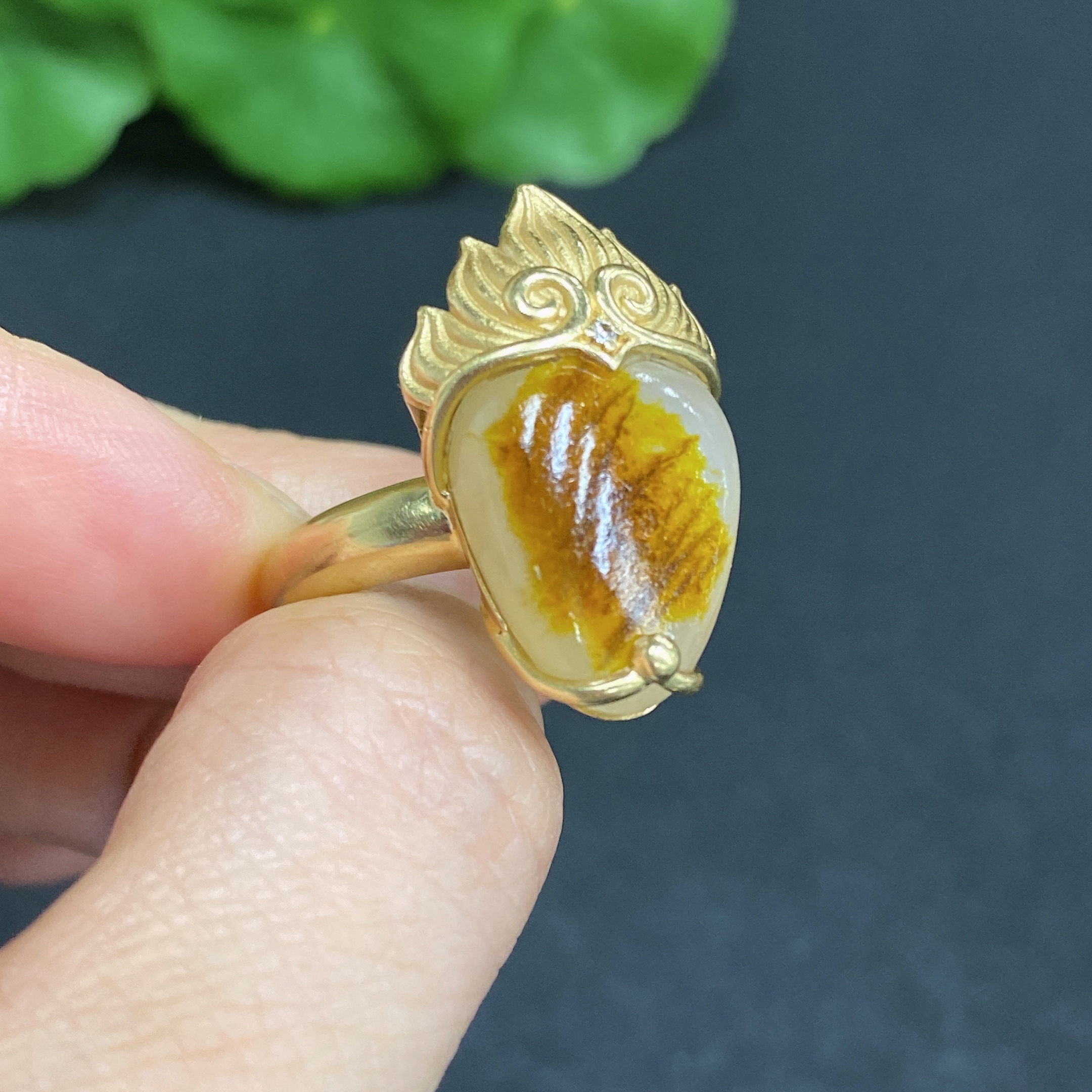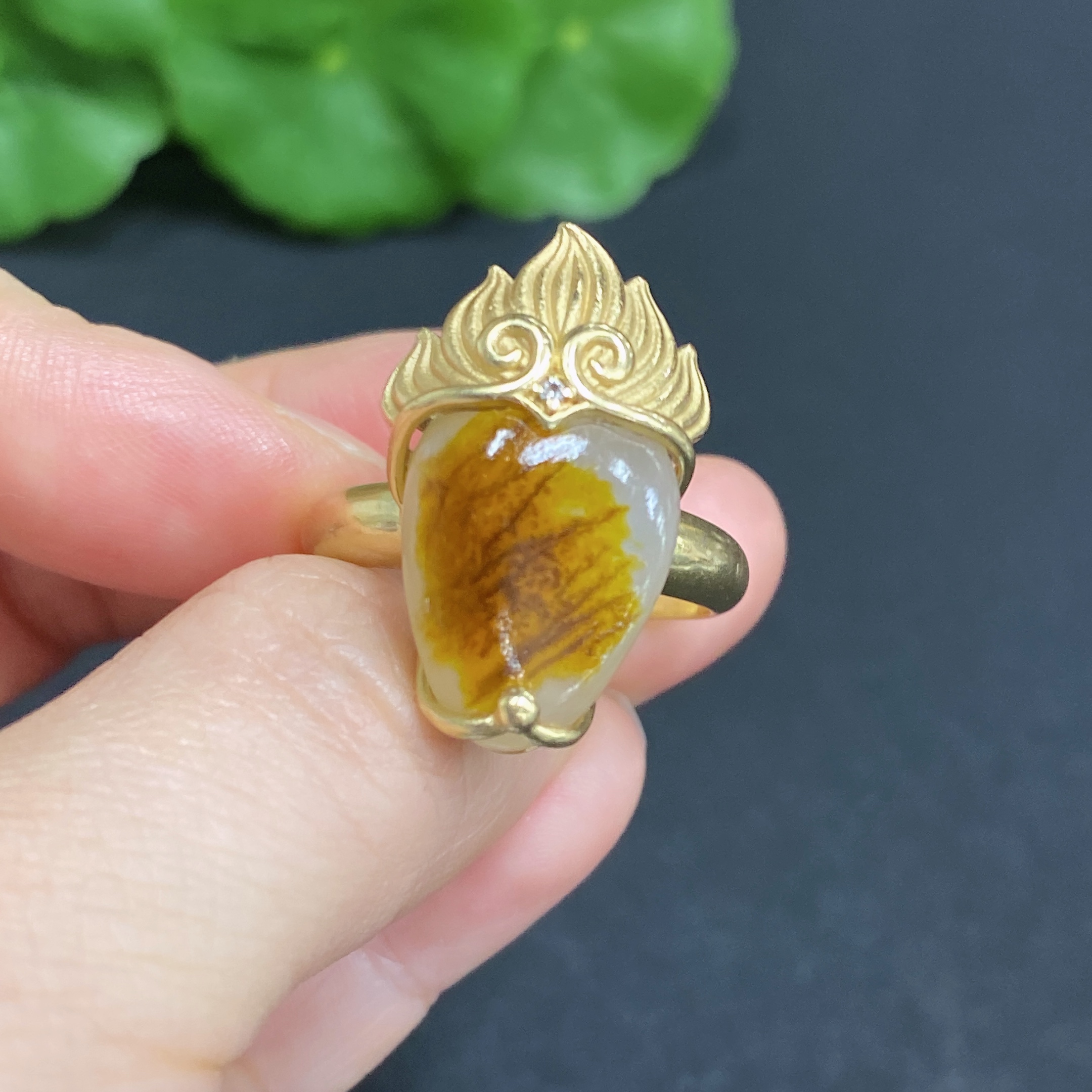 Hetian Jade Inlaid Ring (Undetermined Skin Color Cause) 18K Gold Size 19.5 Total Weight Approx. 9.3g