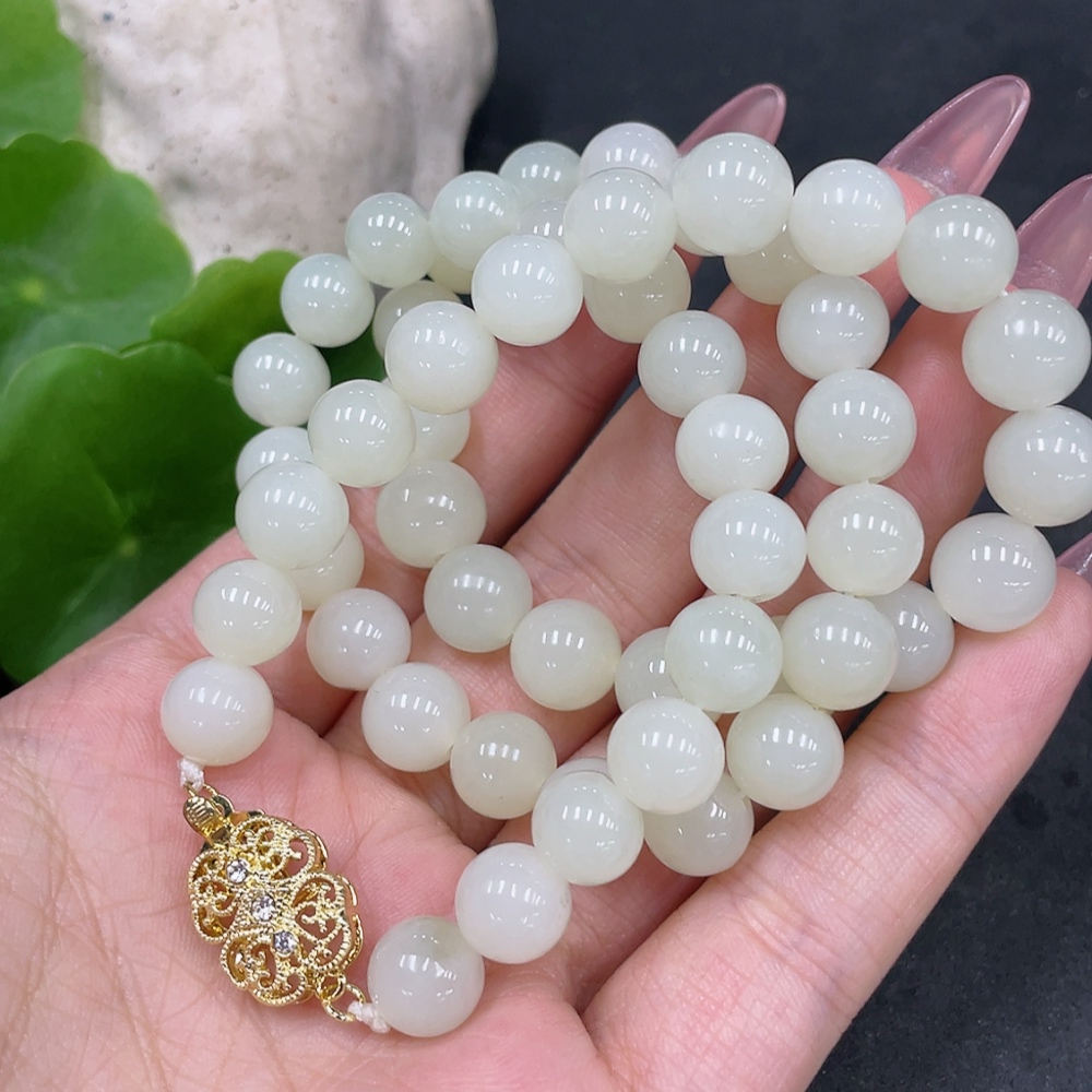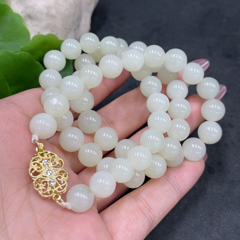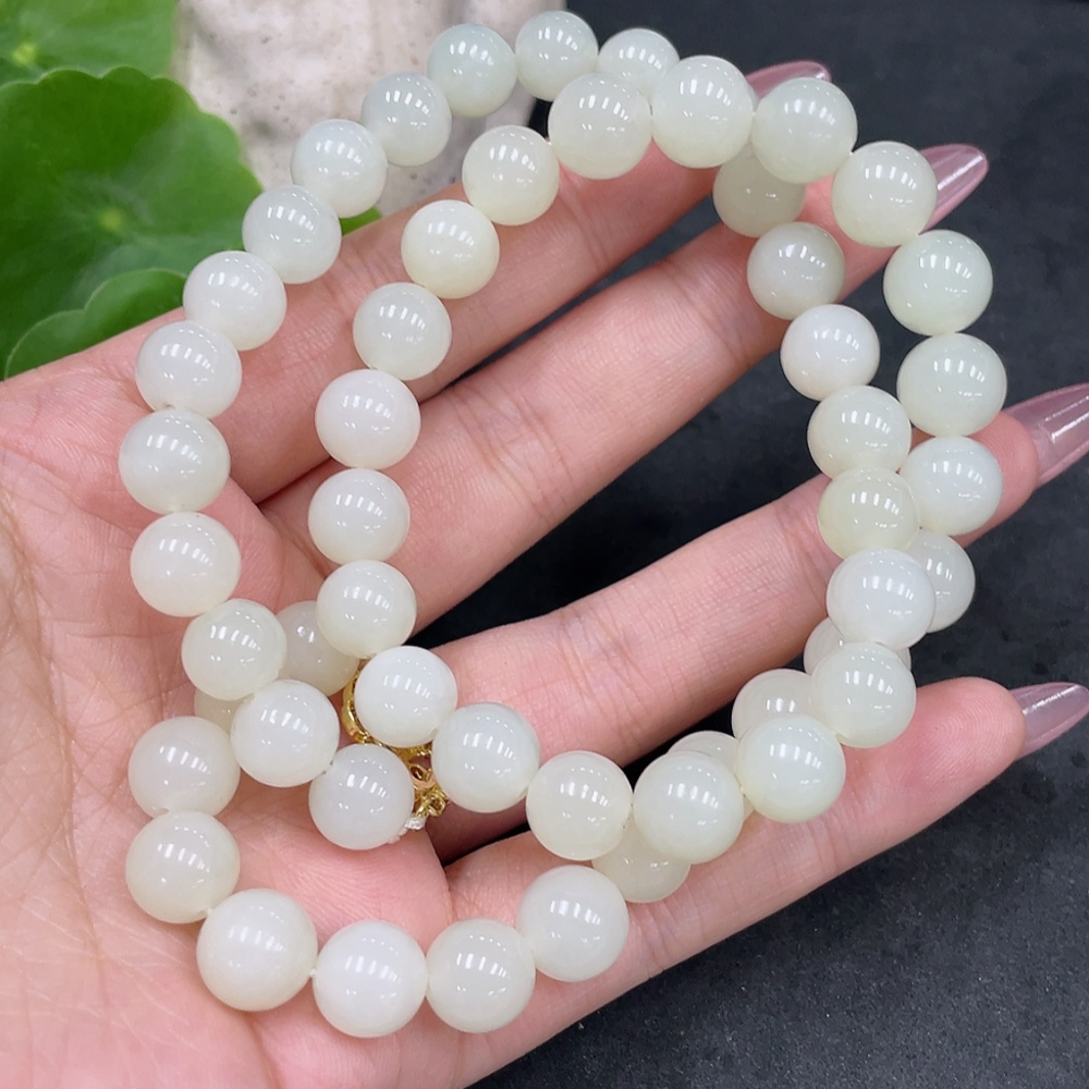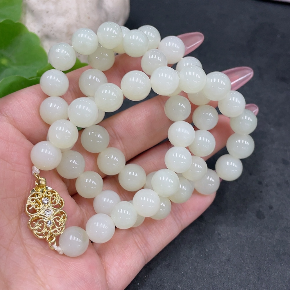Hetian Jade Bead Necklace, Approx. 8.9mm, Non-Gold-Inlaid, Total Weight Approx. 62.7g
