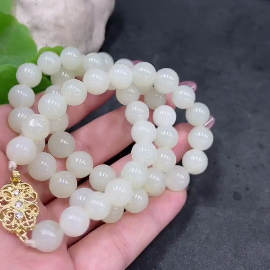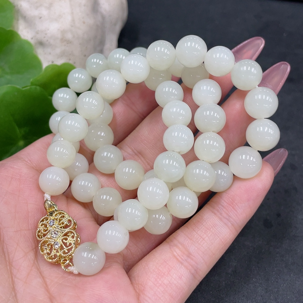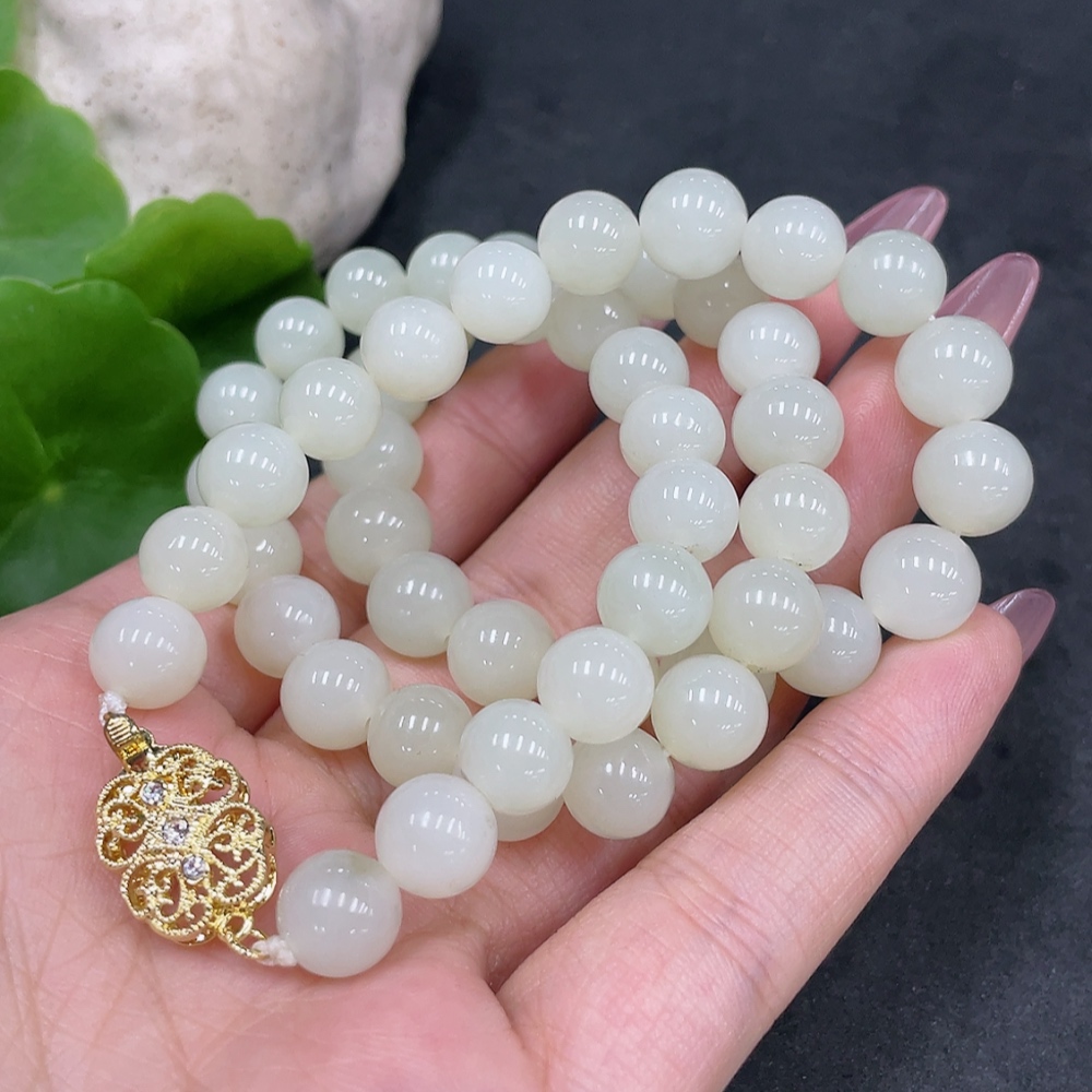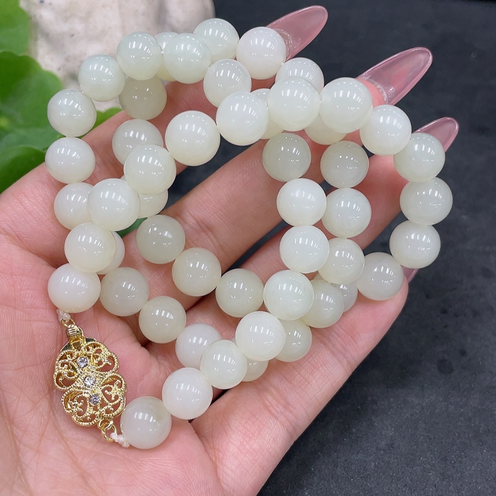 Hetian Jade Bead Necklace, Approx. 8.9mm, Non-Gold-Inlaid, Total Weight Approx. 62.7g