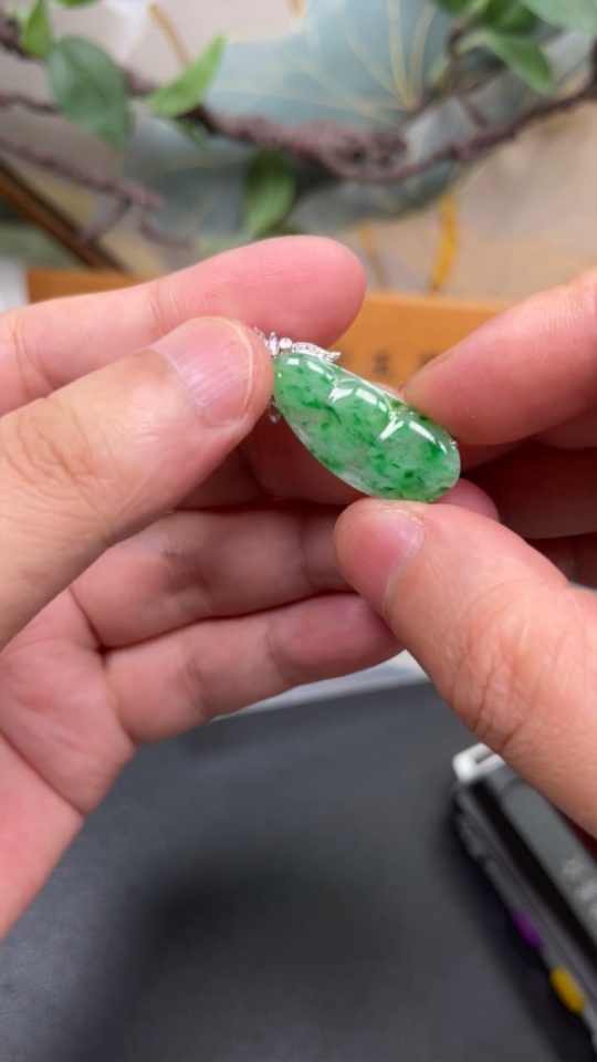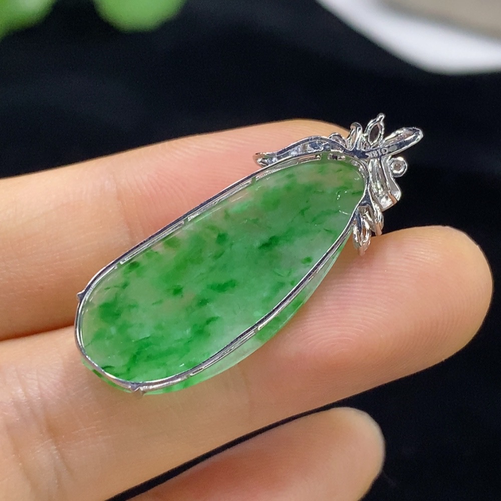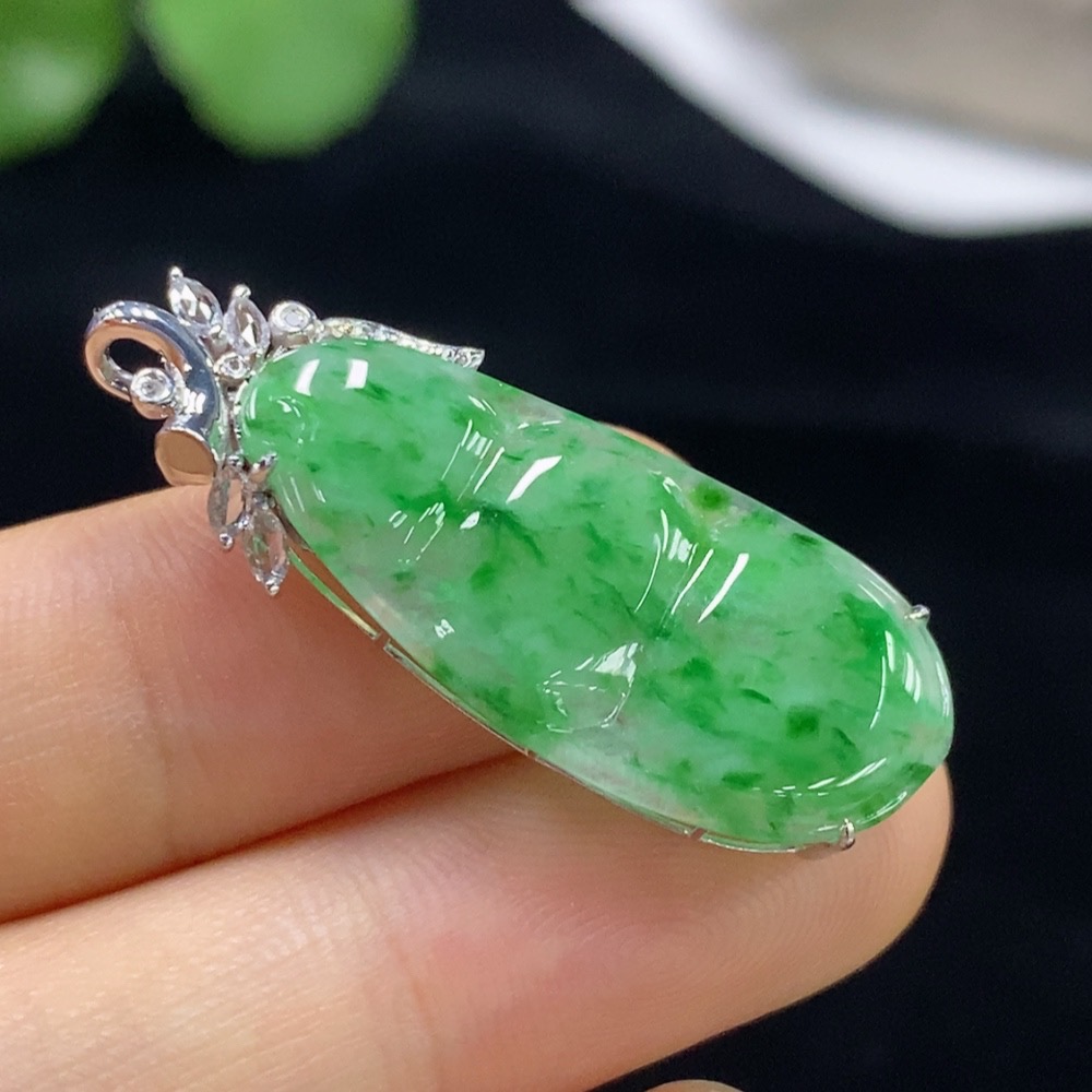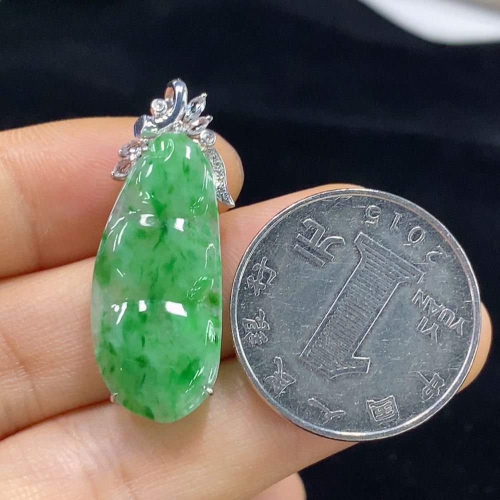 Jadeite auspicious bean inlaid pendant with 18k gold and diamond accents (smallest accent stones only), total product weight approximately 2.74g