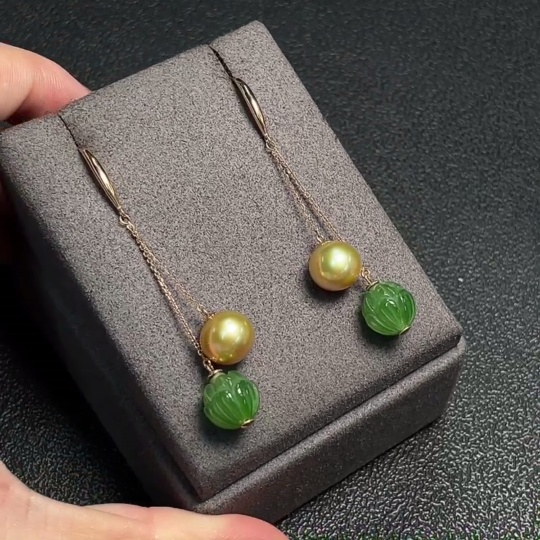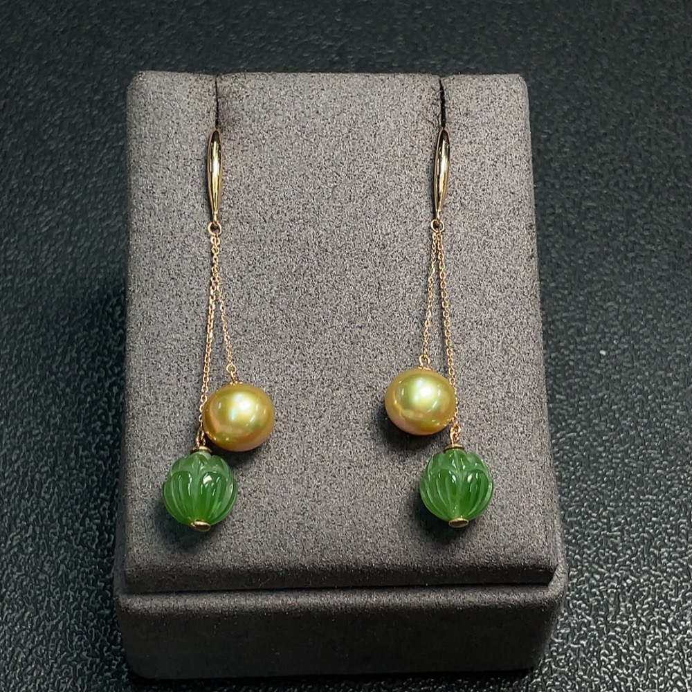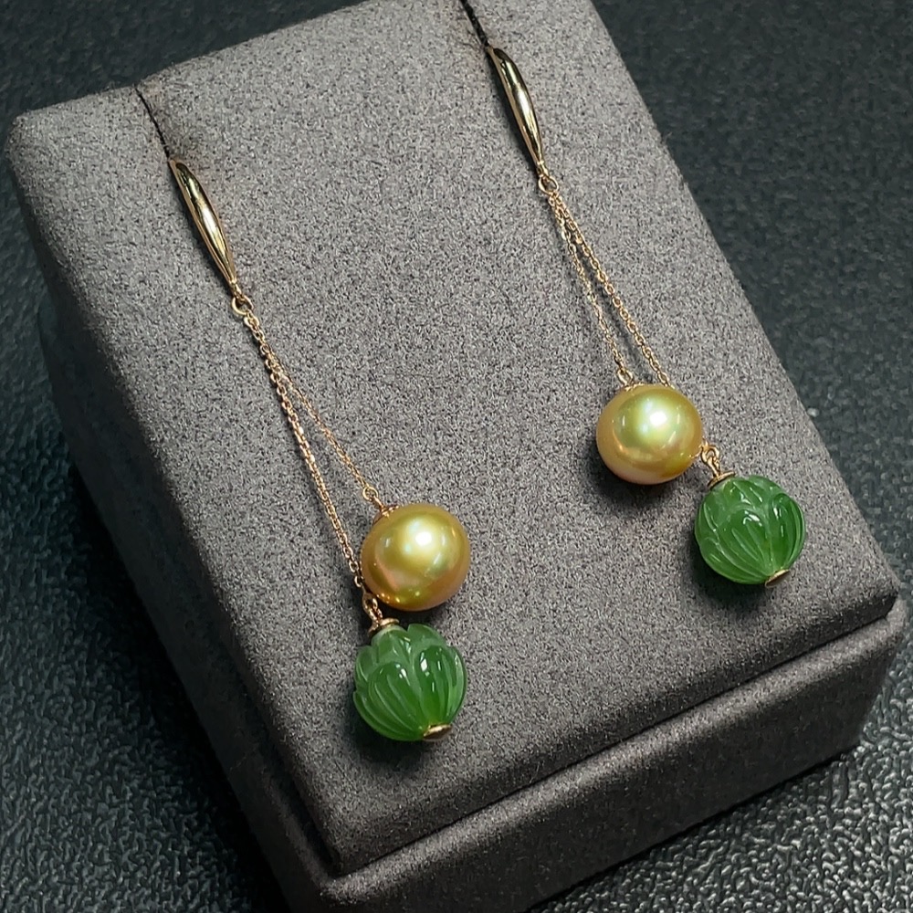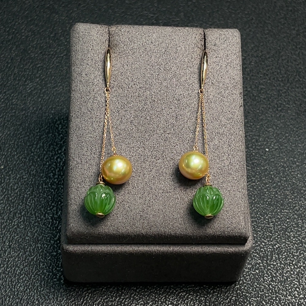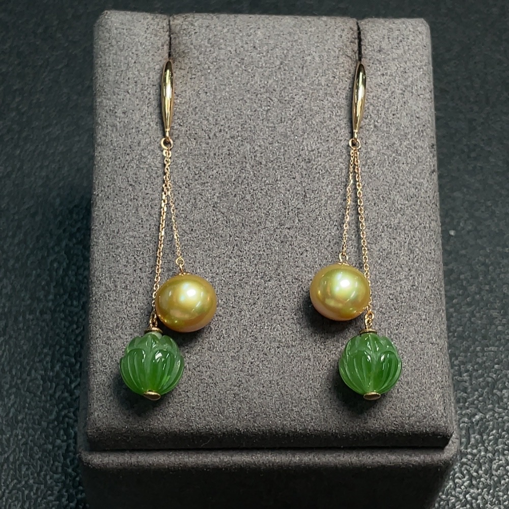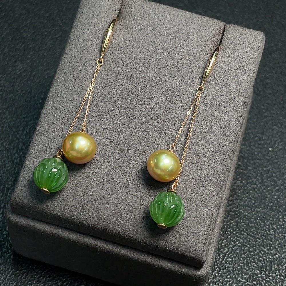 18K Seawater Pearl Earrings with Hetian Jade, Color Origin Undetermined, Total Weight Approx. 6.1g, Size ~9mm