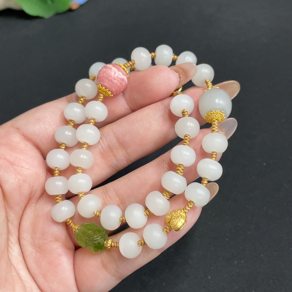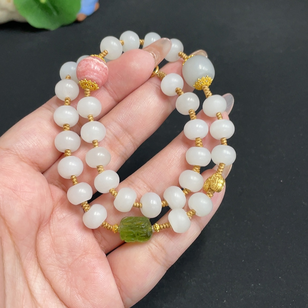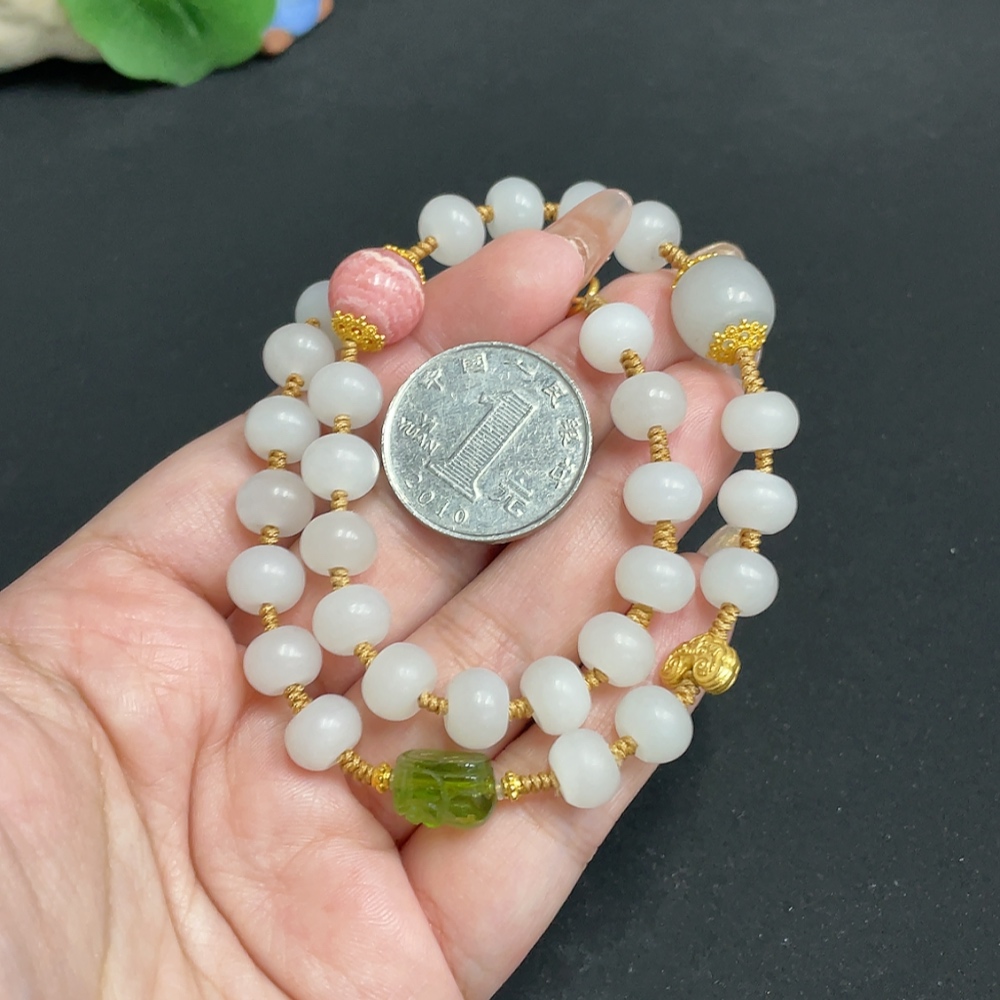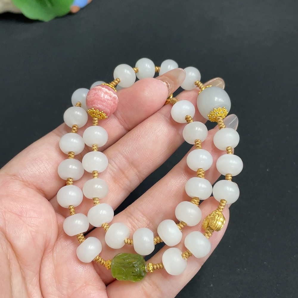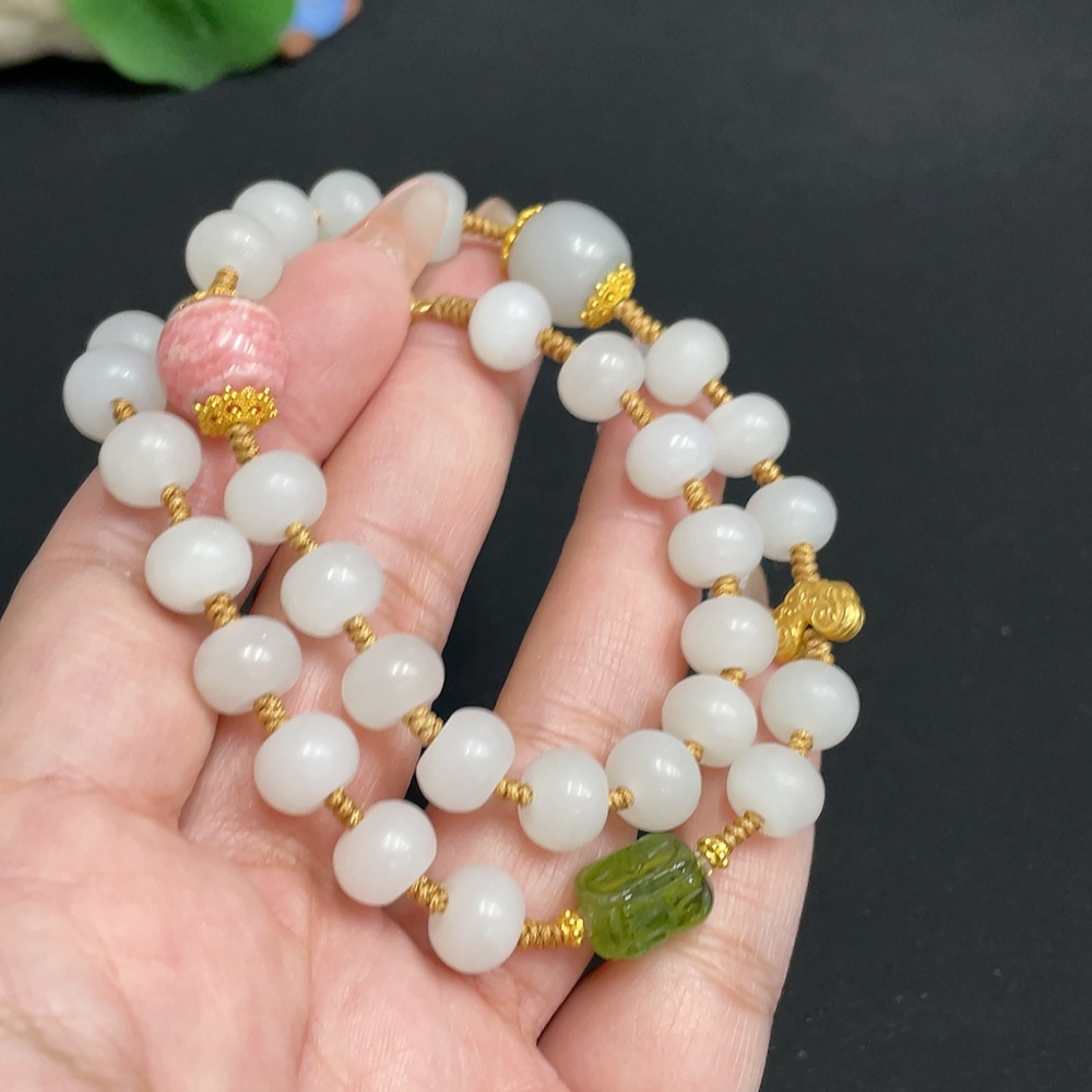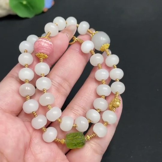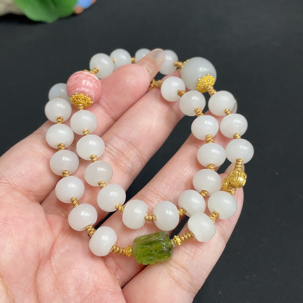 Hetian Jade Bead Necklace, Approx. 8.6mm, Total Weight About 37.7g, Containing Other Mineral Components, Non-Hetian Jade Beads, Gold Content 71%
