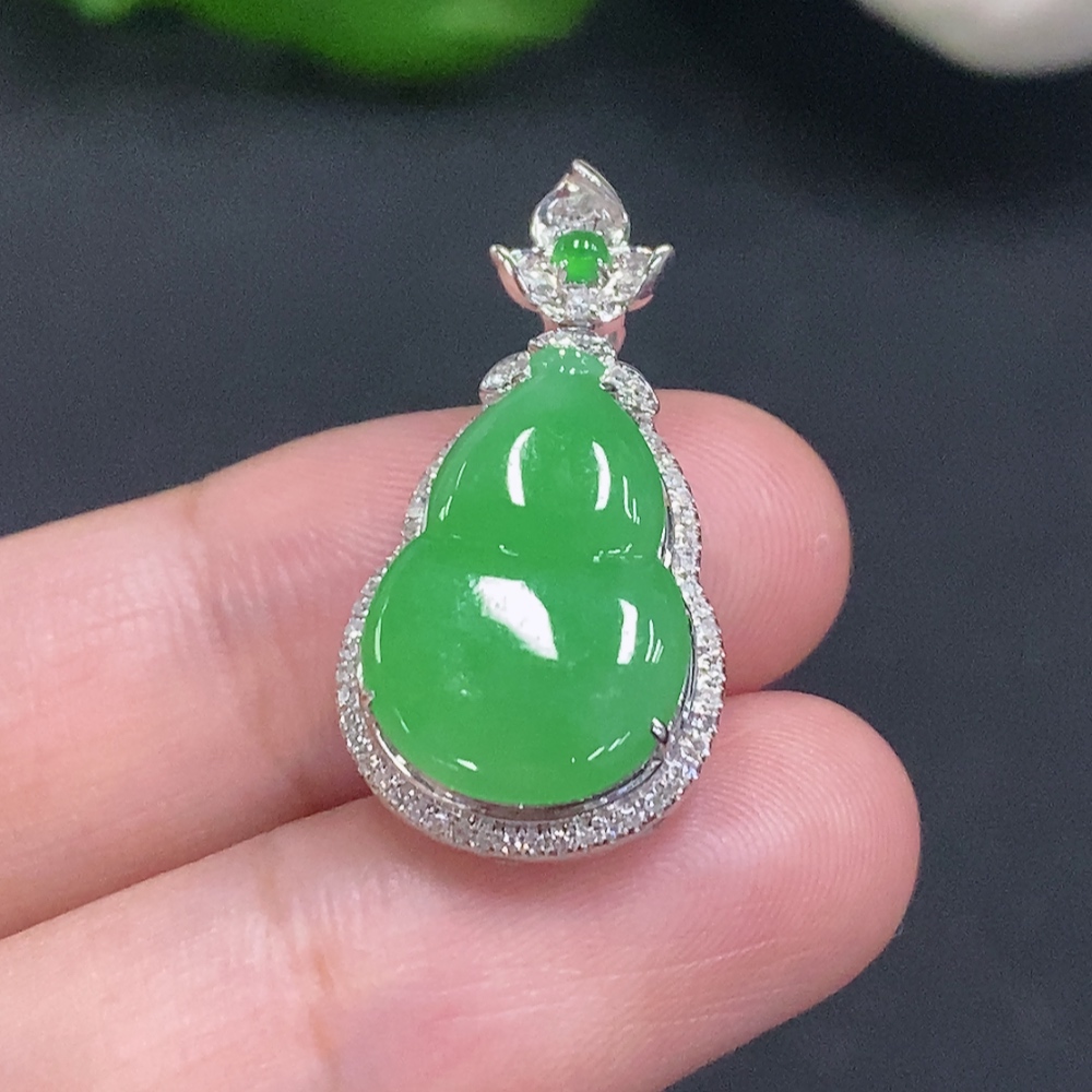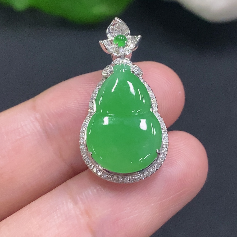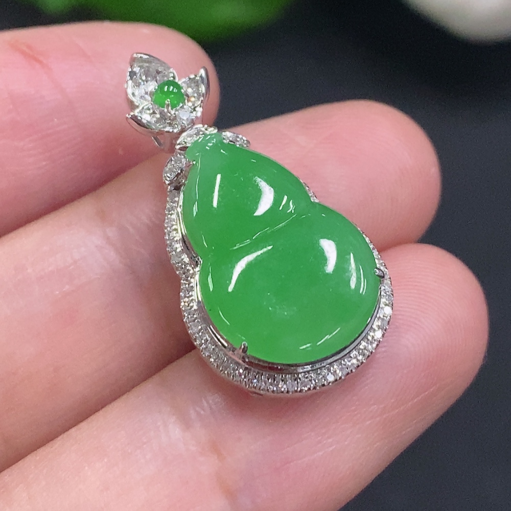 Jadeite Gourd Pendant with 18k Gold Setting, Total Weight Approx. 3.39g, Accented with Diamonds