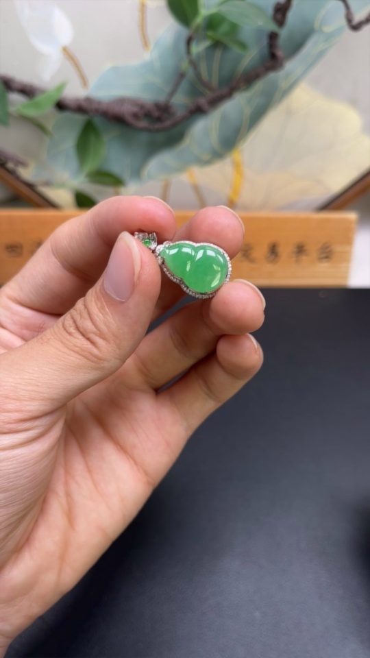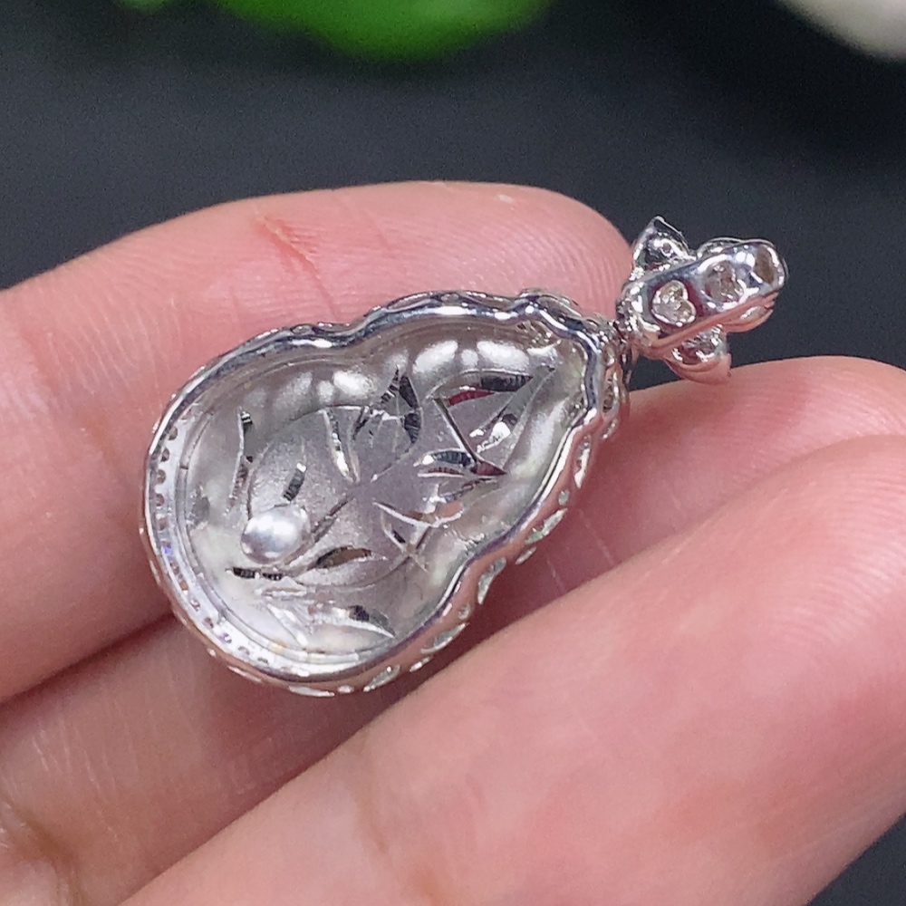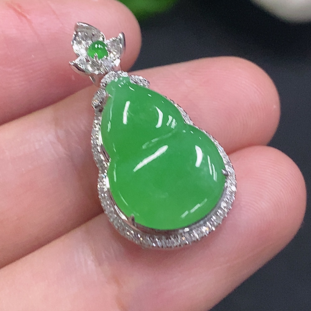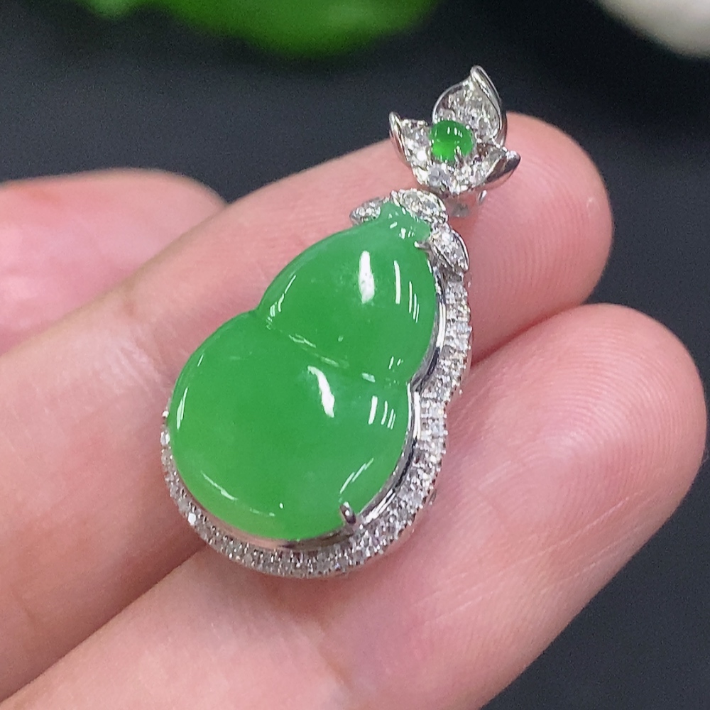 Jadeite Gourd Pendant with 18k Gold Setting, Total Weight Approx. 3.39g, Accented with Diamonds
