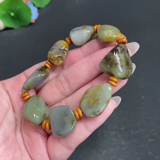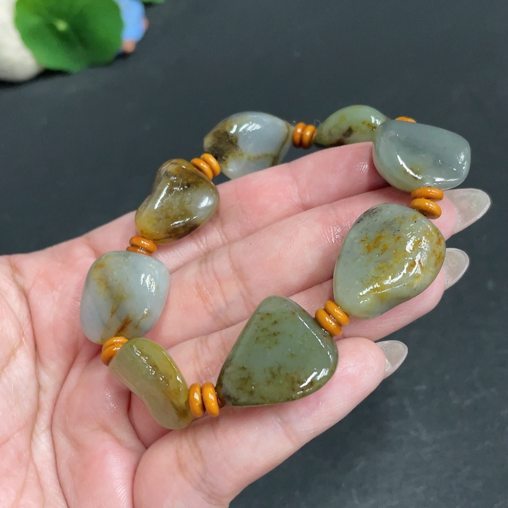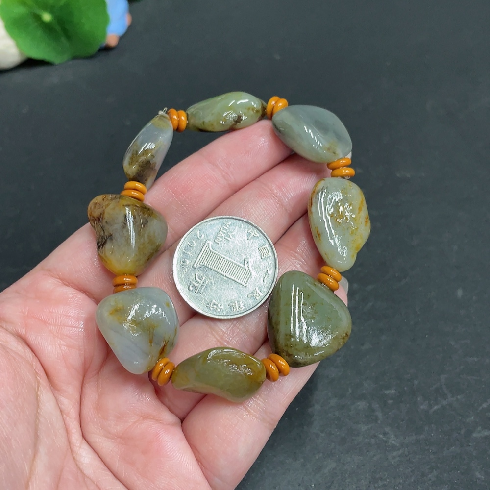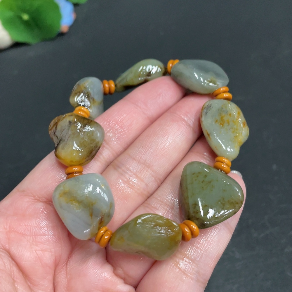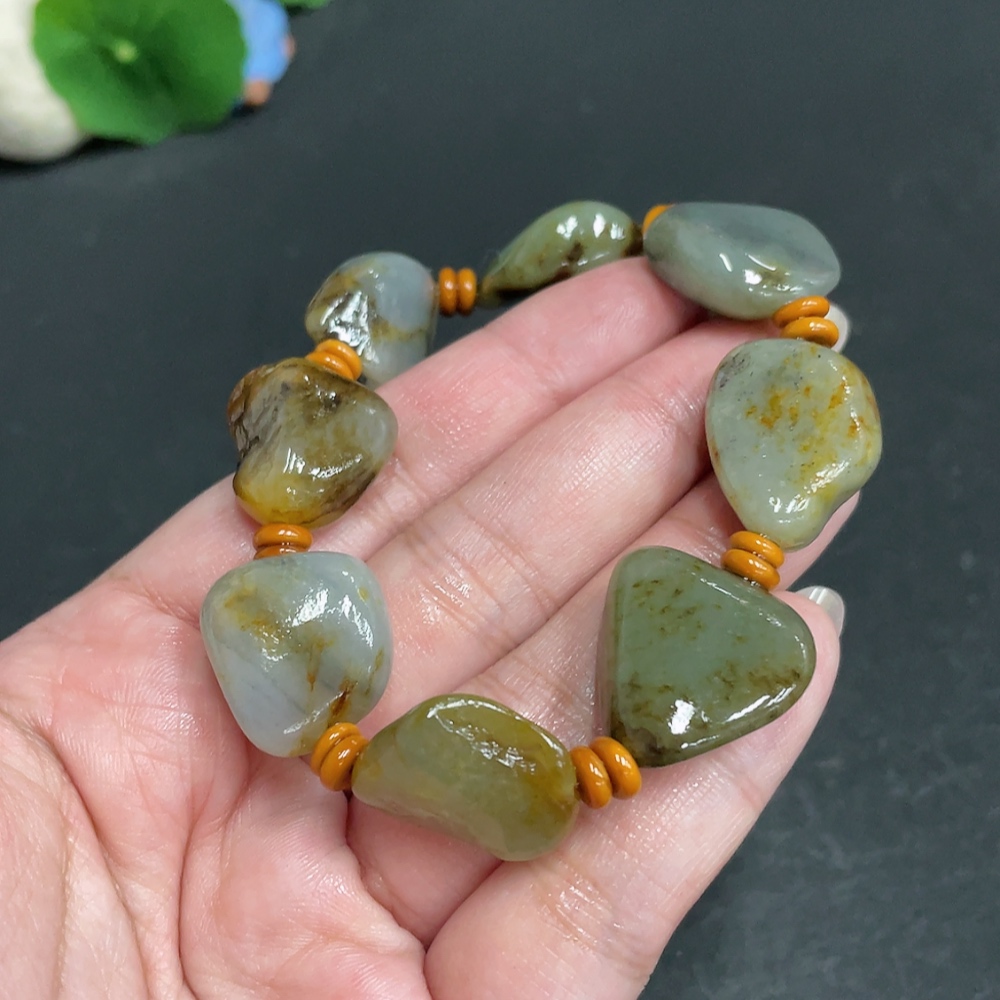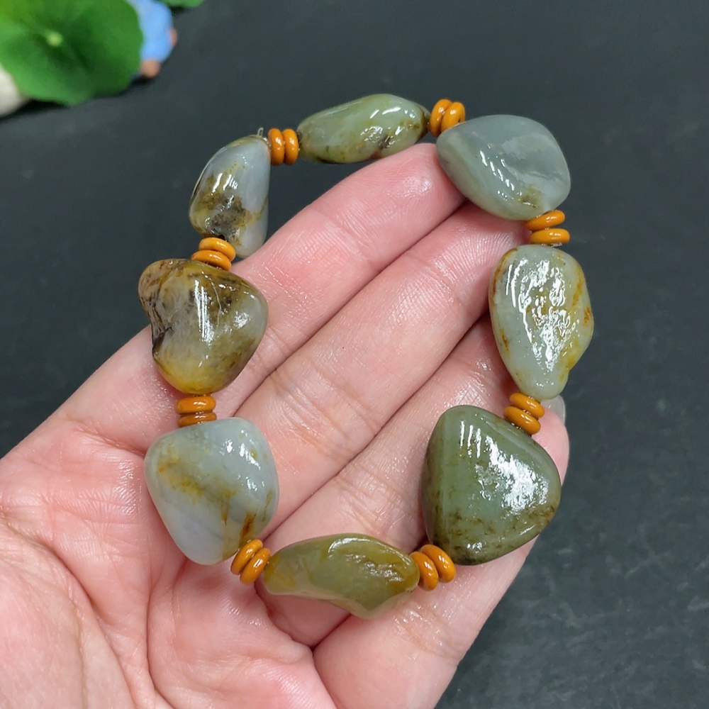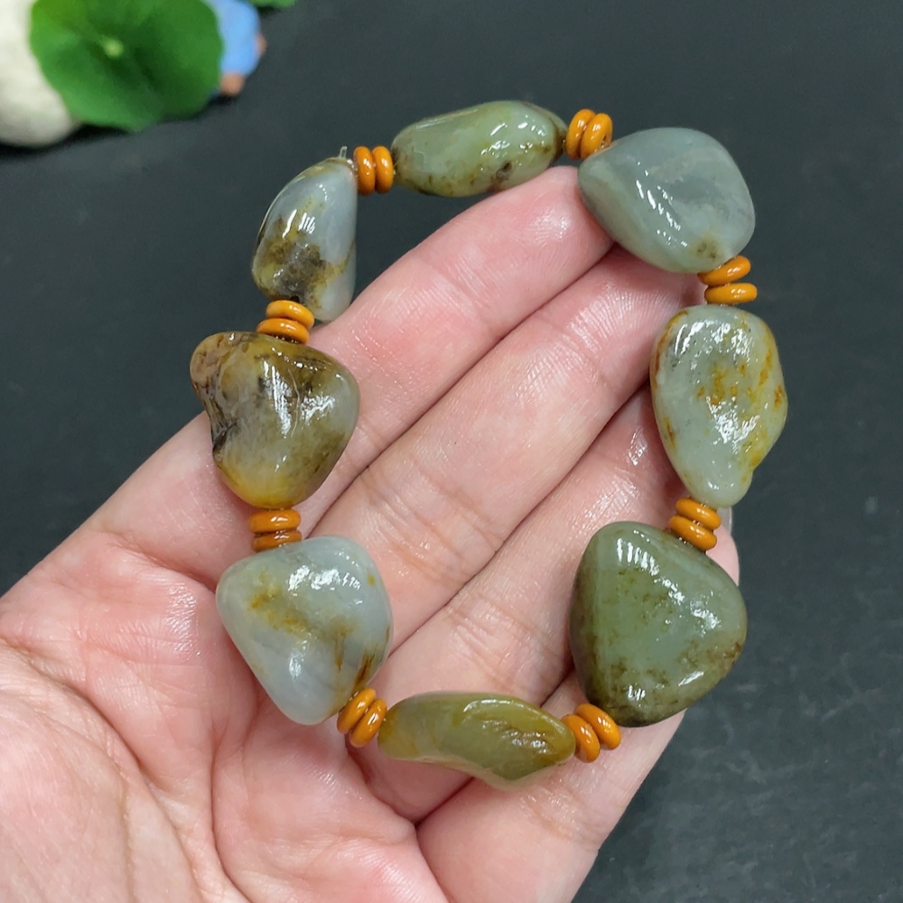 Hetian Jade Bracelet with Other Mineral Components, Undetermined Skin Color Origin, Non-Hetian Jade Beads, Total Weight Approximately 46.3g