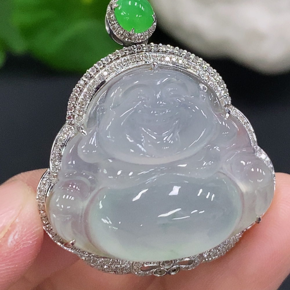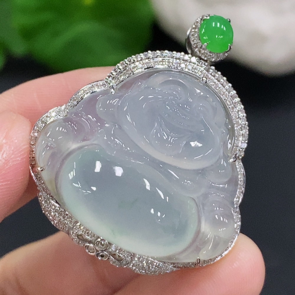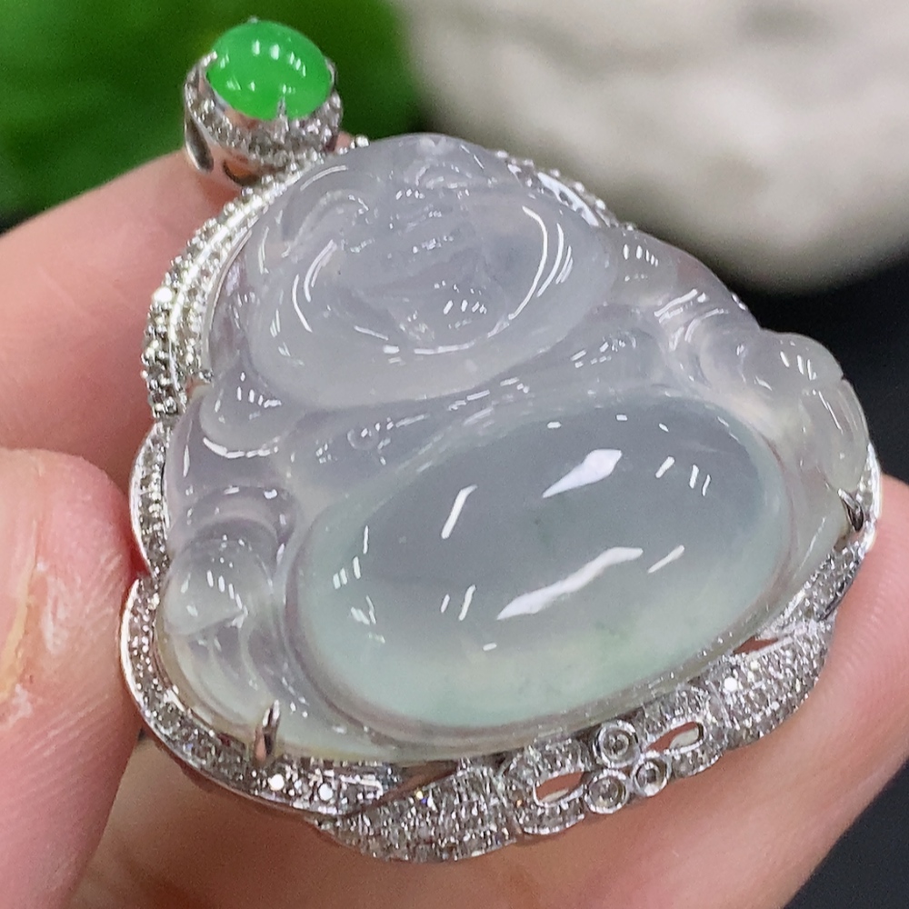 Jadeite Buddha Pendant Set in 18K Gold with Diamonds, Total Weight Approx. 11.7g