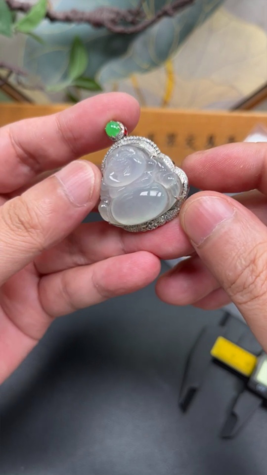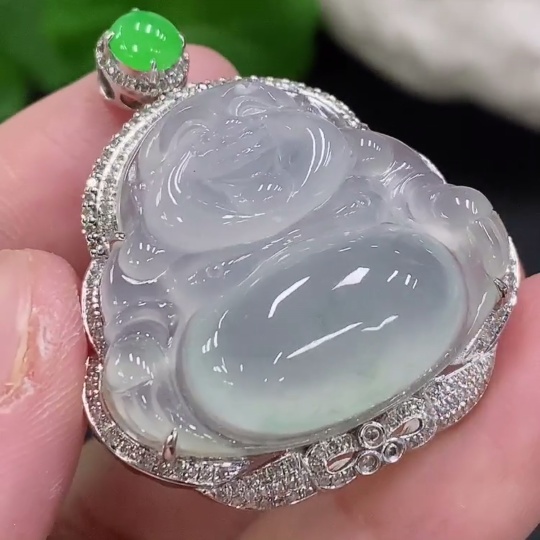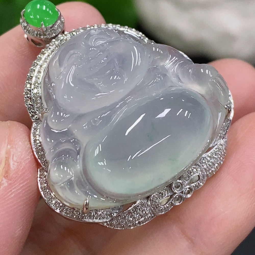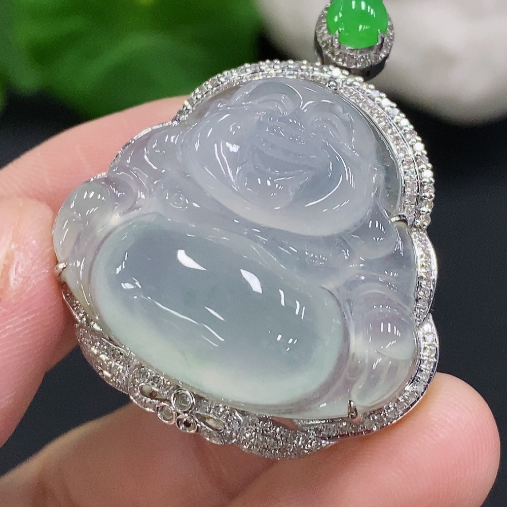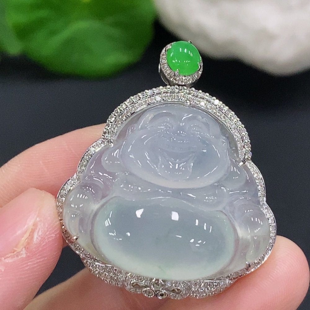 Jadeite Buddha Pendant Set in 18K Gold with Diamonds, Total Weight Approx. 11.7g