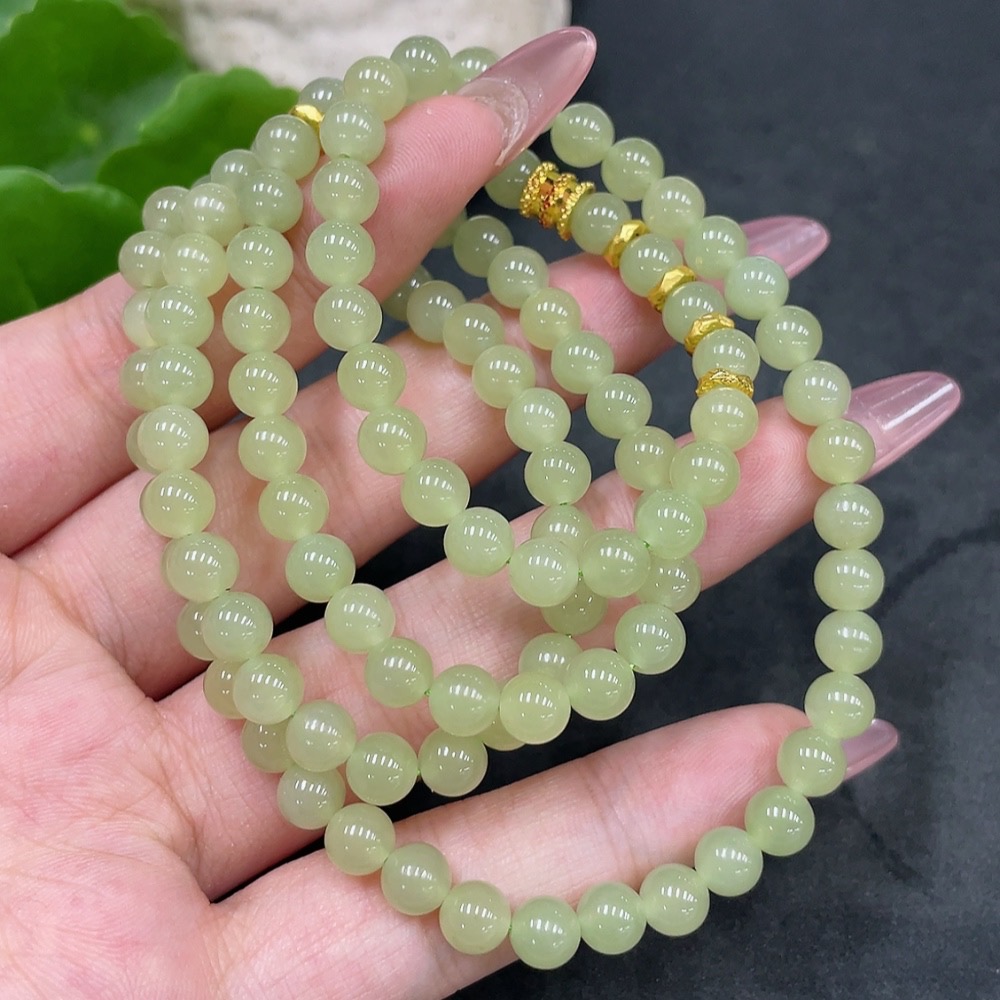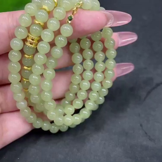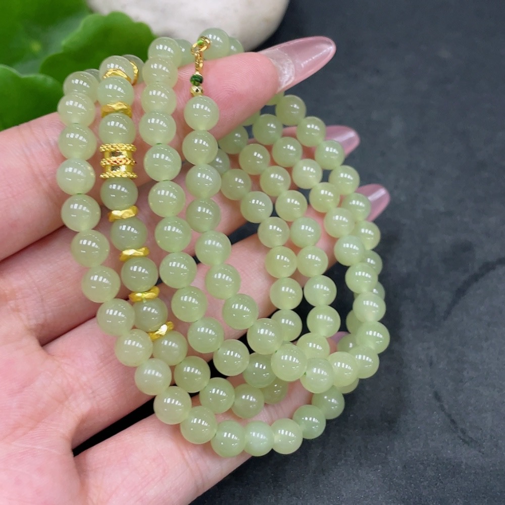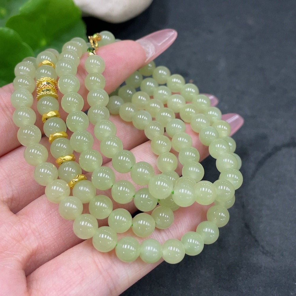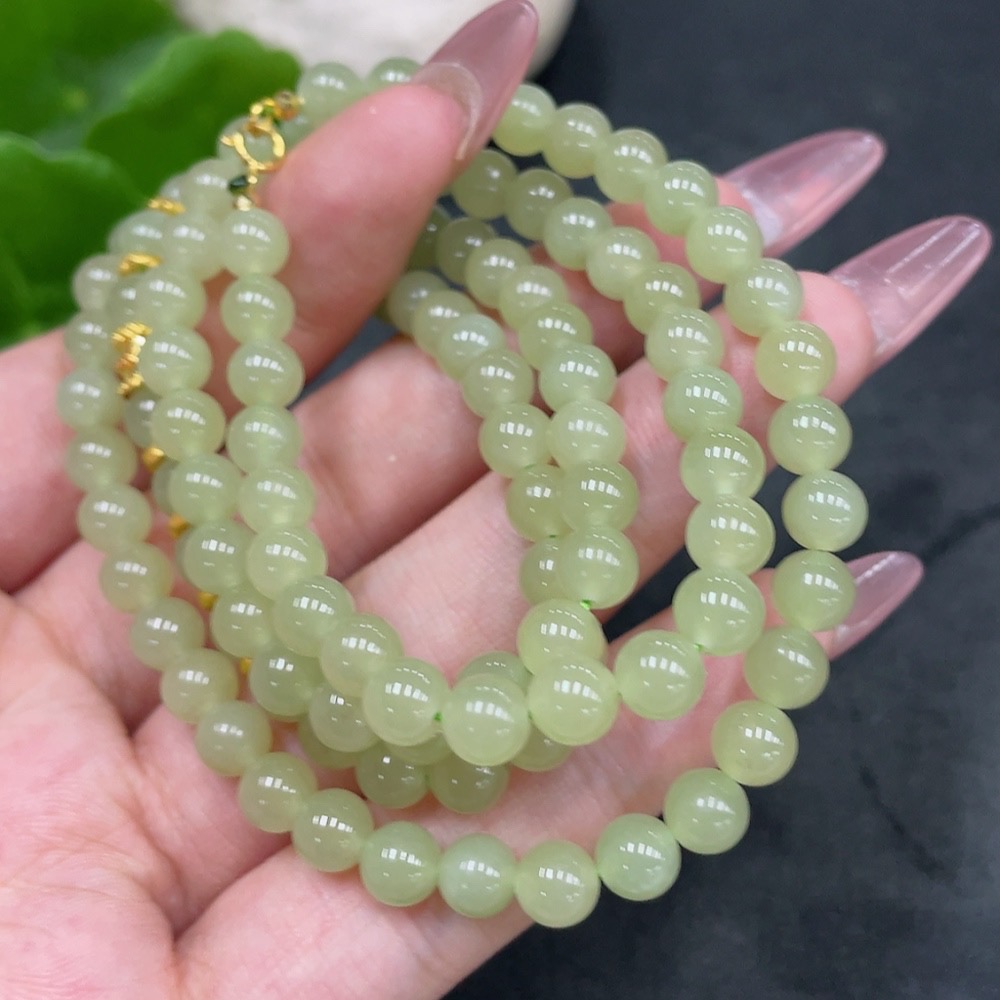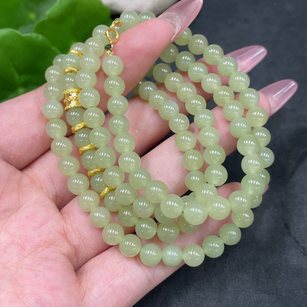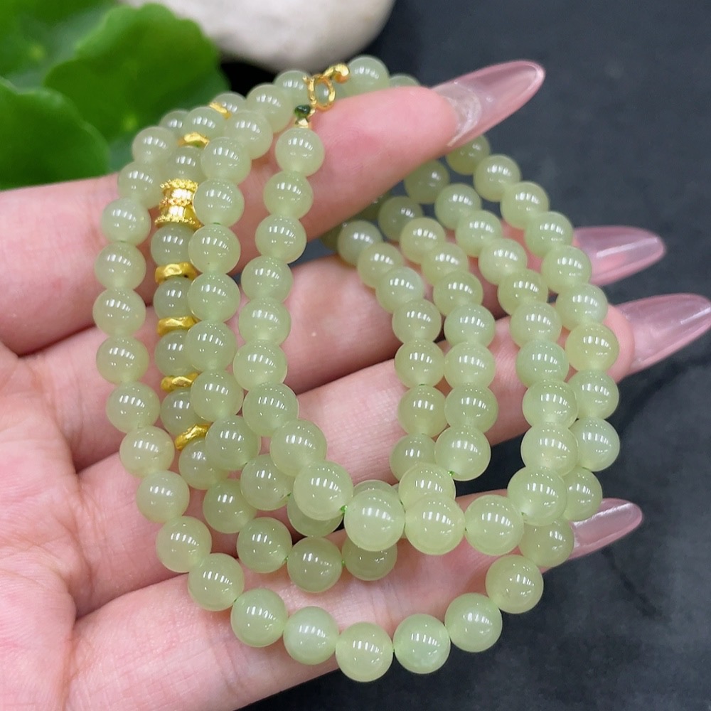 Hetian Jade Bead Necklace, Approx. 5.7mm, Total Weight About 34.7g, Small Bead Clasp 18k Gold, Marked Red Gold Content 99%, Others Unmarked Surface Tested Gold Content 97%
