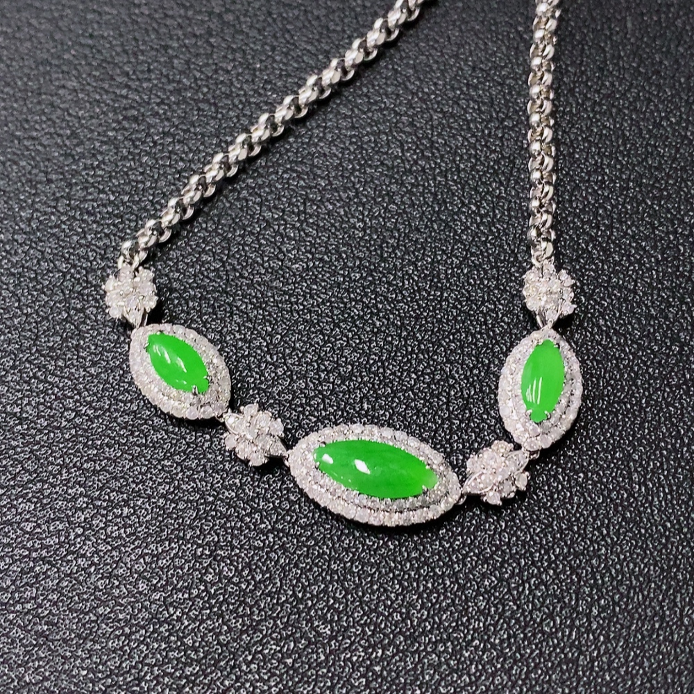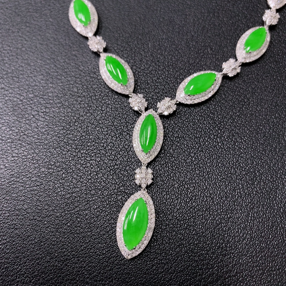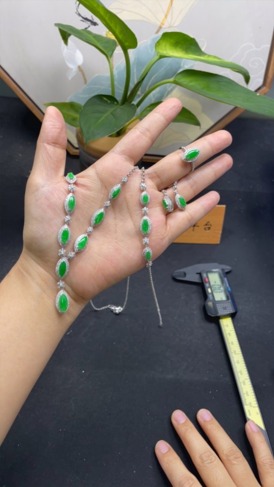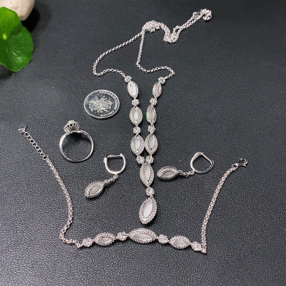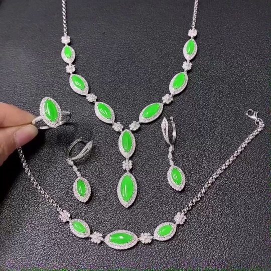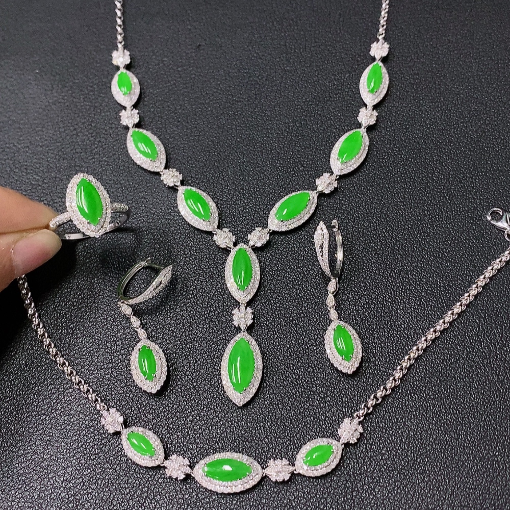 Jadeite Inlaid Jewelry Set (including necklace, bracelet, earrings, ring) 18k with diamond accents, total weight approx. 23.5g (full set)