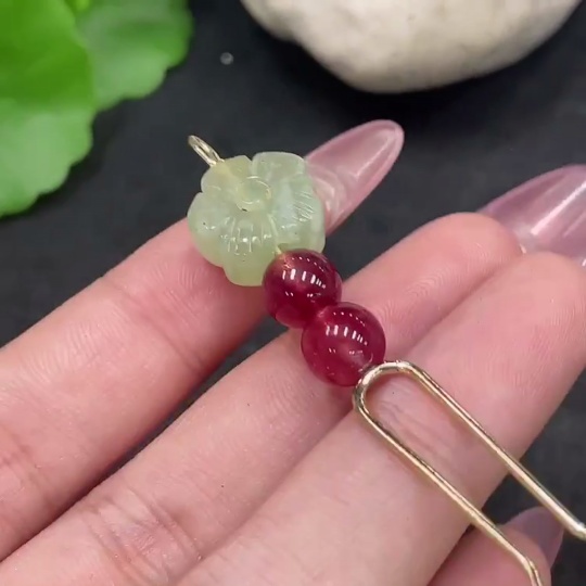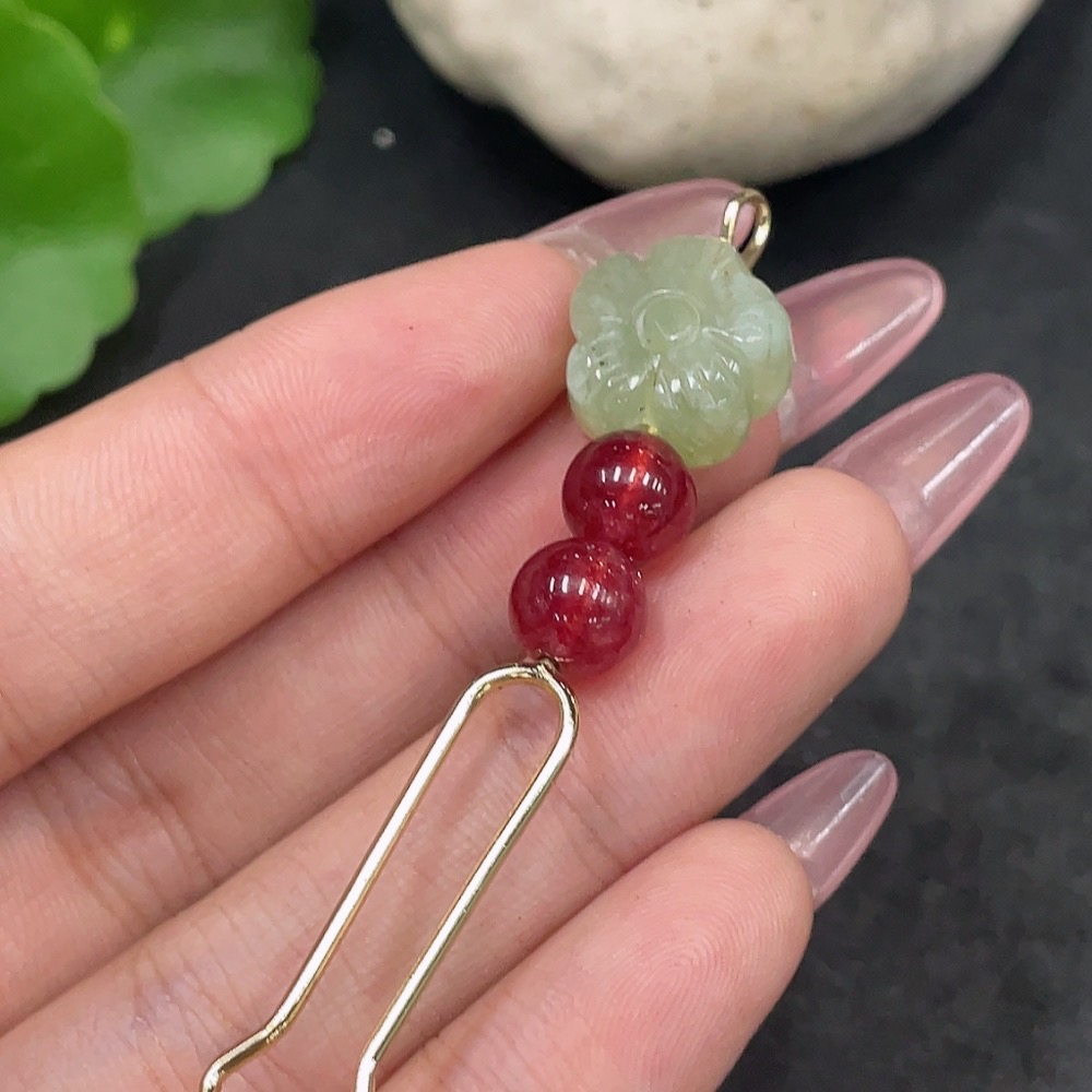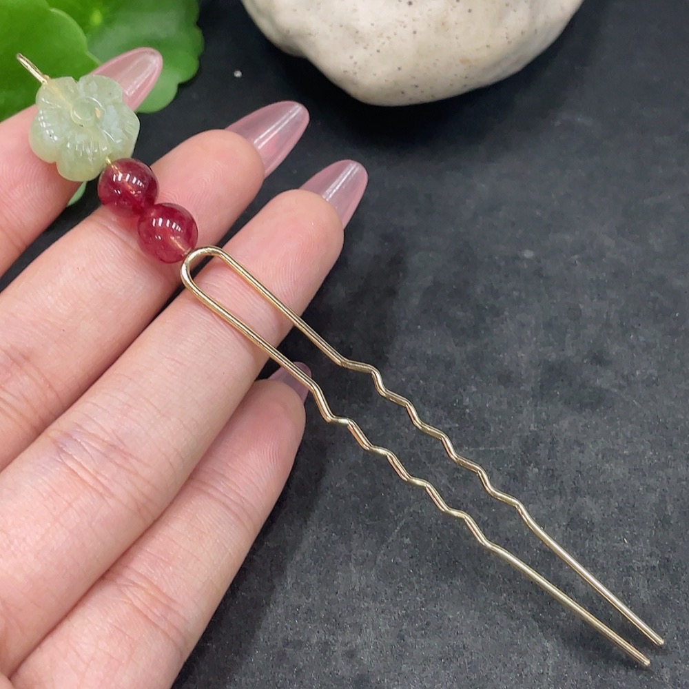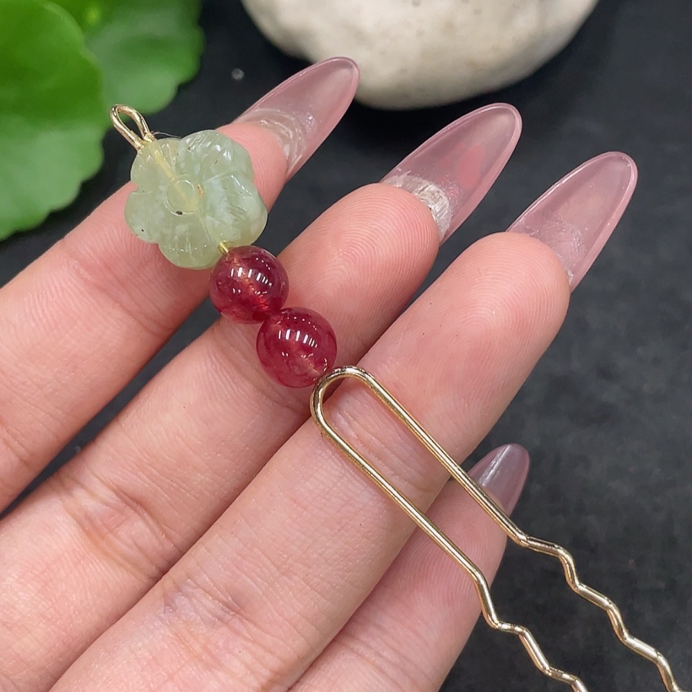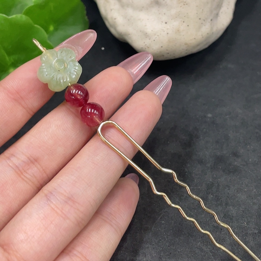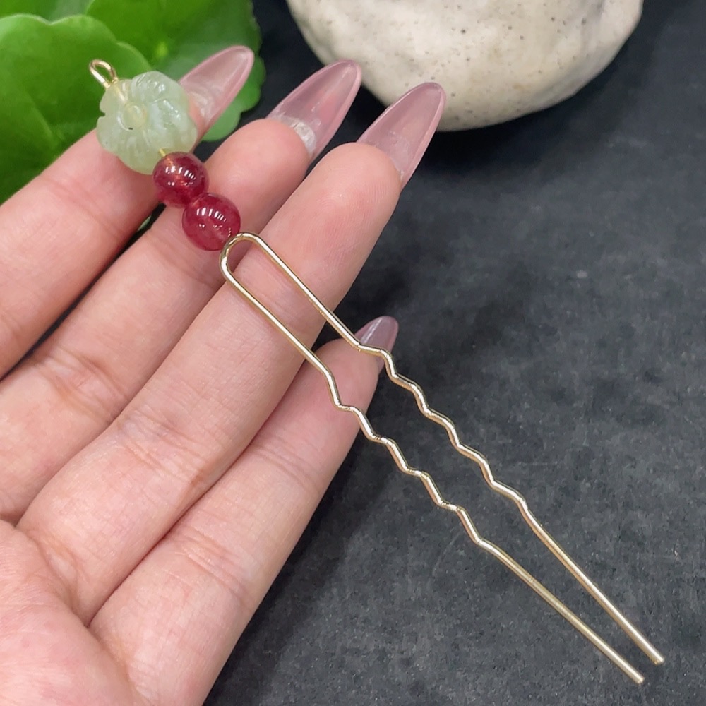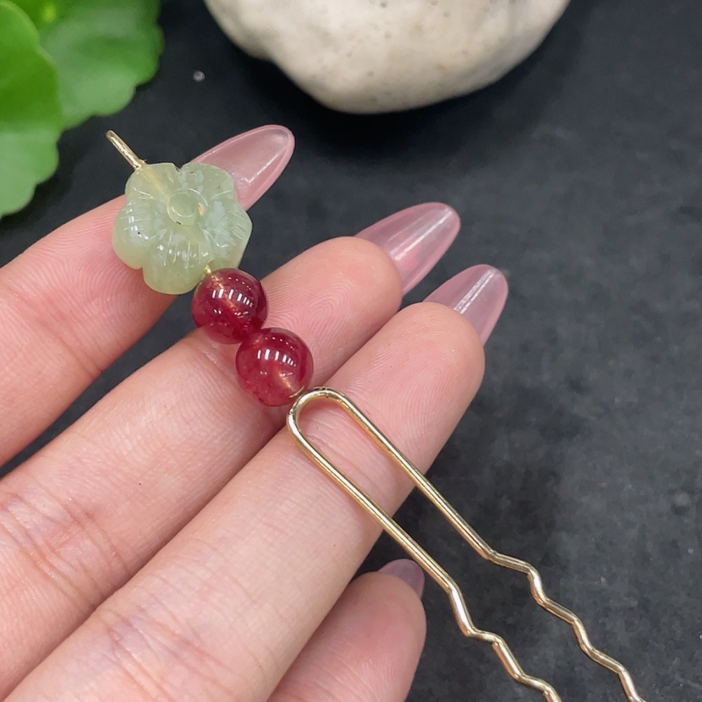 Xiuyan jade (serpentine jade) inlaid hairpin with beads (non-Hetian jade, non-gold), total weight approx. 4.8g
