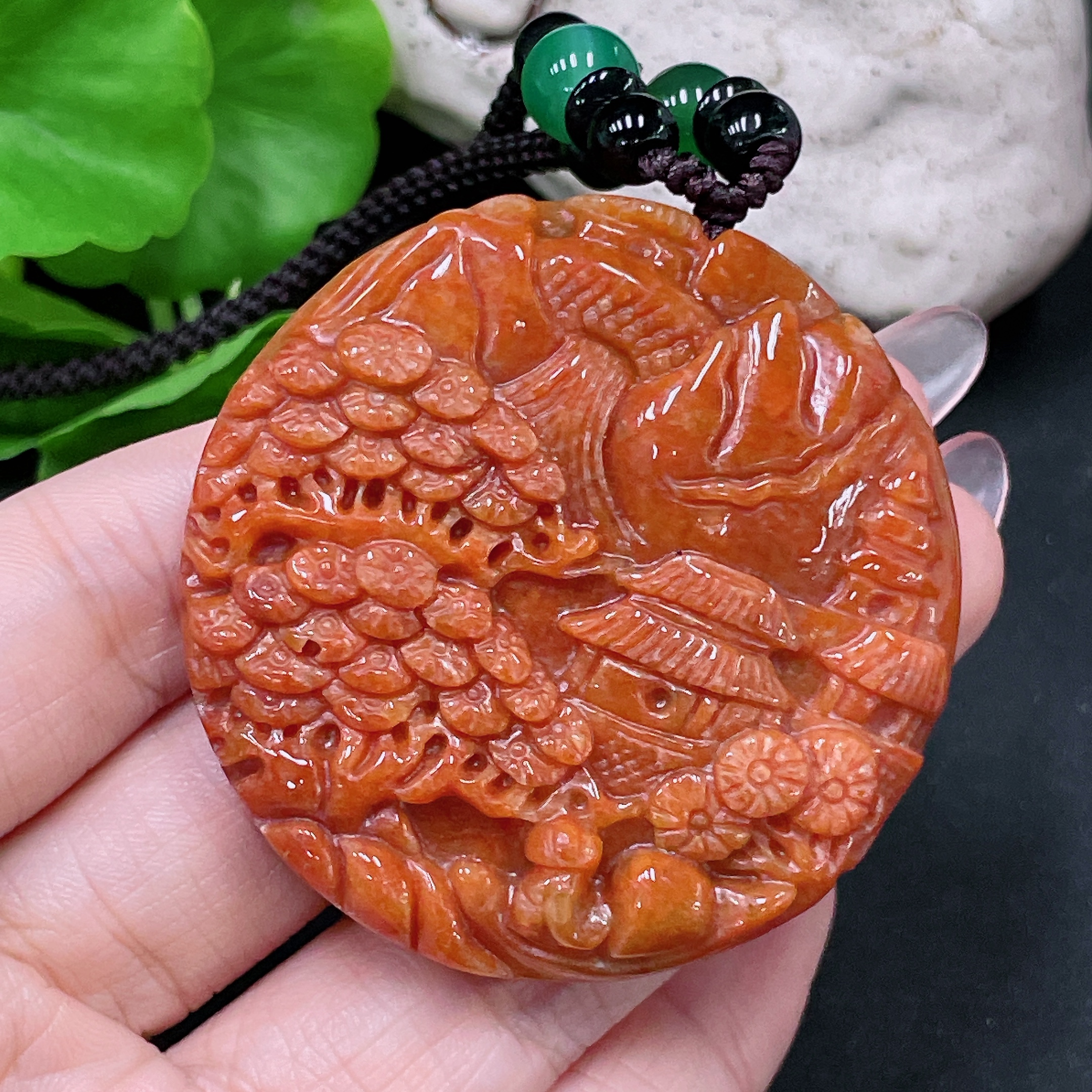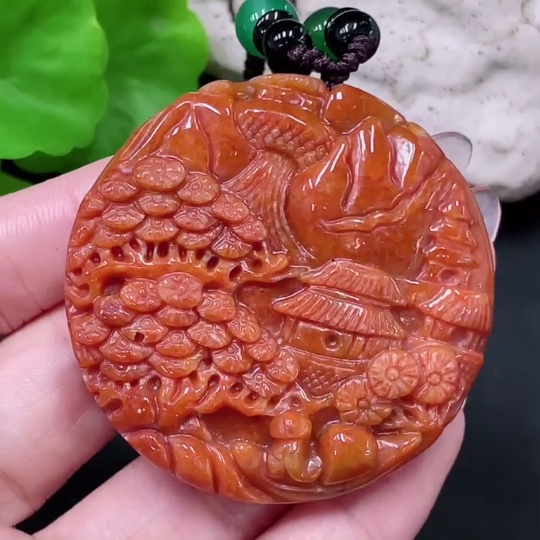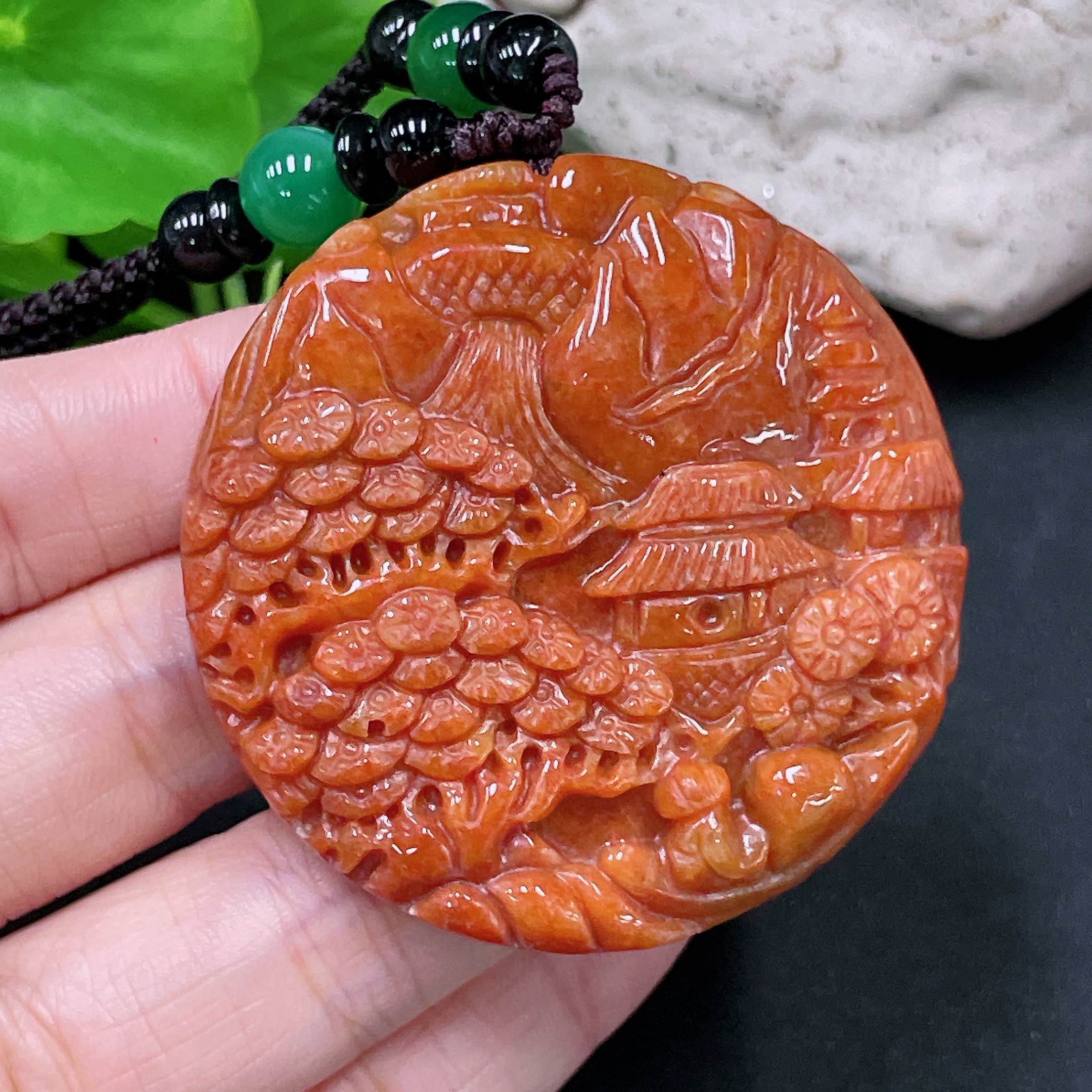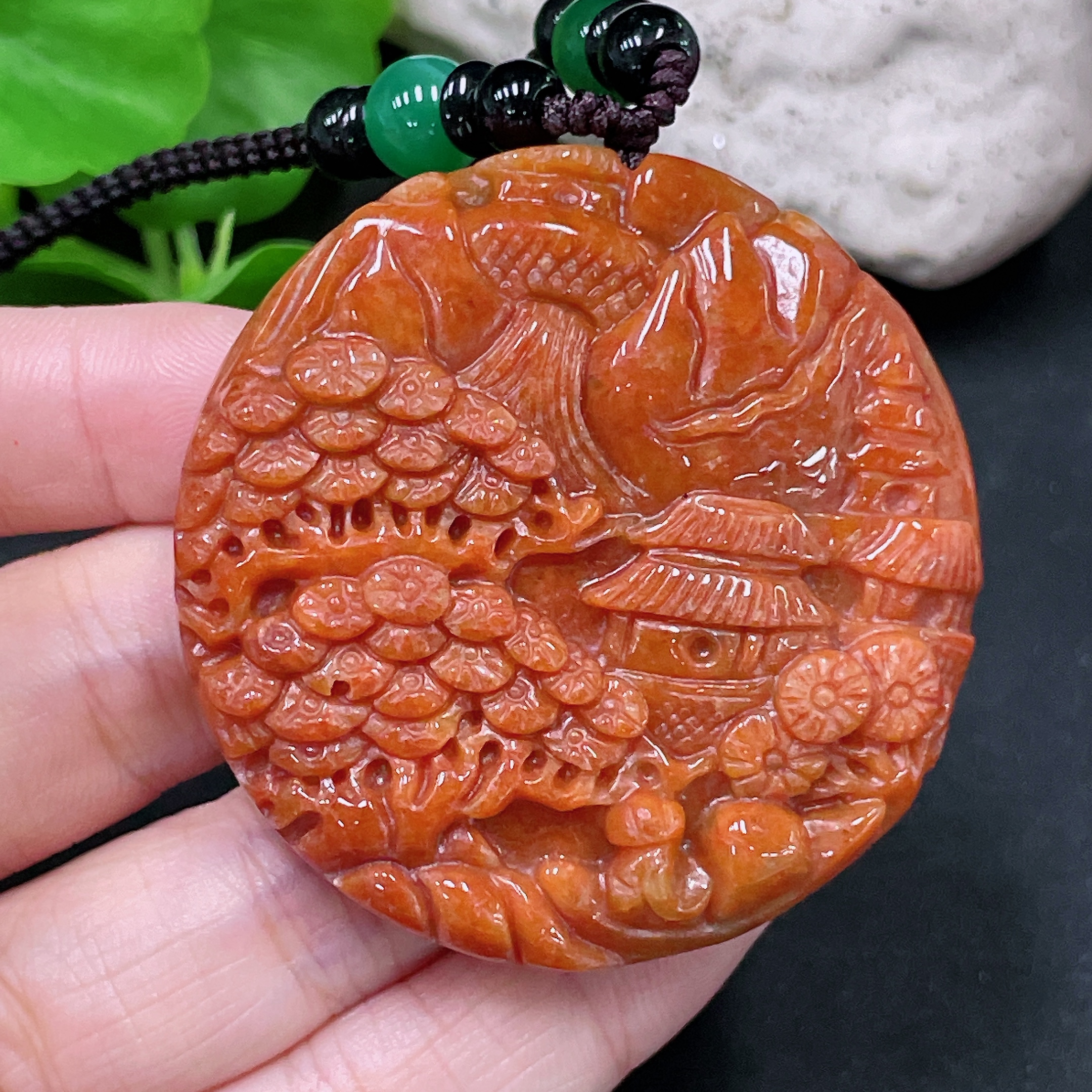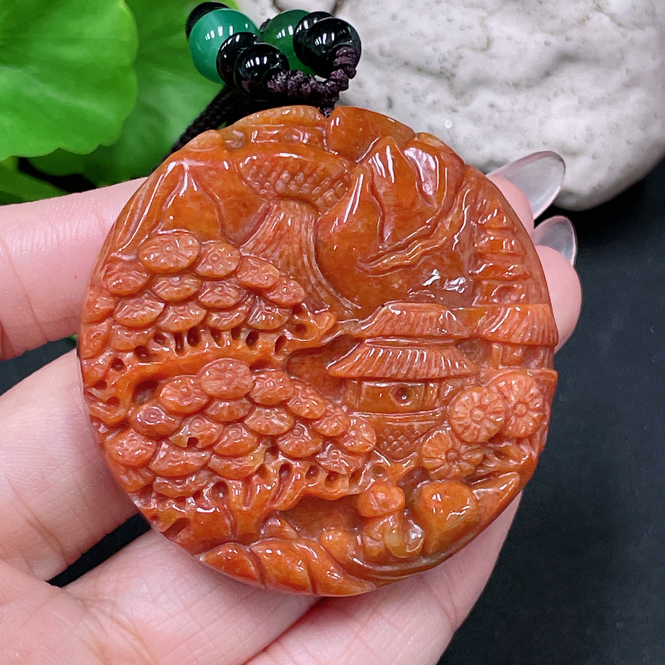 Jadeite landscape pendant with cord total weight approximately 70.2g (accompanying beads non-A) (red color origin undetermined)