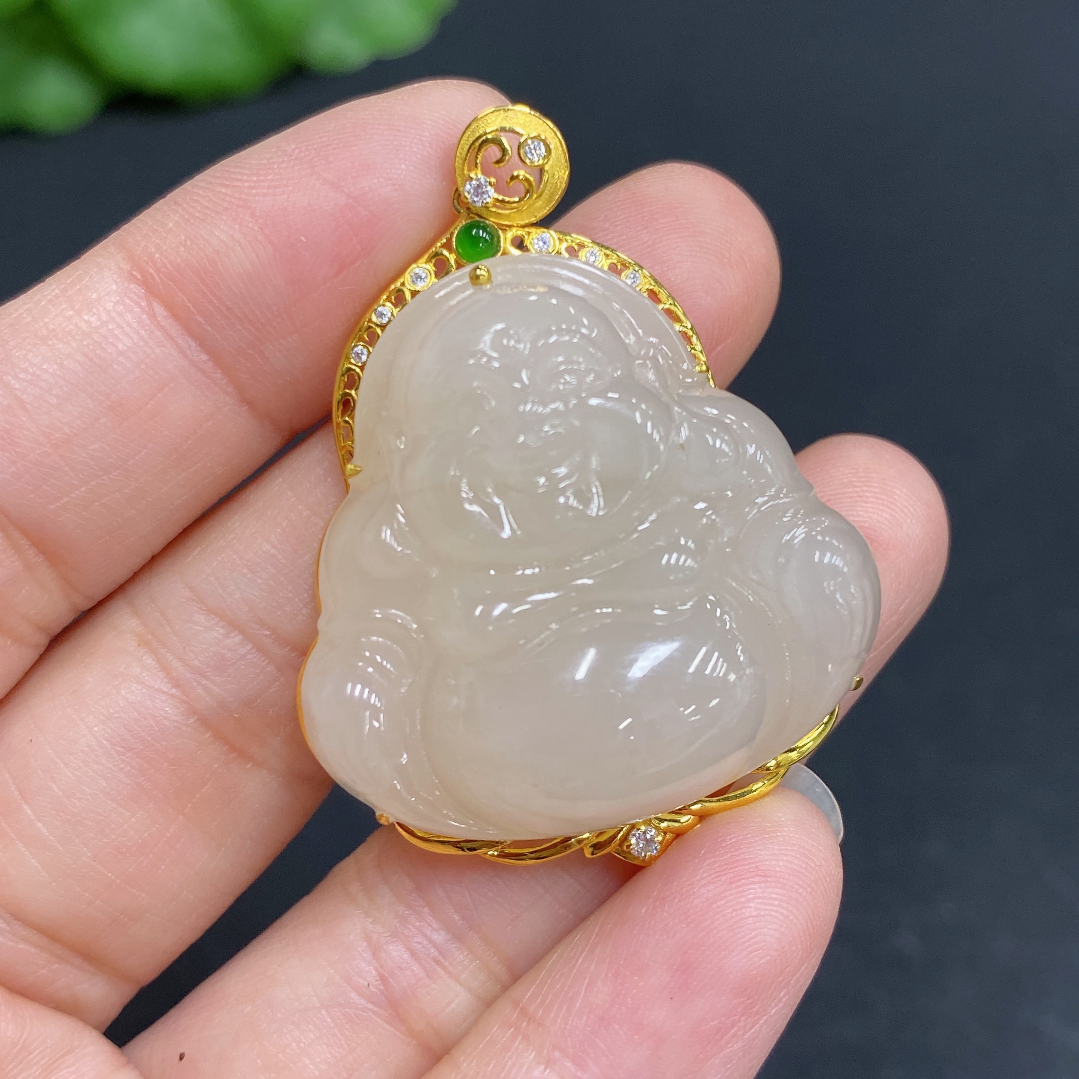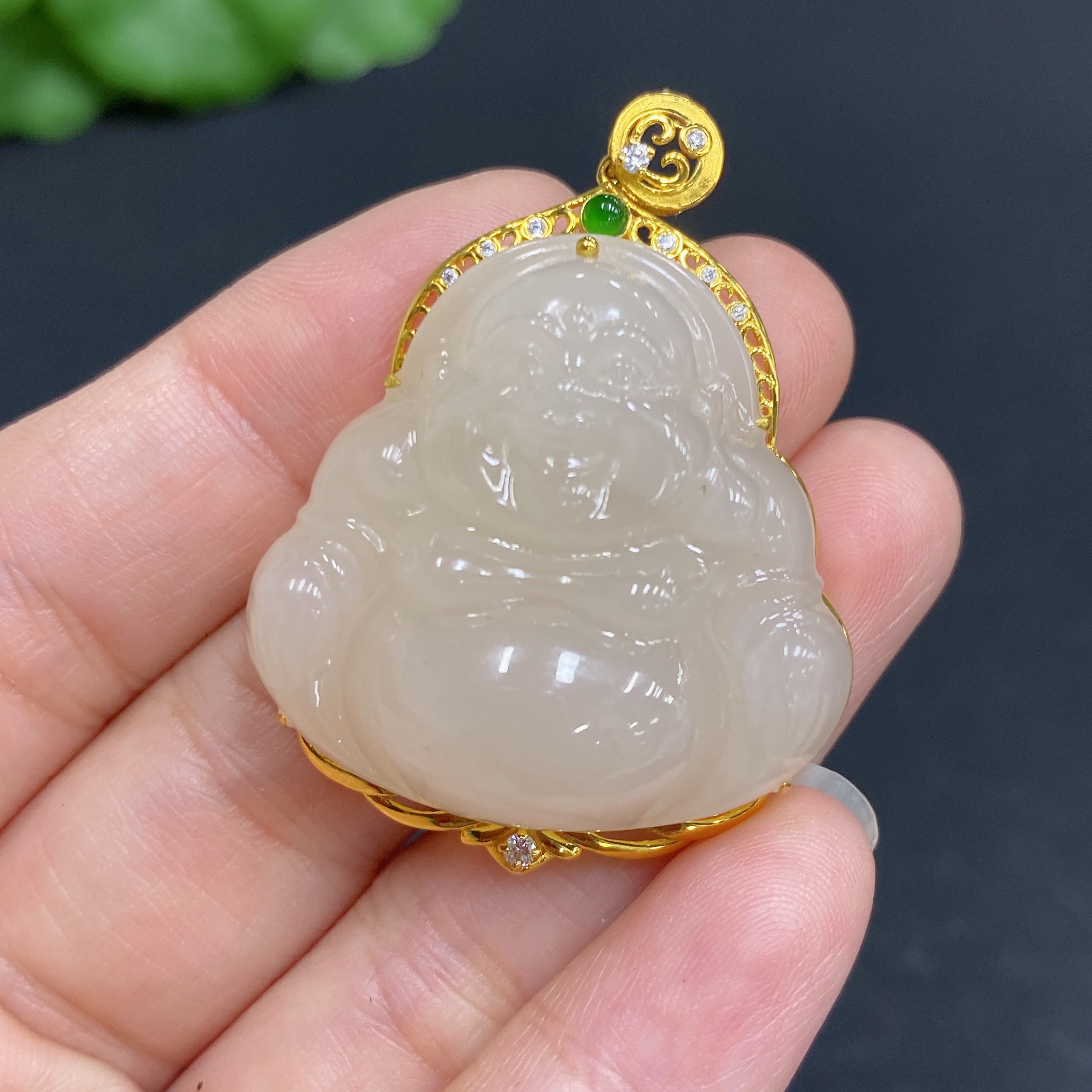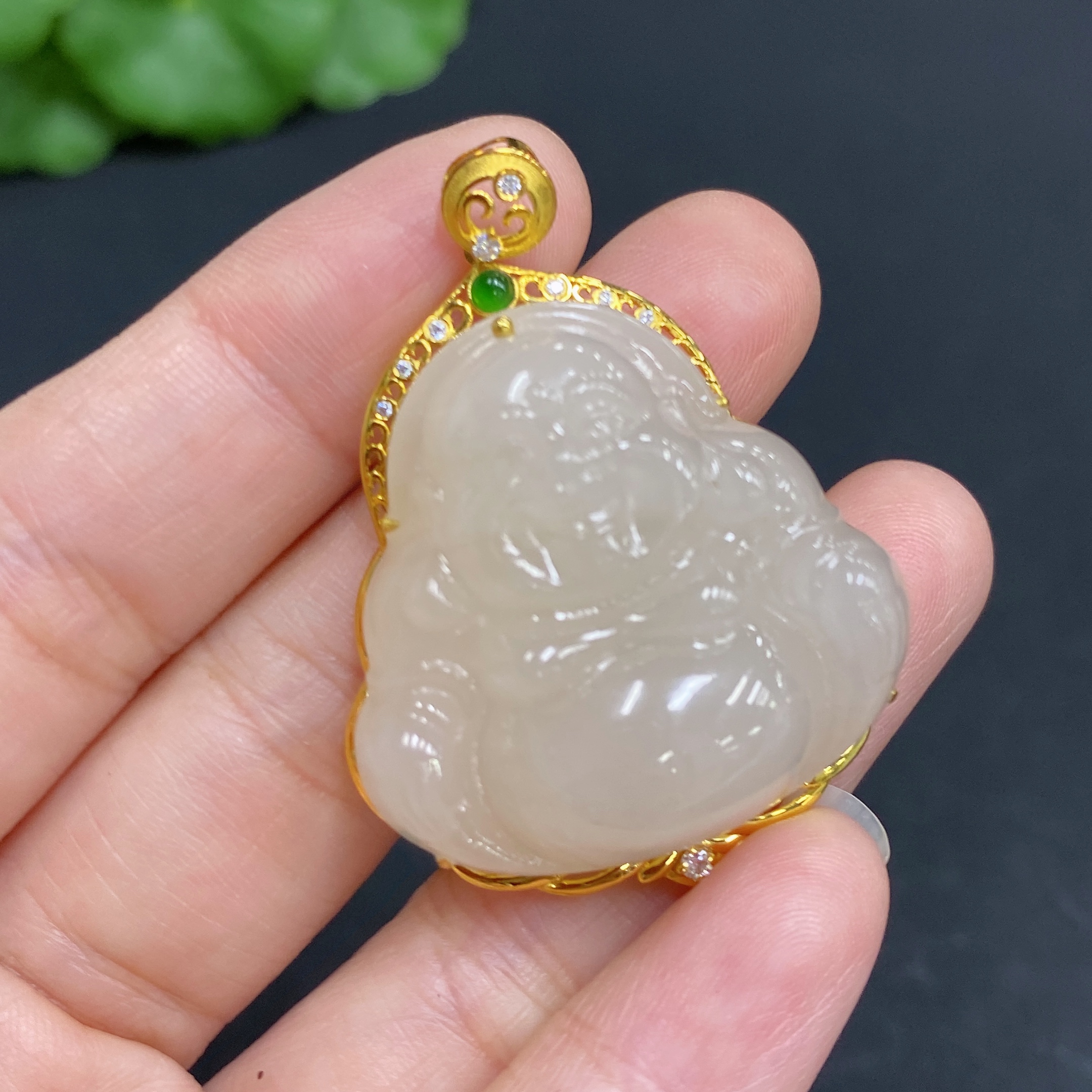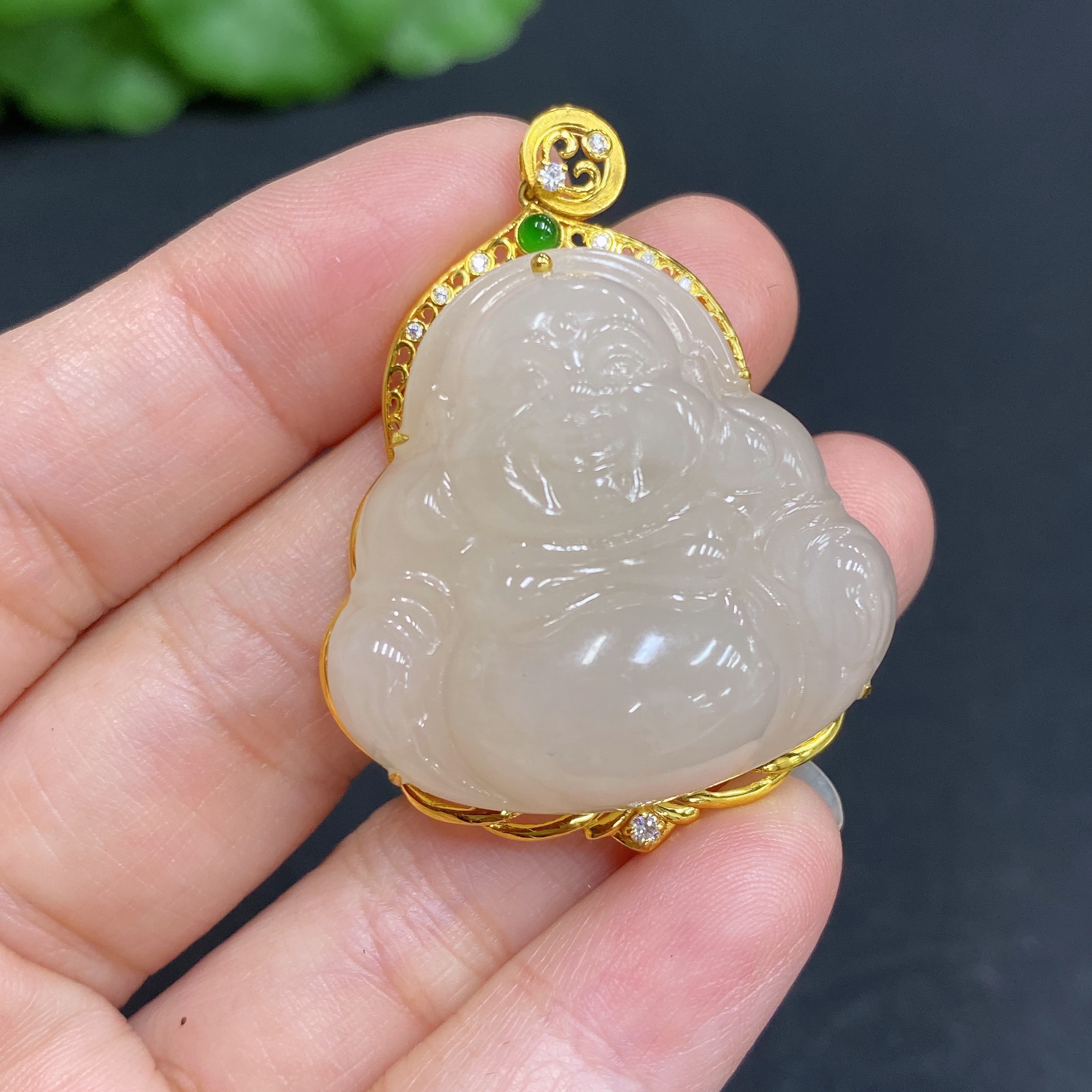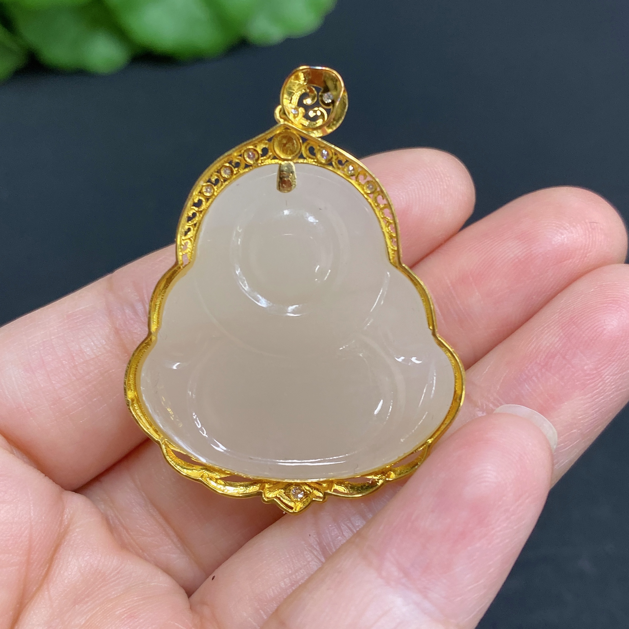 Hetian Jade Inlaid Buddha Pendant, 18K Gold, Total Weight Approx. 14.5g
