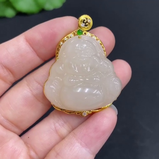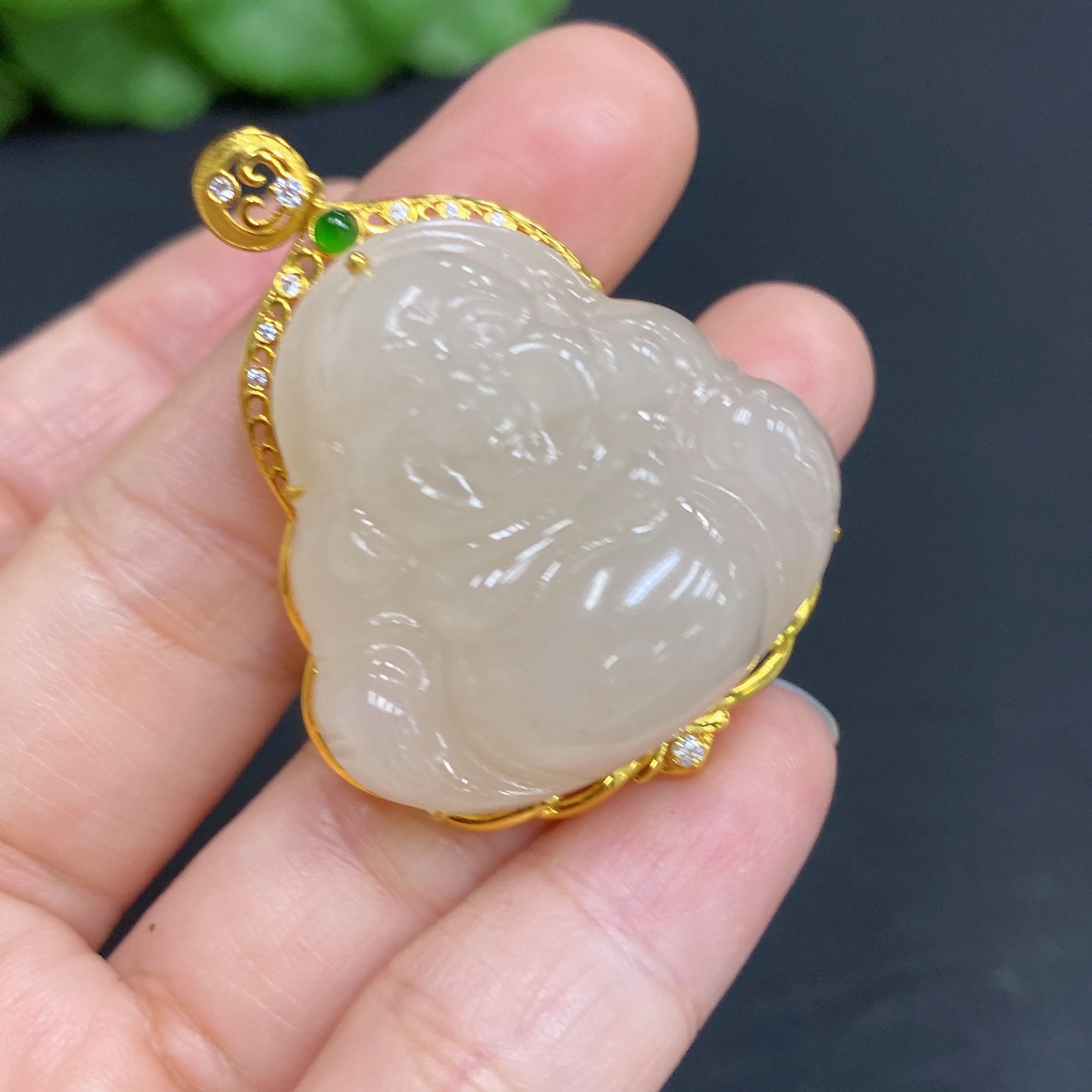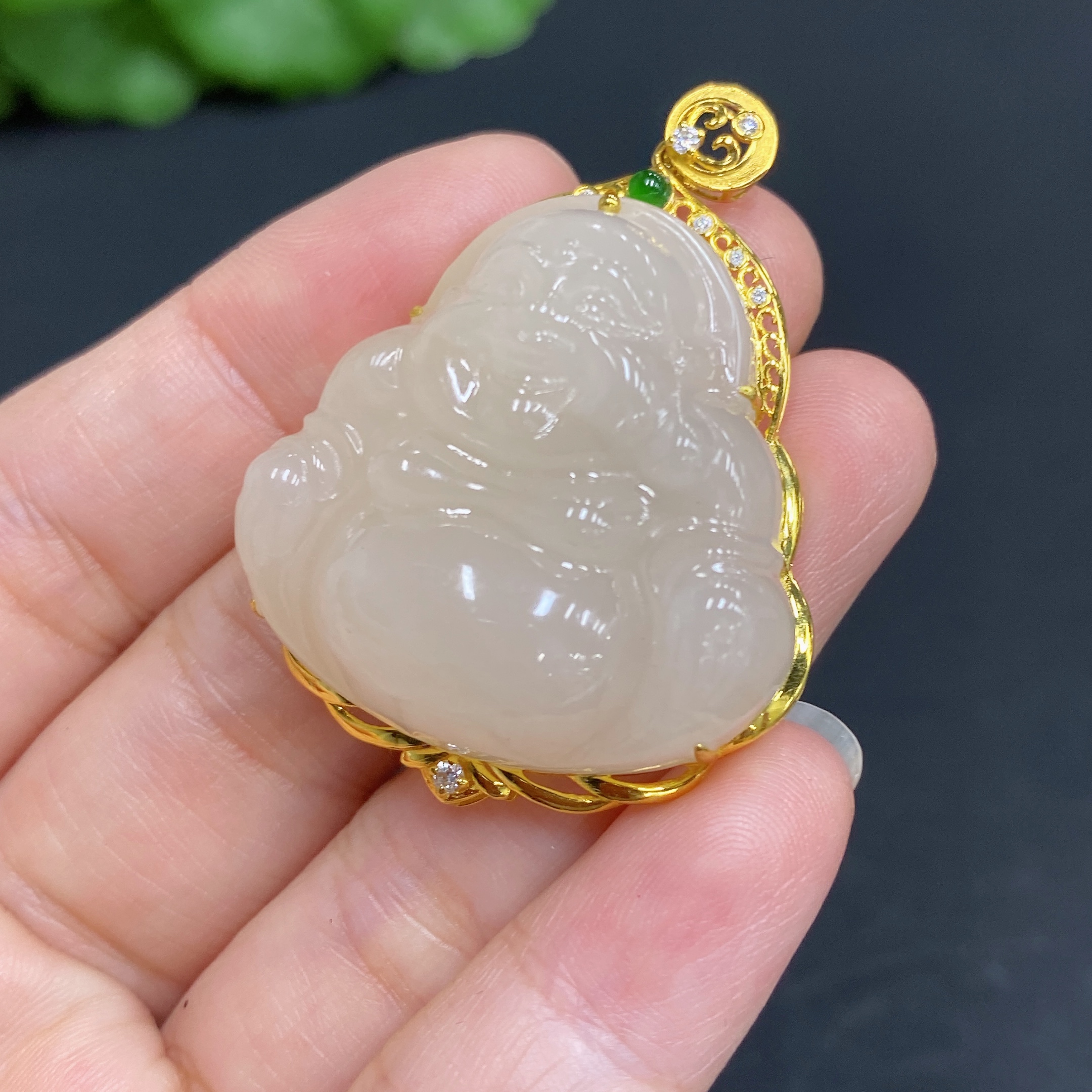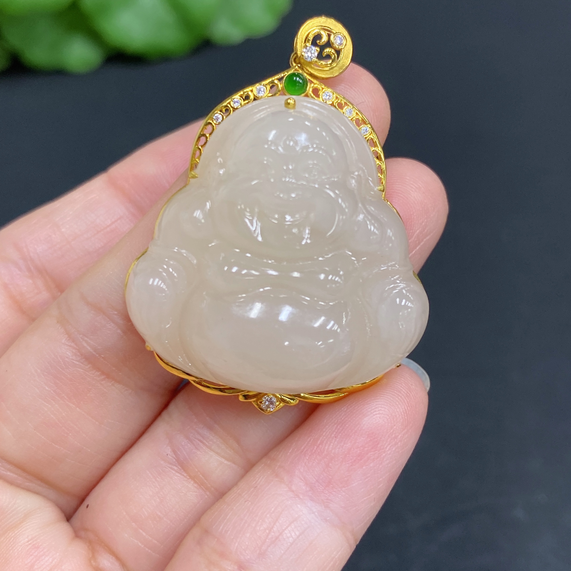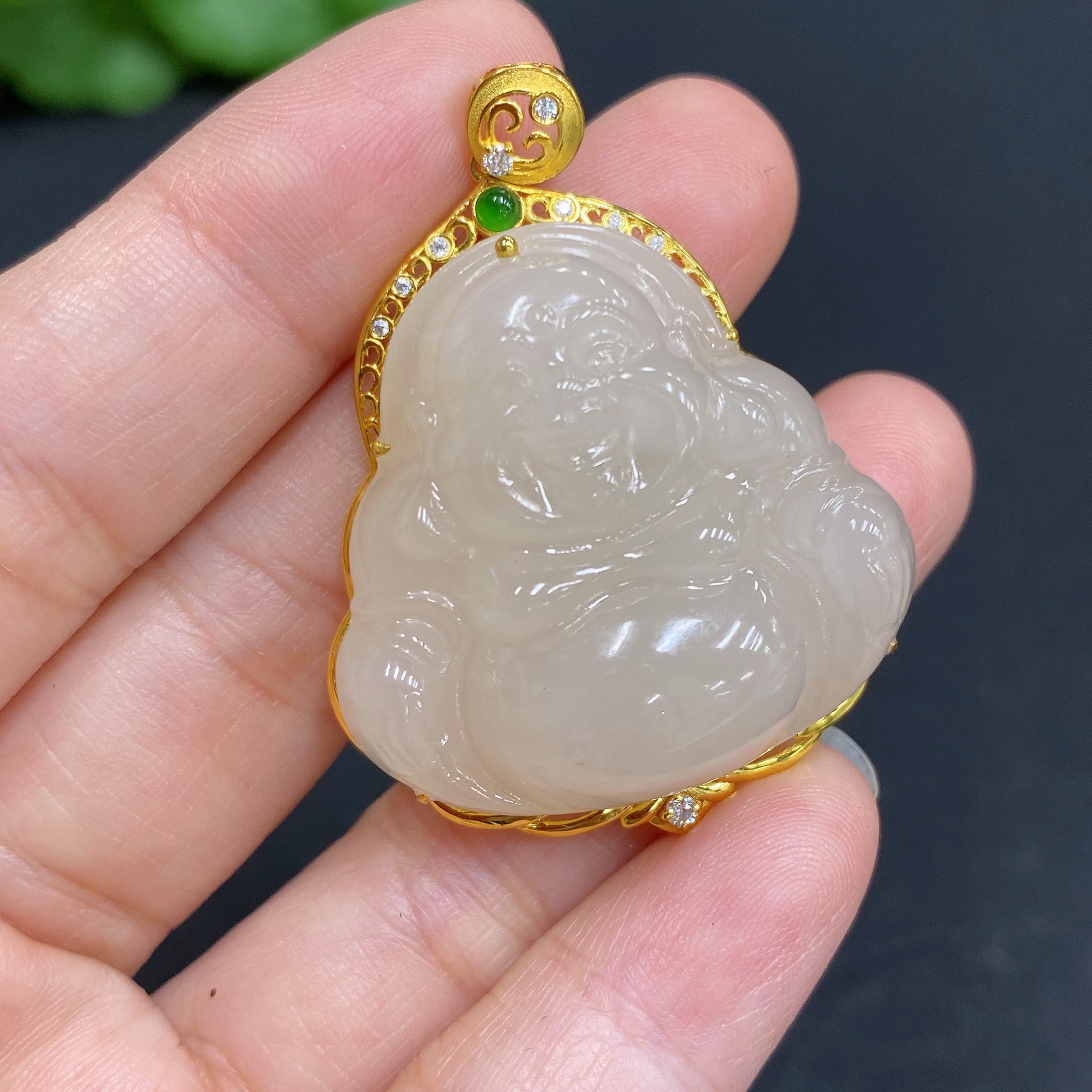 Hetian Jade Inlaid Buddha Pendant, 18K Gold, Total Weight Approx. 14.5g