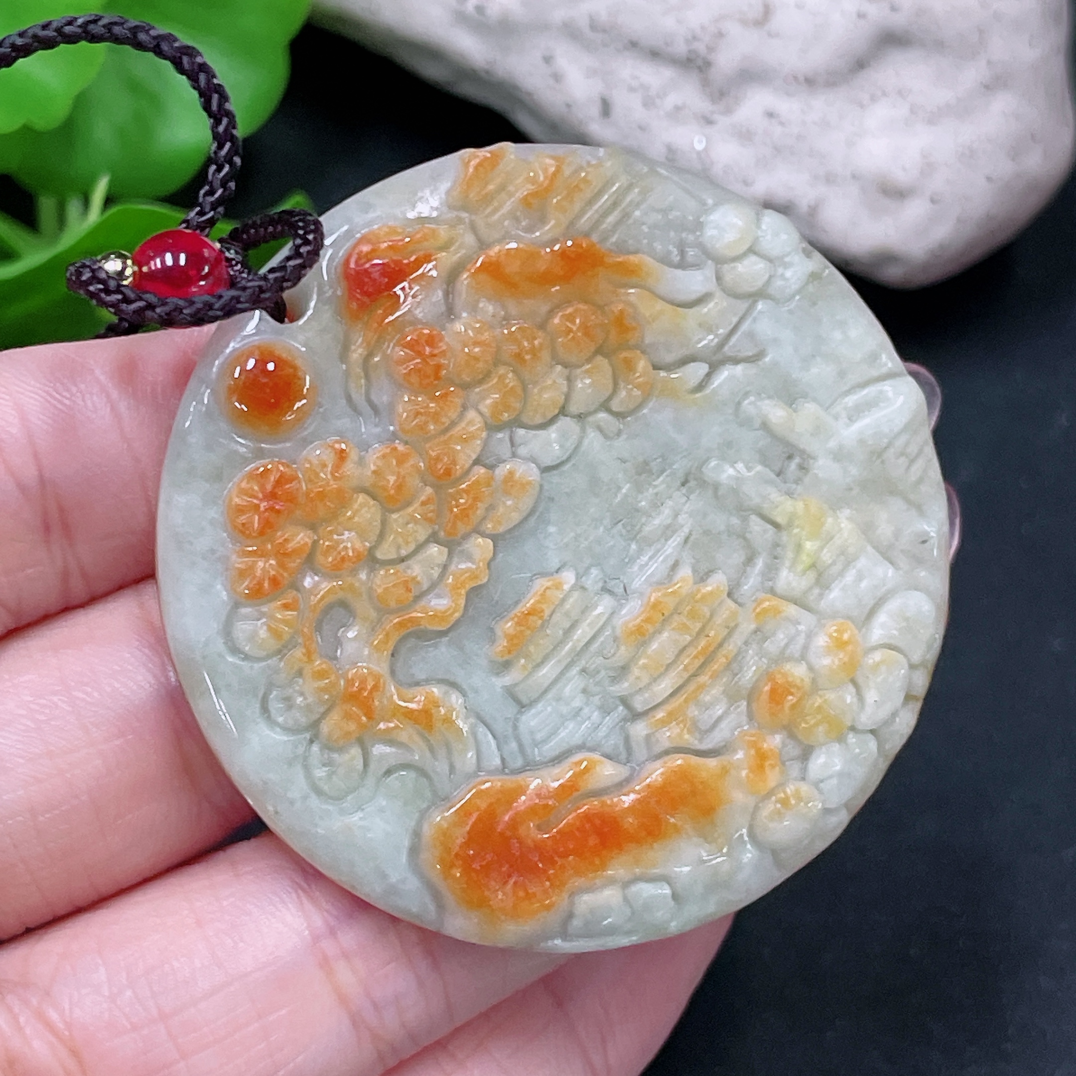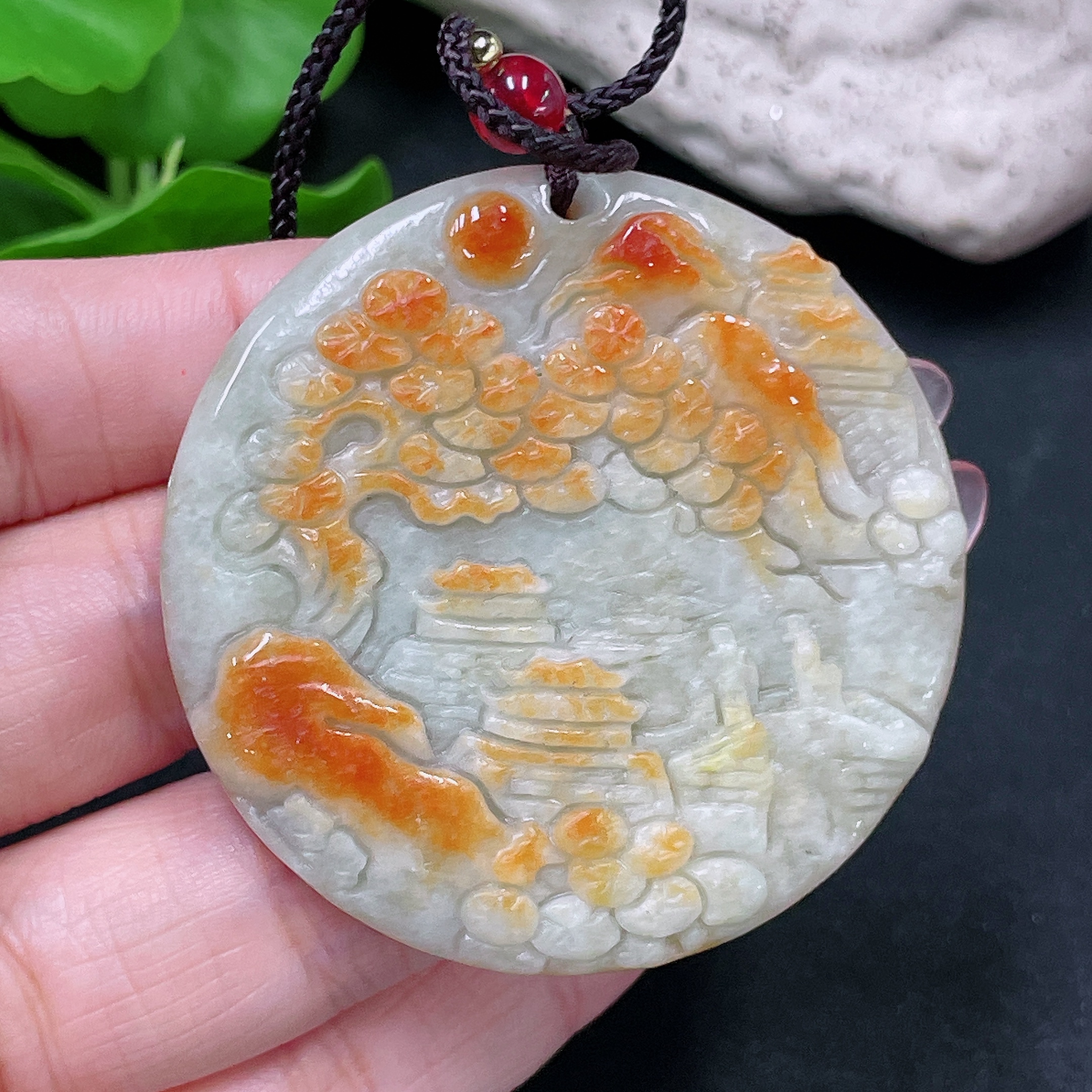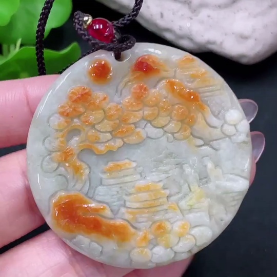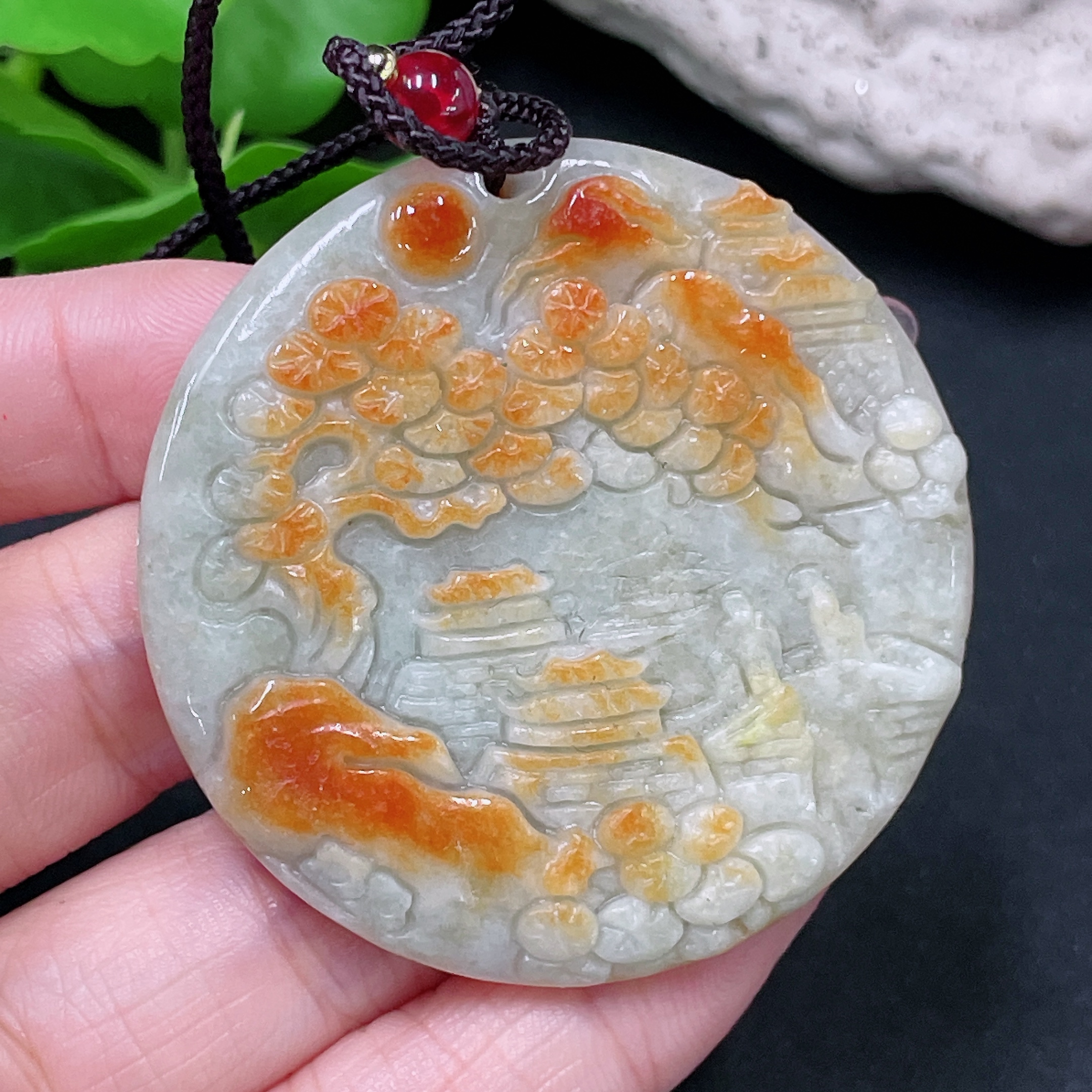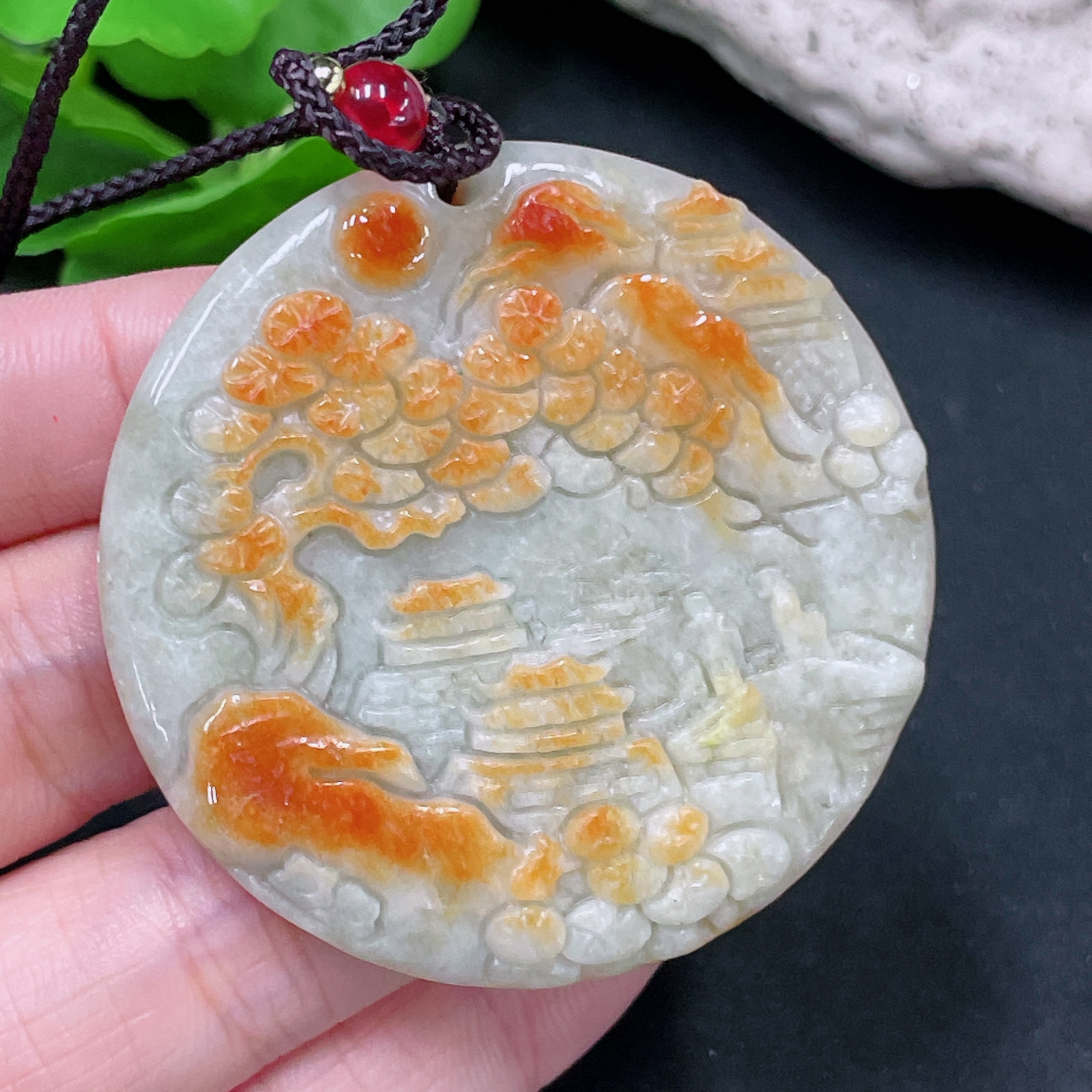 Jadeite landscape pendant with cord total weight about 37g (yellow color origin undetermined) (matching beads non-A)