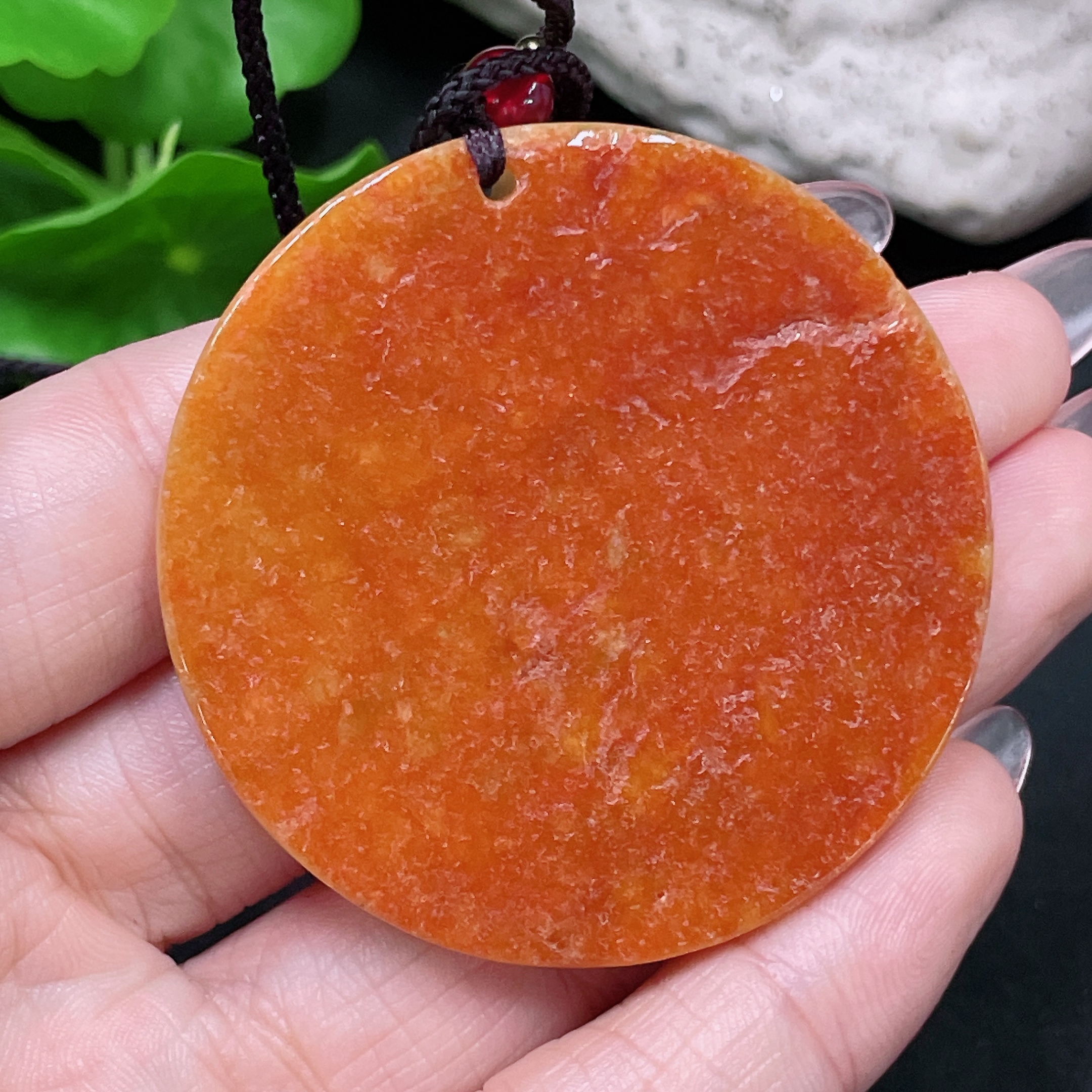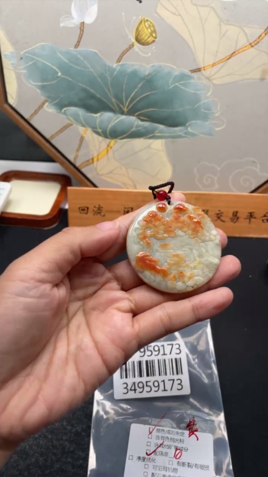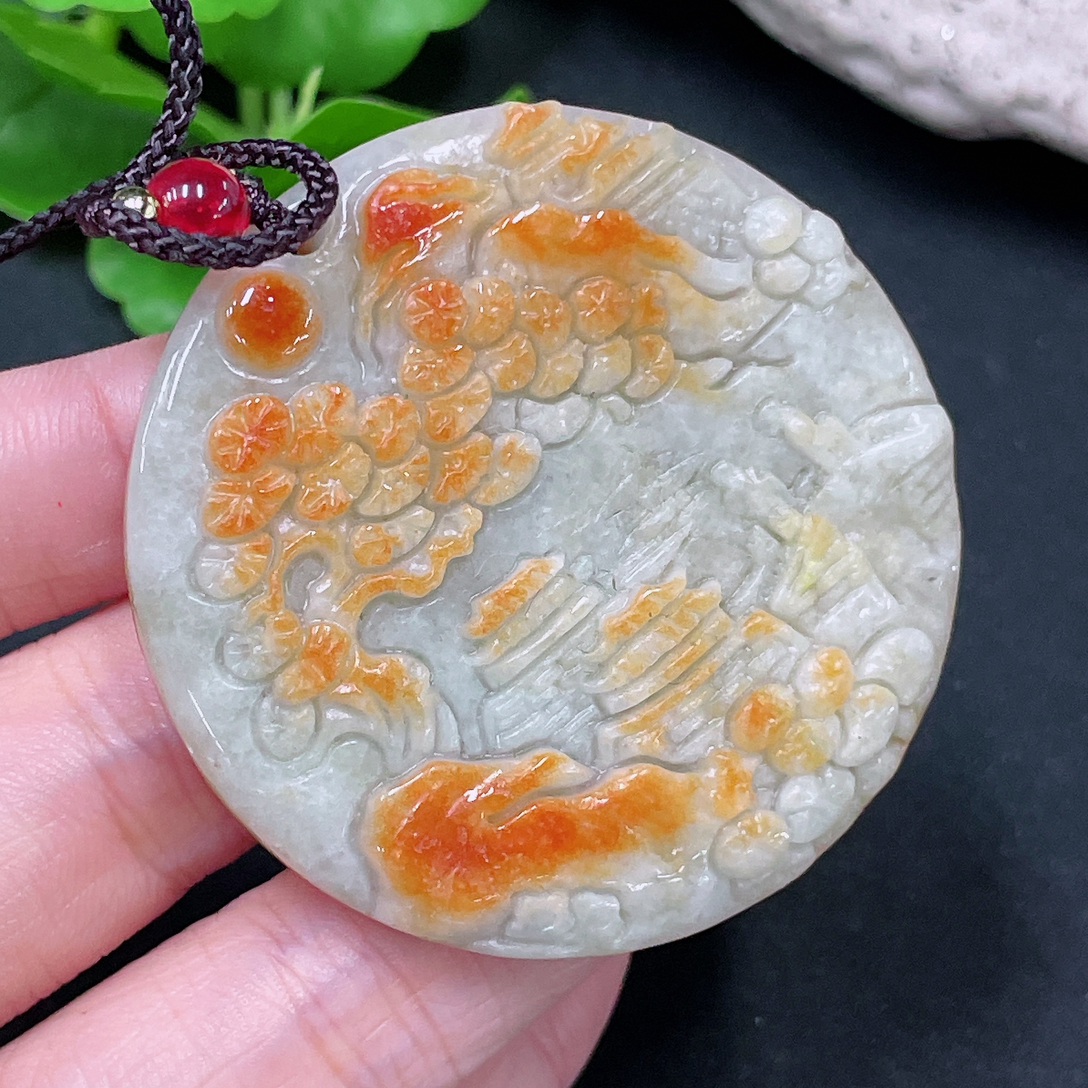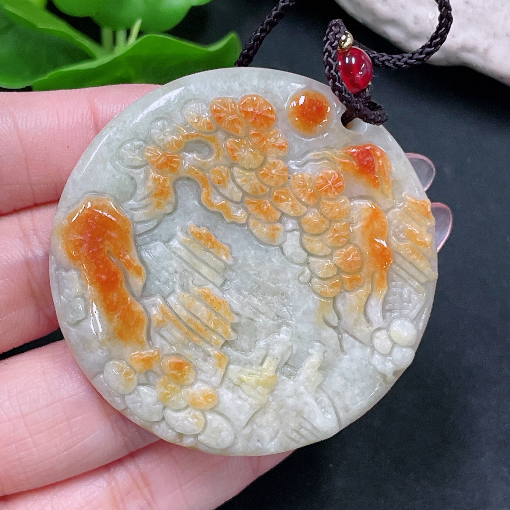 Jadeite landscape pendant with cord total weight about 37g (yellow color origin undetermined) (matching beads non-A)