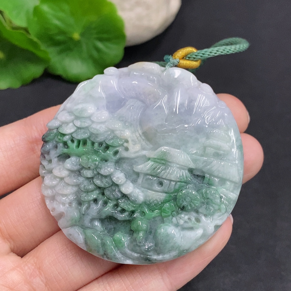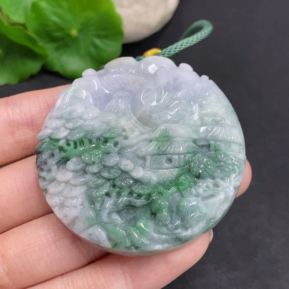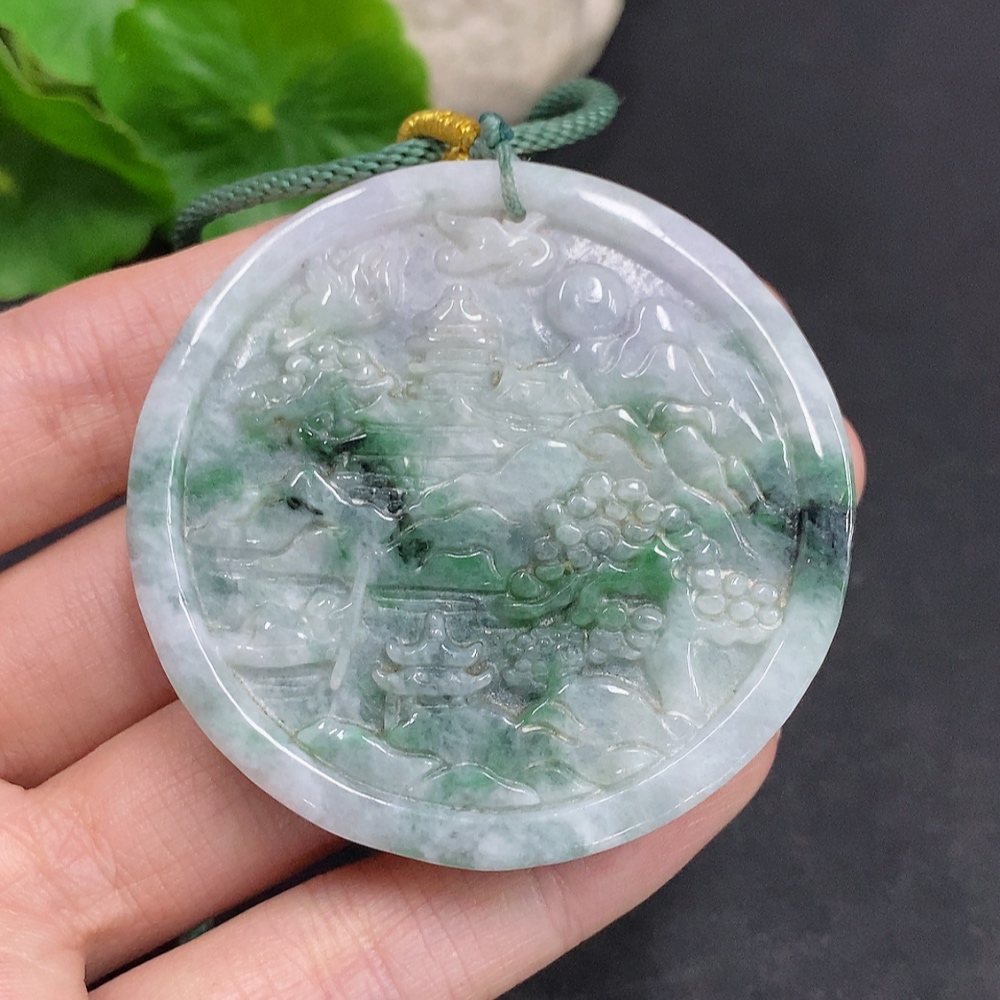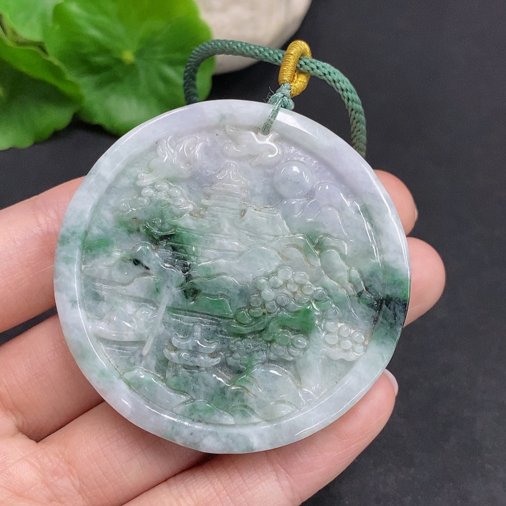 Jadeite Landscape Pendant with Cord Total Weight Approx. 60.4g (Including Other Mineral Components)